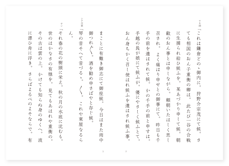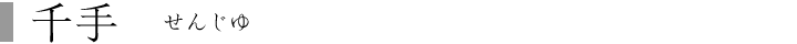禅竹作 ワキ 狩野介宗茂 シテ 千手 ツレ 中将重衡 地は 相模 季は 夏 ワキ詞「これは鎌倉どのゝ御内に。狩野介宗茂にて候。さても相国のおん子重衡の卿は。此たび一谷の合戦に生捕られ給ひ候ふを。某あづかり申して候。朝敵のおん事とは申しながら。頼朝いたはしく思し召され。よく痛はり申せとの御事にて。昨日も千手の前を遣はされて候。かの千手の前と申すは。手越の長が娘にて候ふが。優にやさしく候ふとて。おん身ちかく召し使はれ候ふを遣はされ候ふ事。まことに有難き御志にて御座候。今日はまた雨中御つれ〴〵。酒を勧め申さばやと存じ候。 シテ次第「琴の音そへて音づるゝ。〳〵。これや東屋なるらん。 サシ「それ春の花の樹頭に栄え。秋の月の水底に沈むも。世のはかなさの有様を。見てもあはれや重衡の。その古は雲の上。かけても知らぬ身のゆくへ。波に漂ひ舟に浮き。さらばよるべのよそならで。有りしにかへる有様かな。 下歌「都にだにも留めぬ。御涙なるを痛はしや。 上歌「陸奥の。忍ぶに堪へぬ雨の音。〳〵。降りすさびたる折しもは。思ひの露もちり〴〵に。心の花もしを〳〵と。しをるゝ袖の色までも。今日の夕べのたぐひかな。〳〵。 シテ詞「いかに案内申し候はん。 ワキ詞「誰にて渡り候ふぞ。 シテ「千手の前が参りたるよしそれ〳〵御申し候へ。 ワキ「暫く御待ち候へ。御機嫌を以て申さうずるにて候。 重衡サシ「身はこれ槿花一日の栄。命は蜉蝣の定めなきに似たり。心は蘇武が胡国に囚はれ。岩窟の内に籠められて。君辺を忘れぬ志。それはやうりが謀にて。敵を亡ぼし旧里に帰る。我はいつとなく敵陣に籠められて。縲絏の責を受くる。知らず今日もや限ならん。あら定めなや候。 ワキ詞「いかに申し上げ候。千手の御参りにて候。 重衡詞「唯今は何のためにて候ふぞ。よし〳〵何事にてもあれ。今日の対面は叶ふまじきと申し候へ。 ワキ「畏つて候。いかに申し候。御参りの由申して候へば。何と思し召し候ふやらん。今日の御対面は叶ふまじきよし仰せ出だされて候。 シテ「これも私にあらず。頼朝よりの御諚にて。琵琶琴持たせて参りたり。此由かさねて御申し候へ。 ワキ「御諚の趣申して候へば。これも私にあらず。頼朝よりの御諚にて。琵琶琴持たせて参りたり。よし〳〵御憚はさる事なれども。たゞこなたへと請ずれば。 シテ「その時千手立ちよりて。 地「妻戸をきりゝと押し開く。御簾の追風にほひ来る。花の都人に。恥かしながら見々えん。げにや東の果しまで。人の心の奥深き。その情こそ都なれ。花の春紅葉の秋。たが思出となりぬらん。 重衡詞「いかに千手の前。昨日あからさまに申しつる出家の御暇の事聞かまほしうこそ候へ。 シテ詞「さん候其由申して候へば。朝敵の御事なるを私として。出家を許し申さん事。思ひも寄らずとこそ候ひつれ。わらはも御心の内おしはかり参らせて。いかほど細々と申して候へども。かひなき出家の御望み。痛はしうこそ候へ。 重衡「くちをしや我一谷にて如何にもなるべき身の生捕られ。今は東の果までも。かやうに面をさらす事。前世の報いといひながら。又おもはずも父命により。仏像を亡ぼし人寿を絶ちし。現当の罪を果すこと。前業よりなほ恥かしうこそ候へ。 シテ「げに〳〵是は御理りさりながら。かゝる例は古今に。多き習ひと聞くものを。独とな歎き給ひそとよ。 重衡「げによく慰め給へども。たぐひはあらじ憂き身の果。 シテ「昨日は都の花と栄え。 重衡「今日は東の春に来て。 シテ「移り変れる。 重衡「身のほどを。 地「思へたゞ。世は空蟬の唐衣。〳〵。着つゝなれにし妻しある。都の雲井を立ち離れ。はる〴〵来ぬる。旅をしぞ思ふ衰への。憂き身のはてぞ悲しき。水ゆく川の八橋や。蜘蛛手に物を思へとは。かけぬ情の中々に。馴るゝや恨みなるらん。〳〵。 ワキ「今日の雨中の夕べの空。御つれ〴〵を慰めんと。樽を抱きて参りつゝ。既に酒宴を始めんとす。 シテ「千手も此よし見るよりも。お酌に立ちて重衡の。御前にこそ参りけれ。 重衡「今はいつしか憚の。心ならずに思はずも。手まづ遮る盃の。心一つに思ふ思ひ。 ワキ「それ〳〵いかに何にても。おん肴にと進むれば。 シテ「その時千手とりあへず。羅綺の重衣たる。情なき事を機婦に妬む。 三人「只今詠じ給ふ朗詠は。忝くも北野の御作。此詩を詠ぜば聞く人までも。守るべしとのおん誓なり。 重衡「さりながら重衡は。今生の望なし。 三人「たゞ来世の便こそ。聞かまほしけれと宣へば。 シテ「わらは仰せを承り。十悪といふとも引摂すと。 地「朗詠してぞ奏でける。 シテクリ「さてもかの重衡は。相国の末の御子とは申せども。 地「兄弟にも勝れ一門にも越えて。父母の寵愛かぎりなし。 シテサシ「されども時うつり。平家の運命こと〴〵く。 地「月の夜すがら声たてゝ。鳴くや牡鹿の津の国の。生田の河に身を捨てゝ。防ぎ戦ふと申せども。 シテ「森の下風木の葉の露。 地「落されけるこそあは