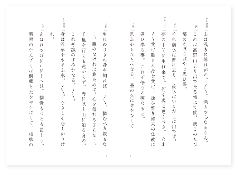 観阿弥作 ワキ 高野山の僧 ワキヅレ 同伴僧 シテ 小野小町 地は 山城 季は 雑 ワキ次第「山は浅きに隠れがの。〳〵。深きや心なるらん。 詞「これは高野山より出でたる僧にて候。我このたび都にのぼらばやと思ひ候。 サシ「それ前仏は既に去り。後仏はいまだ世に出でず。 ワキ、ツレ「夢の中間に生れ来て。何を現と思ふべき。たま〳〵受け難き人身を受け。逢ひ難き如来の仏教に逢ひ奉る事。これぞ悟りの種なると。 下歌「思ふ心もひとへなる。墨の衣に身をなして。 上歌「生れぬさきの身を知れば。〳〵。憐むべき親もなし。親のなければ我ために。心を留むる子もなし。千里を行くも遠からず。野に臥し山に泊る身の。これぞ誠のすみかなる。〳〵。 シテ次第「身は浮草をさそふ水。〳〵。なきこそ悲しかりけれ。 サシ「あはれやげにいにしへは。驕慢もつとも甚しう。翡翠のかんざしは婀娜とたをやかにして。楊柳の春の風になびくが如し。また鶯舌の囀りは。露を含める糸萩の。かごとばかりに散りそむる。花よりもなほめづらしや。今は民間賤の女にさへ穢なまれ。諸人に恥をさらし。うれしからぬ月日身に積つて。百年の姥と為りて候。 下歌「都は人目つゝましや。もしもそれとか夕まぐれ。 上歌「月もろともに出でゝ行く。〳〵。雲井百敷や。大内山の山守も。かゝる憂き身はよも咎めじ。木がくれてよしなや。鳥羽の恋塚秋の山。月の桂の河瀬舟。漕ぎゆく人は誰やらん。〳〵。 シテ詞「あまりに苦しう候ふほどに。これなる朽木に腰を懸けて休まばやと思ひ候。 ワキ詞「なふはや日の暮れて候ふ道を急がうずるにて候。や。これなる乞食の腰かけたるは。正しく卒都婆にて候。教化してのけうずるにて候。いかにこれなる乞丐人。お事の腰かけたるは。かたじけなくも仏体色性の卒都婆にては無きか。そこ立ちのきて余の所に休み候へ。 シテ「仏体色性のかたじけなきとは宣へども。是ほどに文字も見えず。刻める像もなし。たゞ朽木とこそ見えたれ。 ワキ「たとひ深山の朽木なりとも。花咲きし木はかくれもなし。いはんや仏体に刻める木。などかしるしのなかるべき。 シテ「我も賤しき埋木なれども。心の花のまだ有れば。手向になどかならざらん。さて仏体たるべき謂は如何に。 ワキツレ「それ卒都婆は金剛薩埵。かりに出仮して三摩耶形を行ひ給ふ。 シテ「行ひなせる形は如何に。 ワキ「地水火風空。 シテ「五体五輪は人の体。何しに隔あるべきぞ。 ワキ、ツレ「形はそれに違はずとも。心功徳はかはるべし。 シテ「さて卒都婆の功徳は如何に。 ワキ「一見卒都婆永離三悪道。 シテ「一念発起菩提心。それも如何でか劣るべき。 ツレ「菩提心あらばなど浮世をば厭はぬぞ。 シテ「姿が世をも厭はゞこそ。心こそ厭へ。 ワキ「心なき身なればこそ。仏体をば知らざるらめ。 シテ「仏体と知ればこそ卒都婆には近づきたれ。 ツレ「さらばなど礼をば為さで敷きたるぞ。 シテ「とても臥したる此卒都婆。我も休むは苦しいか。 ワキ「それは順縁にはづれたり。 シテ「逆縁なりと浮ぶべし。 ツレ「提婆が悪も。 シテ「観音の慈悲。 ワキ「槃特が愚痴も。 シテ「文珠の智恵。 ツレ「悪と云ふも。 シテ「善なり。 ワキ「煩悩といふも。 シテ「菩提なり。 ツレ「菩提もと。 シテ「植木にあらず。 ワキ「明鏡また。 シテ「台に無し。 地「げに本来一物なき時は。仏も衆生も隔なし。もとより愚痴の凡夫を。救はん為めの方便の。深き誓ひの願なれば。逆縁なりと浮ぶべしと。ねんごろに申せば。誠に悟れる非人なりとて。僧は頭を地につけて。三度礼し給へば。 シテ「我は此時力を得。なほ戯れの歌をよむ。極楽の内ならばこそ悪しからめ。外は何かは苦しかるべき。 地「むつかしの僧の教化や。〳〵。 ワキ詞「さて御事は如何なる人ぞ名を御名のり候へ。 シテ詞「はづかしながら名を名のり候ふべし。これは出羽の郡司小野の良実がむすめ。小野の小町が為れる果にてさぶらふなり。 ワキ、ツレ「いたはしやな小町は。さもいにしへは優女にて。花のかたちかゝやき。桂の黛青うして。白粉を絶えさず。羅綾の衣多うして。桂殿の間に余りしぞかし。 シテ「歌をよみ詩を作り。 地「酔をすゝむる盃は。漢月袖に静なり。まこと優なる有様の。いつ其ほどに引きかへて。頭には霜蓬をいたゞき。嬋妍たりし両鬢も。膚にかしけて墨みだれ。艶々たりし双蛾も。遠山の色を失ふ。百年に一年足らぬつくも髪。斯かる思ひは有明の。影はづかしき我身かな。 ロンギ地「首に懸けたる袋には。如何なる物を入れたるぞ。 シテ「今日も命は知らねども。明日の飢ゑを助けんと。粟豆の餉を。袋に入れて持ちたるよ。 地「うしろに負へる袋には。 シテ「垢膩の垢づける衣あり。 地「臂にかけたるあじかには。白黒の田烏子あり。 地「破れ簑。 シテ「やぶれ笠。 地「面ばかりも隠さねば。 シテ「まして霜雪雨露。 地「なみだをだにも抑ふべき。袂も袖もあらばこそ。今は路頭にさそらひ。往来の人に