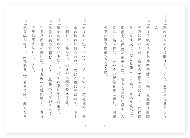 前 シテ 悪七兵衛景清 ツレ 景清母 後 ツレ 頼朝 同(数人) 従者 ワキ 同 シテ 前に同じ 地は 大和 季は 雑 シテ次第「忘れは草の名に聞きて。〳〵。忍ぶや我身なるらん。 詞「是は平家の侍悪七兵衛景清にて候。我此間は西国の方に候ひしが。宿願の子細あるにより。此程罷り上り清水に一七日参籠申して候。又承り候へば。南都大仏供養の由申し候。某も若草辺に母を一人持ちて候ふ程に。かやうの折節貴賤に紛れ。向顔の為め唯今南都へと急ぎ候。 サシ「あはれや実に古へは。さしも栄えし花紅葉の。寿永の秋の如何なれば。思はぬ風に誘はれて。さしも馴れにし都の空。引きかへ鄙の憂き住居。 下歌「繫がぬ船のかひもなく。弓矢の家に生まれ来て。 上歌「三笠の森の陰頼む。〳〵。其箒木のながらへて。いまだ此世の御住居。神も教への牡鹿鳴く。春日の里に着きにけり。〳〵。 詞「急ぎ候ふ程に。南都若草辺に着きて候。此あたりにて御行方を尋ねばやと存じ候。 母詞「さても我子の景清は。此程何処に在るやらん。南無や三世の諸仏。我子の景清に。ふたゝび逢はせてたび給へ。 シテ詞「如何に案内申し候。 母詞「我子の声と聞くよりも。覚えず扃に立ち出でゝ。景清なるかと悦べば。 シテ「暫く。あたりに人もや候ふらん。某が名をば仰せられまじいにて候。 母「まづ此方へ渡り候へ。さて此程は何処に候ひつるぞ。 シテ「さん候西国の方に候ひしが。宿願の子細有るにより。都に上り清水に参籠申し候ふ処に。大仏供養の由承り候ふ程に。かやうの折節貴賤に紛れ。御音信の為に参りて候。 母「さてはうれしくも来り給ひて候。又尋ね申すべき事の候ふ包まず申すべきか。 シテ「是は今めかしき仰せかな。何事にても候ヘ申し上げうずるにて候。 母「まことや人の申すは。頼朝をねらひ申すと聞き及びて候ふが誠にて候ふか。 シテ「是は思ひもよらぬ仰せにて候ふさりながら。西海にて亡び給ひし御一門の。御弔ひにもなるべきかと。思へばねらひ申すなり。 母「申す処はさる事なれども。明日をも知らぬ老の身の。果をも見届け給へかし。 シテ「風にたゞよふ浮舟の。教経の御供申さずして。 母「物を思へば。 シテ「起きもせず。 地「寐もせで夜半を明かしかね。此身を隠すかひもなく。景清が心の内。母もあはれと思し召せ。一門の船の内。〳〵に。肩をならべ膝を組みて。所せく澄む月の。景清は誰よりも。御座舟になくて叶ふまじ。一類其以下。武略さま〴〵に多けれど。名を取楫の舟に乗せ。主従隔てなかりしは。さも羨まれたりし身の。麒麟も老いぬれば。駑馬におとるが如くなり。 シテ詞「早夜の明けて候ふ程に御暇申し候。 母詞「かまへて御身をよく〳〵慎みて。重ねて来り給ふべし。 シテ「実に有難き母の慈悲。御言葉の末も頼もしき。 地「柞の森の雨露の。〳〵。梢も濡らす我袖を。しをりかねたる涙かな。いつしか親心。悲しむ母の門送り。景清も跡を見返りて。涙と共に別れけり。〳〵。(中入) 一同一声「世に隠れなき大伽藍。仏の供養急ぐなり。 頼朝「そも〳〵是は源家の官軍。右大将頼朝とは我事なり。 一同「忝くも此御寺は。聖武皇帝の御建立。大仏殿にておはします。 ワキ「又此君の御威光。今此御寺に合ひにあふ。 一同「大伽藍の御供養。〳〵。光りかゝやく春の日の。三笠の山に影高き。法の御声のさま〴〵に。供養をなすぞ有難き。〳〵。 シテ一声「おもしろや奈良の都の時めきて。色々飾る物詣で。我はそれには引きかへて。敵をうたん謀を。思ふ心はおのが名の。悪七兵衛景清と。よそにもそれと人やもし。白張浄衣に立烏帽子。実に我ながら思はざる。姿に今は楢の葉の。時雨降り置く天が下に。身を隠すべき便なき。憂き身の果ぞあはれなる。 一声「宮人の。姿を暫し狩衣。 地「今日ばかりこそ翁さび。 シテ「人なとがめそ神だにも。 地「塵に交はる宮寺の。供養の場に立ち出づる。 ワキ詞「こは何者なれば御前まぢかく参るぞそこのき候へ。 シテ詞「是は春日の宮づこなるが。今日の仏の御供養。場を清めの役人なるを。何しにとがめ給ふらん。 ワキ「春日祭にあらばこそ。是は仏の御供養。 シテ「なふ水波の隔てと聞く時は。仏も神も同一体。其上貴賤の事なるに。何とて撰び給ふべき。 ワキ「包むとすれど神はなほ。君を守りの御威光。 シテ「あらはれけるか白張の。 ワキ「脇より見ゆる具足の金物。 シテ「光りを放つ。 ワキ「打物の。 地「鞘つまりたる言葉の末。名乗れ〳〵と責めければ。顕はれたりと思ひつゝ。さらぬやうにて立ち帰り。又人かげに隠れけり。 ワキ詞「言語道断の事。唯今の者を如何なる者ぞと存じて候へば。平家の侍悪七兵衛景清にて候。正しく我君をねらひ申すと存じ候ふ程に。警固の者に申し付け討ち取らせばやと存じ候。如何にやいかに警固の兵たしかに聞け。唯今見えし痴者を。早打つ取つて参らせよと。さも高声に下知すれば。 地「畏つて候ふとて。かねて用意の警固の兵。皆一同に立ち騒ぐ。 シテ詞「