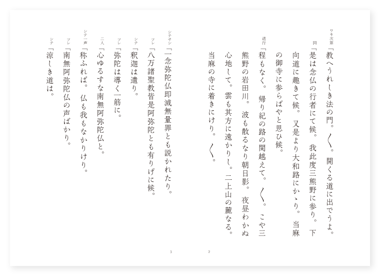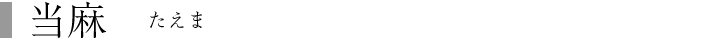 世阿弥作 前 ワキ 旅僧 シテ 化尼 ツレ 化女 後 ワキ 前に同じ シテ 中将姫 ワキ次第「教へうれしき法の門。〳〵。開くる道に出でうよ。 詞「是は念仏の行者にて候。我此度三熊野に参り。下向道に趣きて候。又是より大和路にかゝり。当麻の御寺に参らばやと思ひ候。 道行「程もなく。帰り紀の路の関越えて。〳〵。こや三熊野の岩田川。波も散るなり朝日影。夜昼わかぬ心地して。雲も其方に遠かりし。二上山の麓なる。当麻の寺に着きにけり。〳〵。 シテサシ「一念弥陀仏即滅無量罪とも説かれたり。 ツレ「八万諸聖教皆是阿弥陀とも有りげに候。 シテ「釈迦は遣り。 ツレ「弥陀は導く一筋に。 二人「心ゆるすな南無阿弥陀仏と。 シテ一声「称ふれば。仏も我もなかりけり。 ツレ「南無阿弥陀仏の声ばかり。 シテ「涼しき道は。 二人「頼もしや。 次第「濁りにしまぬ蓮の糸。〳〵の。五色にいかで染みぬらん。 シテサシ「有難や諸仏の誓ひ様々なれども。わきて超世の悲願とて。迷ひの中にも殊に猶。 二人「五つの雲は晴れやらぬ。雨夜の月の影をだに。知らぬ心の行くへをや。西へとばかり頼むらん。実にや頼めば近き道を。何遥々と思ふらん。 下歌「末の世に。迷ふ我等が為めなれや。 上歌「説き遺す。御法は是ぞ一声の。〳〵。弥陀の教へを頼まずは。末の法。万年々経るまでに。余経の法はよもあらじ。たま〳〵此生に浮まずは。又いつの世を松の戸の。明くれば出でゝ暮るゝまで。法の場に交じるなり。御法の場に交じるなり。 ワキ詞「如何に是なる方々に尋ね申すべき事の候。 シテ詞「何事にて候ふぞ。 ワキ「是は当麻の御寺にて候ふか。 シテ「さん候当麻の御寺とも申し。又当麻寺とも申し候。 ツレ「又是なる池は蓮の糸を。すゝぎて清めし其故に。染殿の井とも申すとかや。 シテ「あれは当麻寺。 ツレ「是は染寺。 シテ「又此池は染殿の。 二人「色々様々所々の。法の見仏聞法ありとも。それをもいさや白糸の。唯一筋ぞ一心不乱に。南無阿弥陀仏。 ワキ「実に有難き人の言葉。即ち是こそ弥陀一教なれ。さて又是なる花桜。常の色には変はりつゝ。是も故ある宝樹と見えたり。 ツレ「実によく御覧じ分けられたり。あれこそ蓮の糸を染めて。 シテ「掛けて乾されし桜木の。花も心の有る故に。蓮の色に咲くとも云へり。 ワキ「中々なるべし本よりも。草木国土成仏の。色香に染める花心の。 シテ「法の潤ひ種添へて。 ワキ「濁にしまね蓮の糸を。 シテ「すゝぎて清めし人の心の。 ワキ「迷ひを乾すは。 シテ「緋桜の。 地「色はえて。掛けし蓮の糸桜。〳〵。花の錦の経緯に。雲の絶間に晴れ曇る。雪も緑も紅も。唯一声の誘はんや。西吹く秋の風ならん。〳〵。 ワキ詞「猶々当麻の曼陀羅の謂委しく御物語り候へ。 地クリ「そもそも此当麻の曼陀羅と申すは。人皇四十七代の帝。廃帝天皇の御宇かとよ。横佩の右大臣豊成と申しゝ人。 シテサシ「其御息女中将姫。此山にこもり給ひつゝ。 地「称讃浄土経。毎日読誦し給ひしが。心中に誓ひ給ふやう。願はくは正身の弥陀来迎あつて。我に拝まれおはしませと。一心不乱に観念し給ふ。 シテ「然らずは畢命を期として。 地「此草庵を出でじと誓つて。一向に念仏三昧の定に入り給ふ。 クセ「所は山陰の。松吹く風も涼しくて。さながら夏を忘れ水の。音も絶々に。心耳を澄ます夜もすがら。称名観念の床の上。座禅円月の窓の内。寥々と有る折節に。一人の老尼の。忽然と来りたゝずめり。是は如何なる人やらんと。尋ねさせ給ひしに。老尼答へて宣はく。誰とはなどや愚かなり。呼べばこそ来りたれと。仰せられける程に。中将姫はあきれつゝ。 シテ「我は誰をか呼子鳥。 地「たづきも知らぬ山中に。声立つる事とては。南無阿弥陀仏の称へならで。又他事もなき物をと。答へさせ給ひしに。それこそ我名なれ。声をしるべに来れりと。宣へば姫君も。さては此願成就して。正身の弥陀如来。実に来迎の時節よと。感涙肝に銘じつゝ。綺羅衣の御袖も。しをるばかりに見え給ふ。 ロンギ地「実にや貴き物語。即ち弥陀の教へぞと。思ふに付けて有難や。 二人「今宵しも。二月中の五日にて。しかも時正の時節なり。法事をなさん為め。今此寺に来りたり。 地「法事の為めに来るとは。そもや如何なる御事ぞ。 二人「今は何をか包むべき。其いにしへの化尼化女の。 地「夢中に現じ来れりと。 二人「言ひもあへねば。 地「光さして。花降り異香薫じ。音楽の声すなり。恥かしや旅人よ。暇申して帰る山の。二上の嶽とは二上の。山とこそ人はいへど。誠は此尼が。上りし山なる故に。尼上の嶽とは申すなり。老の坂を登り登る。雲に乗りて上りけり。紫雲に乗りて上りけり。(中入) ワキ詞「かく有難き御事なれば。重ねて奇特を拝まんと。 歌「いひもあへねば不思議やな。〳〵。妙音聞え光さし。歌舞の菩薩の目のあたり。顕はれ給ふ不思議さよ。〳〵。 後ジテ「唯今夢中に顕はれたるは。中将姫の精魂なり。我娑婆に在りし時。称