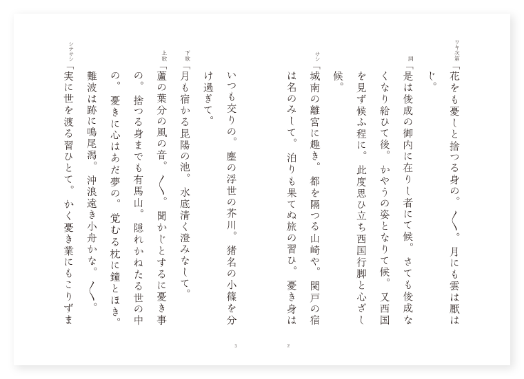 世阿弥作 前 ワキ 旅僧 シテ 樵の翁 後 ワキ 前に同じ シテ 薩摩守忠度 地は 摂津 季は 三月 ワキ次第「花をも憂しと捨つる身の。〳〵。月にも雲は厭はじ。 詞「是は俊成の御内に在りし者にて候。さても俊成なくなり給ひて後。かやうの姿となりて候。又西国を見ず候ふ程に。此度思ひ立ち西国行脚と心ざし候。 サシ「城南の離宮に趣き。都を隔つる山崎や。関戸の宿は名のみして。泊りも果てぬ旅の習ひ。憂き身はいつも交りの。塵の浮世の芥川。猪名の小篠を分け過ぎて。 下歌「月も宿かる昆陽の池。水底清く澄みなして。 上歌「蘆の葉分の風の音。〳〵。聞かじとするに憂き事の。捨つる身までも有馬山。隠れかねたる世の中の。憂きに心はあだ夢の。覚むる枕に鐘とほき。難波は跡に鳴尾潟。沖浪遠き小舟かな。〳〵。 シテサシ「実に世を渡る習ひとて。かく憂き業にもこりずまの。汲まぬ時だに塩木を運べば。乾せども隙は馴衣の。浦山かけて須磨の海。 一声「海人の呼声ひまなきに。しばなく千鳥音ぞとほき。 サシ「そも〳〵此須磨の浦と申すは。淋しき故に其名を得る。わくらはに問ふ人あらば須磨の浦に。もしほたれつゝわぶと答へよ。実にや漁の海人小船。藻塩の煙松の風。いづれか淋しからずと云ふ事なき。 詞「又此須磨の山陰に一木の桜の候。是は或る人の亡き跡のしるしの木なり。殊更時しも春の花。手向の為めに逆縁ながら。足引の山より帰る折ごとに。薪に花を折りそへて。手向をなして帰らん。〳〵。 ワキ詞「如何に是なる老人。おことは此山賤にてましますか。 シテ詞「さん候此浦の海人にて候。 ワキ「海人ならば浦にこそ住むべきに。山ある方に通はんをば。山人とこそいふべけれ。 シテ「そも海士人の汲む汐をば。焼かで其まゝ置き候ふべきか。 ワキ「実に〳〵これは理なり。藻塩たくなる夕煙。 シテ「絶間を遅しと塩木とる。 ワキ「道こそかはれ里ばなれの。 シテ「人音稀に須磨の浦。 ワキ「近き後の山里に。 シテ「柴といふ物の候へば。 地「柴といふ物の候へば。塩木の為めに通ひ來る。 シテ「余りに愚なる。御僧の御諚かなやな。 地「実にや須磨の浦。余の所にやかはるらん。夫れ花につらきは。嶺の嵐や山おろしの。音をこそ厭ひしに。須磨の若木の桜は。海少しだにも隔てねば。通ふ浦風に。山の桜も散る物を。 ワキ詞「如何に尉殿。はや日の暮れて候へば。一夜の宿を御かし候へ。 シテ詞「うたてやな此花の陰ほどの御宿の候ふべきか。 ワキ「実に〳〵是は花の宿なれどもさりながら。誰を主と定むべき。 シテ「行き暮れて木の下陰を宿とせば。花や今宵の主ならましと。詠めし人は此苔の下。痛はしや我等が様なる海人だにも。常は立ち寄り弔ひ申すに。御僧達はなど逆縁ながら弔ひ給はぬ。おろかにまします人々かな。 ワキ「行き暮れて木の下陰を宿とせば。花や今宵の主ならましと。詠めし人は薩摩の守。 シテ「忠度と申しゝ人は。此一の谷の合戦に討たれぬ。ゆかりの人の植ゑ置きたる標の木にて候ふなり。 ワキ「こはそも不思議の値遇の縁。さしもさばかり俊成の。 シテ「和歌の友とて浅からぬ。 ワキ「宿は今宵の。 シテ「主の人。 地「名も唯法の声聞きて。花の台に座し給へ。 シテ「有難や今よりは。かく弔ひの声聞きて。仏果を得んぞ嬉しき。 地「不思議や今の老人の。手向の声を身に受けて。喜ぶけしき見えたるは。何の故にてあるやらん。 シテ「御僧に弔はれ申さんとて。これまで来れりと。 地「夕の花の陰に寐て。夢の告をも待ち給へ。都へ言づて申さんとて。花の陰に宿木の。行くかた知らずなりにけり。〳〵。(中入) ワキ詞「先々都に帰りつゝ。定家に此事申さんと。 歌「夕月早くかげろふの。〳〵。おのが友よぶ村千鳥の。跡見えぬ礒山の。夜の花に旅寐して。浦風までも心して。春に聞けばや音すごき。須磨の関屋の旅寐かな。〳〵。 後ジテ「恥かしや亡き跡に。姿を帰す夢の内。覚むる心はいにしへに。迷ふ雨夜の物語。申さん為めに魂魄に。うつりかはりて来りたり。さなきだに妄執多き娑婆なるに。何中々の千載集の。歌の品には入りたれども。勅勘の身の悲しさは。よみ人知らずと書かれし事。妄執の中の第一なり。されどもそれを撰じ給ひし。俊成さへ空しくなり給へば。御身は御内にありし人なれば。今の定家君に申し。然るべくは作者を附けてたび給へと。夢物語申すに。須磨の浦風も心せよ。 地クリ「実にや和歌の家に生れ。其道を嗜み。敷島の蔭に依つし事。人倫に於て専らなり。 ワキサシ「中にも此忠度は。文武二道を受け給ひて。世上に眼高し。 地「そも〳〵後白河の院の御宇に。千載集を撰ばる。五条の三位俊成の卿。承つて之を撰ず。 下歌「年は寿永の秋の頃。都を出でし時なれば。 上歌「さも忙はしかりし身の。〳〵。心の花か蘭菊の。狐川より引き返し。俊成の家に行き。歌の望みを嘆きしに。望み足りぬれば。又弓箭にたづさはりて。西海の波の上。暫しと頼む須磨の浦。源氏の住み所。平家