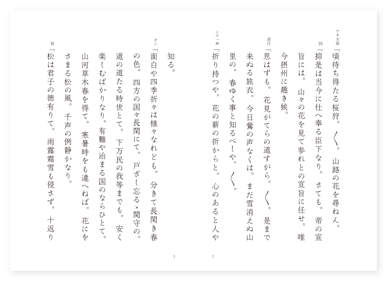 前 ワキ 勅使 シテ 樵の翁 後 ワキ 前に同じ シテ 山神 地は 摂津 季は 三月 ワキ次第「頃待ち得たる桜狩。〳〵。山路の花を尋ねん。 詞「抑是は当今に仕へ奉る臣下なり。さても。帝の宣旨には。山々の花を見て参れとの宣旨に任せ。唯今摂州に趣き候。 道行「思はずも。花見がてらの道すがら。〳〵。是まで来ぬる旅衣。今日鶯の声なくは。まだ雪消えぬ山里の。春ゆく事と知るべしや。〳〵。 シテ一声「折り持つや。花の薪の折からと。心のあると人や知る。 サシ「面白や四季折々は様々なれども。分きて長閑き春の色。四方の国々長閑にて。戸ざし忘るゝ関守の。道の道たる時世とて。下万民の我等までも。安く楽しむばかりなり。有難や治まる国のならひとて。山河草木春を得て。寒暑時をも違へねば。花にをさまる松の風。千声の例静かなり。 歌「松は君子の徳有りて。雨露霜雪も侵さず。十返りの。花をふくむや若緑。猶万歳の春の空。君の御蔭も筑波嶺に。このもかのもに立ち寄りて。老を忘るゝ詠めして。春も栄行く山路かな。〳〵。 ワキ詞「いかに是なる山賤に尋ぬべき事の候。 シテ詞「何事にて候ふぞ。 ワキ「此所をば津の国に取りても。いかなる在所とか申し候ふぞ。 シテ「津の国に取りても鼓の山と申して。めでたき在所とこそ申し候へ。 ワキ「さて〳〵鼓の山とは。取り分きたる在所の候ふか委しく教へ候へ。 シテ「国の名所は天ざかる。鄙の都の古き歌にもよまれたる名所は。取り分きめでたかるべし。されば歌にも津の国の。鼓の山の打ちはへて。楽しき御代に逢ふぞうれしきとあり。 ワキ「さてはうれしや音に聞く。鼓の滝を来て見れば。げに面白き滝なりけり。 シテ「あらうたてしや津の国の。鼓の滝を来て見ればとは。御言葉とも覚えぬものかな。古き歌人の言葉にも。 地「音に聞く鼓の滝を打ち見れば。〳〵。唯山河の中にも有りけると。さしもよみし言の葉の。跡なれや此山の。嵐も雪も落ち来るや。鼓の滝も花の滝も。糸を添へて白浪の。あら面白の気色やな。〳〵。 シテサシ「抑春の夜の一時。花に清香月に陰。惜しまるべしや時も実に。及ぶかたなき上旬の空。色も長閑けき春の日の。流にひかるゝ盃の。手まづさへぎる心かな。 クセ「花前に酒を酌んで紅色を飲むとかや。実に面白や盃の。光りもめぐる春の夜の。有明桜照り増り。天花に酔へりや。流水も雪なり。げにあくがるゝ春なれや。我と心に誘はれて。都は遥々と。跡に霞の薄衣。日も夕暮は過ぐれども。其まゝに長居して。花に名残は有間山。鼓の滝に時移り。宿を花に刈藻かく。猪名野も近かりき。床は露の笹枕。 シテ「深山がくれの暁に。 地「遠寺の鐘もかすかにて。深洞に風すぼく。老槐悲しむ。声も袂をうるほすや。猿子を抱いて。清湘のかげに帰りぬ。鳥花をふくんで。碧巌の前に落つなるも。今更思ひ知られたり。花見ずはいかでか。此山に一夜明かさん。 ロンギ地「実にや妙なる花の陰。聞くにつけても今日しもに。酒宴をなすぞうれしき。 シテ「とても夜遊の折しもに。花をかざして旅人の。舞楽をいざや進めん。 地「そもや舞楽の遊びとは。其舞人は誰やらん。 シテ「我は山河を守るなる。山神こゝに現はれて。 地「舞楽を調ふる鼓の。滝祭の老人は。此翁なりといひすてゝ。花をかざし浪を踏みて。滝壺に入りにけり。此滝壺に入りにけり。(中入) ワキ歌「あら有難の御事や。〳〵。滝の響きも声澄みて。音楽聞え花ふれり。是れ唯事と思はれず。〳〵。 後ジテ「花の下に帰らん事を忘るゝは。美景によつてなり。樽の前に酔を勧めては。是れ春の風をさまつて。枝を鳴らさぬ花の粧ひ。梢も白妙の。雪をめぐらす袂かな。有難や花に声ある松の風。 地「滝の響きも声澄みて。 シテ「月の夜神楽花の粧ひ。 地「心耳を驚かす夜神楽の。花落つるや。滝浪もとう〳〵と。打つなり〳〵鼓の滝。 ロンギ地「あら有難や。有難や。天下太平楽とは。いかなる舞を申すぞ。 シテ「怨敵の難を遁て。上下万民舞ひ給ふ。 地「扨万歳楽と申すは。 シテ「都卒天の楽にて。見仏菩薩舞ひ給ふ。 地「春立つ空の舞には。 シテ「春鶯囀を舞ふべし。 地「秋来る空の舞には。 シテ「秋風楽を舞ふとかや。 地「舞に颯々と云ふ声は。楽々の声とかや。嶺の松風。又谷の響き声々。かざしは雲の花笠。春来にけりな小忌の袖。手風足拍子の。鼓の滝も花の滝。治まる御代ぞめでたき。〳〵。 底本:国立国会図書館デジタルコレクション『謡曲評釈 第四輯』大和田建樹 著