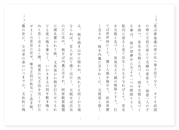 前 ワキ 官人 シテ 天鼓の父王伯 後 ワキ 前に同じ シテ 天鼓 地は 唐土 季は 七月 ワキ詞「是は唐後漢の帝に仕へ奉る臣下なり。さても此国の傍に王伯王母とて夫婦の者有り。彼者一人の子を持つ。其名を天鼓と名づく。彼を天鼓と名づくる事は。彼が母夢中に天より一つの鼓降り下り。胎内に宿ると見て出生したる子なればとて。其名を天鼓と名づく。其後天より誠の鼓降り下り。打てば其声妙にして。聞く人感を催せり。此由帝聞し召され。鼓を内裏に召されしに。天鼓深く惜しみ。鼓を抱き山中に隠れぬ。然れども何くか王地ならねば。官人を以て捜し出だし。天鼓をば呂水の江に沈め。鼓をば内裏に召され。阿房殿雲龍閣に据ゑ置かれて候。又其後かの鼓を打たせらるれども更に鳴る事なし。いかさま主の別を歎き鳴らぬと思し召さるゝ間。彼者の父王伯を召して打たせよとの宣旨に任せ。唯今王伯が私宅へと急ぎ候。 シテ一声「露の世に。なほ老の身のいつまでか。又此秋に残るらん。 サシ「伝へ聞く孔子は鯉魚に別れて。思ひの火を胸に焚き。白居易は子を先だてゝ。枕に残る薬を恨む。是れ皆仁義礼智信の祖師。文道の大祖たり。我等が歎くは科ならじと。思ふおもひに堪へかぬる。涙いとなき袂かな。 下歌「思はじと。思ふ心のなどやらん。夢にもあらず現にも。なき世の中ぞ悲しき。〳〵。 上歌「よしさらば。思ひ出でじと思寐の。〳〵。闇の現に生れ来て。忘れんと思ふ心こそ。忘れぬよりは思ひなれ。唯何故の憂き身の。命のみこそ恨みなれ。〳〵。 ワキ詞「如何に此屋の内に王伯があるか。 シテ詞「誰にて渡り候ふぞ。 ワキ「是は帝よりの宣旨にて有るぞ。 シテ「宣旨とはあら思ひよらずや何事にて御座候ふぞ。 ワキ「さても天鼓が鼓内裏にめされて後。いろ〳〵打たせらるれども更に鳴る事なし。如何さま主の別を歎き鳴らぬと思し召さるゝ間。王伯に参りて仕れとの宣旨にて有るぞ。急いで参内仕り候へ。 シテ「仰せ畏つて承り候ふ去りながら。勅命にだに鳴らぬ鼓の。老人が参りて打ちたればとて。何しに声の出づべきぞ。いや〳〵是も心得たり。勅命を背きし者の父なれば。重ねて失はれん為めにてぞ有るらん。よし〳〵それも力なし。我子の為めに失はれんは。それこそ老の望みなれ。あら歎くまじやゝがて参り候ふべし。 ワキ「いやいや左様の宣旨ならず。唯々鼓を打たせんとの。其為めばかりの勅諚なり。急いで参り給ふべし。 シテ「たとひ罪には沈むとも。 地「たとひ罪には沈むとも。又は罪にも沈まずとも。憂きながら我子の形見に。帝を拝み参らせん。〳〵。 ワキ詞「急ぐ間程なく内裏にて有るぞ。此方へ来り候へ。 シテ詞「勅諚にて候ふ程に。是までは参りて候へども。老人が事をば。御免あるべく候。 ワキ「申す所は理なれども。まづ鼓を仕り候へ。鳴らずは力なき事急いで仕り候へ。 シテ「さては辞すとも叶ふまじ。勅に応じて打つ鼓の。声もし出でばそれこそは。我子の形見と夕月の。上に輝く玉殿に。始めて臨む老の身の。 地次第「生きてある身は久方の。〳〵。天の鼓を打たうよ。 地クリ「其磧礫にならつて玉淵を窺はざるは。驪龍の蟠る所を知らざるなり。 シテサシ「実にや世々ごとの。仮の親子に生まれ来て。 地「愛別離苦の思ひ深く。恨むまじき人を恨み。悲しむまじき身を歎きて。我と心の闇深く。輪廻の波にたゞよふ事。生々世々もいつまでの。 シテ「思ひのきづな長き世の。 地「苦しみの海に沈むとかや。 クセ「地を走る獣。空を翔る翅まで。親子のあはれ知らざるや。況んや仏性同体の人間。此生に此身を浮べずは。いつの時か生死の。海を渡り山を越えて。彼岸に至るべき。 シテ「親子は三界の首枷と。 地「聞けば誠に老心。別れの涙の雨の袖。しをれぞ増さる草衣。身を恨みても其かひの。なき世に沈む罪科は。唯命なれや明暮の。時の鼓の現とも。思はれぬ身こそ恨みなれ。 ロンギ地「鼓の時も移るなり。涙を止めて老人よ。急いで鼓打つべし。 シテ「実に〳〵是は大君の。忝しや勅命の。老の時も移るなり。急いで鼓打たうよ。 地「打つや打たずや老波の。立ち寄る影も夕月の。 シテ「雲龍閣の光りさす。 地「玉の階。 シテ「玉の床に。 地「老の歩みも足よわく。薄氷を踏む如くにて。心も危き此鼓。打てば不思議や其声の。心耳を澄ます声出でゝ。実にも親子のしるしの声。君もあはれと思し召して。龍顔に御涙を。浮べ給ふぞ有難き。 ワキ詞「如何に老人。只今鼓の音の出でたる事。誠にあはれと思し召さるゝ間。老人には数の宝を下さるゝなり。又天鼓が跡をば。管絃講にて御弔ひ有るべきとの勅諚なり。心やすく存じ。まづ〳〵老人は私宅へ帰り候へ。 シテ詞「あら有難や候。さらば老人は私宅に帰り候ふべし。(中入) ワキ「さても天鼓が身を沈めし。呂水の堤に御幸なつて。同じく天の鼓をすゑ。 歌「糸竹呂律の声々に。〳〵。法事をなして亡き跡を。御弔ひぞ有難き。頃は初秋の空なれば。早三伏の夏たけ。風一声の秋