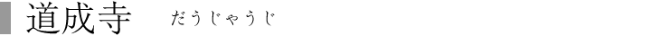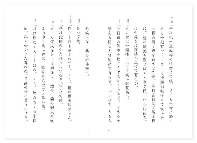 観阿弥作 前 ワキ 道成寺の住僧 狂言二人 道成寺の能力 ワキヅレ 同じく伴僧 シテ 白拍子 後 ワキ 前に同じ ワキヅレ 前に同じ シテ 蛇身 地は 紀伊 季は 三月 ワキ詞「是は紀州道成寺の住僧にて候。さても当寺に於てさる子細有つて。久しく撞鐘退転仕りて候ふを。此程再興し鐘を鋳させて候。今日吉日にて候ふ程に。鐘の供養を致さばやと存じ候。いかに能力。はや鐘をば鐘楼へ上げて有るか。 狂言「さん候はや鐘楼へ上げて候ふ御覧候へ。 ワキ「今日鐘の供養を致さうずるにて有るぞ。又さる子細ある間女人禁制にて有るぞ。かまひて一人も入れ候ふな。其分心得候へ。 狂言「畏つて候。 シテ次第「作りし罪も消えぬべし。〳〵。鐘の供養に参らん。 サシ「是は此国のかたはらに住む白拍子にて候。 詞「さても道成寺と申す御寺に。鐘の供養の御入り候ふ由申し候ふ程に。唯今参らばやと思ひ候。 道行「月は程なく入りしほの。〳〵。煙みちくる小松原。急ぐ心かまだ暮れぬ。日高の寺に着きにけり。〳〵。 詞「急ぎ候ふ程に。日高の寺に着きて候。やがて供養を拝まうずるにて候。 狂言「如何に是なる女人何くより参られたるぞ。供養の庭へは叶ひ候ふまじ。 シテ「是は此国のかたはらにすむ白拍子にて候。鐘の供養にそと舞をまひ候ふべし。供養を拝ませて賜はり候へ。 狂言「尤拝ませたく候へども。何と思し召し候ふやらん。供養の庭には堅く禁制と仰せ出だされて候ふ去りながら。某の心得を以て拝ませ申さうずる間。面白う舞まうて御見せ候へ。折節是に烏帽子の候。之を召して御舞ひ候へ。 シテ「荒うれしや涯分舞をまひ候ふべし。うれしやさらば舞はんとて。あれにまします宮人の。烏帽子をしばし仮に着て。既に拍子を進めけり。 次第「花の外には松ばかり。〳〵。暮れそめて鐘や響くらん。(乱拍子) ワカ「道成の卿承り。始めて伽藍橘の。道成興行の寺なればとて。道成寺とは名づけたりや。 地「山寺のや。(急の舞) シテ「春の夕ぐれ来てみれば。 地「入相の鐘に花ぞ散りける。花ぞちりける。〳〵。 シテ「さるほどに〳〵。寺々の鐘。 地「月落ち鳥鳴いて霜雪天に。満汐ほどなく日高の寺の。江村の漁火愁に対して。人々眠ればよき隙ぞと。立ち舞ふ様にてねらひよりて。撞かんとせしが。思へば此鐘恨めしやとて。龍頭に手をかけ飛ぶとぞみえし。ひきかづきてぞ失せにける。(中入) 狂言「落ちてござる。 ワキ「何が落ちたると申すぞ。 狂言「鐘が鐘楼より落ちて候。 ワキ「鐘が鐘楼より落ちたると申すか。 狂言「中々。 ワキ「何として落ちたるぞ。 狂言「随分念を入れて御座るが落ちて候。 ワキ「別に思ひ合はする事は無きか。 狂言「それにつき思ひ出でたる事が御座る。最前此国の傍に住む白拍子にてあるが。鐘の供養を拝ませてくれよと申した程に。禁制のよし申して御座れば。舞を舞うて見せ申さうずるに依つてと申したによつて見せ申したが。もしさやうの者のわざにても御座あらうずるか。 ワキ詞「言語道断。かやうの義を存じてこそ。固く女人禁制のよし申して候ふに。曲事にて有るぞ。なふ〳〵皆々かう渡り候へ。此鐘に付いて女人禁制と申しつるいはれの候ふを御存じ候ふか。 ツレ「いや何とも存ぜず候。 ワキ「さらば其謂を語つて聞かせ申し候ふべし。 ツレ「懇に御物語り候へ。 ワキ「むかし此所に。まなごの庄司と云ふ者あり。彼者一人の息女を持つ。又其頃奥より熊野へ参詣する山伏の有りしが。庄司がもとを宿坊と定め。いつも彼所にきたりぬ。庄司娘を寵愛の余りに。あの客僧こそ汝がつまよ夫よなんどゝ戯れしを。をさな心に誠とおもひ年月を送る。又或とき彼客僧庄司がもとに来りしに。彼女夜更け人しづまつて後。客僧の閨にゆき。いつまでわらはをばかくて置き給ふぞ。急ぎむかへ給へと申しゝかば。客僧大きにさわぎ。さあらぬよしにもてなし。夜にまぎれ忍びいで此寺にきたり。ひらに頼むよし申しゝかば。隠すべき所なければ。撞鐘をおろし其のうちに此客僧を隠しおく。さて彼女は山伏を。のがすまじとて追つかくる。折節日高川の水以ての外に増りしかば。川の上しもをかなたこなたへ走りまはりしが。一念の毒蛇と為つて。河を易々とおよぎこし此寺にきたり。こゝかしこを尋ねしが。鐘のおりたるを怪しめ。龍頭をくはへ七まとひ纏ひ。焰を出だし尾を以てたゝけば。鐘はすなはち湯となつて。終に山伏を取りをはんぬ。なんぼう恐ろしき物がたりにて候ふぞ。 ツレ「言語道断。かゝる恐ろしきおん物語こそ候はね。 ワキ「其時の女の執心残つて。また此鐘に障碍をなすと存じ候。我人の行功も。かやうのためにてこそ候へ。涯分祈つて此鐘を二度鐘楼へ上げうずるにて候。 ツレ「尤しかるべう候。 ワキ「水かへつて日高川原の真砂の数は尽くるとも。行者の法力つくべきかと。 ツレ「みな一同に声をあげ。 ワキ「東方に降三世明王。 ツレ「南方に軍荼利夜叉明王。 ワキ「西方に大威徳明王。 ツレ「北方に金剛夜叉明王。 ワキ「中