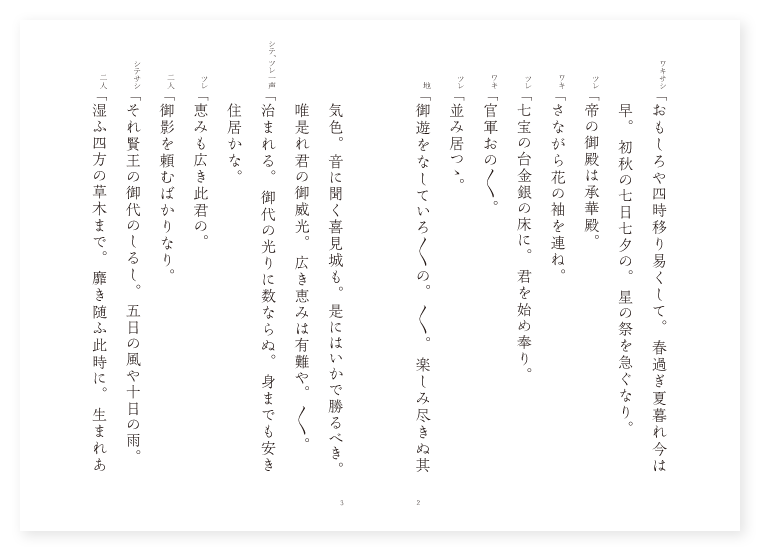 禅鳳作 前 シテ 老翁 ツレ(男) 同伴者 後 シテ 東方朔 ツレ 西王母 地は 唐土 季は 初秋 ワキサシ「おもしろや四時移り易くして。春過ぎ夏暮れ今は早。初秋の七日七夕の。星の祭を急ぐなり。 ツレ「帝の御殿は承華殿。 ワキ「さながら花の袖を連ね。 ツレ「七宝の台金銀の床に。君を始め奉り。 ワキ「官軍おの〳〵。 ツレ「並み居つゝ。 地「御遊をなしていろ〳〵の。〳〵。楽しみ尽きぬ其気色。音に聞く喜見城も。是にはいかで勝るべき。唯是れ君の御威光。広き恵みは有難や。〳〵。 シテ、ツレ一声「治まれる。御代の光りに数ならぬ。身までも安き住居かな。 ツレ「恵みも広き此君の。 二人「御影を頼むばかりなり。 シテサシ「それ賢王の御代のしるし。五日の風や十日の雨。 二人「湿ふ四方の草木まで。靡き随ふ此時に。生まれあふ身は頼もしや。 下歌「時しも今日は七夕の。逢ふ瀬を急ぐ頃なれや。 上歌「秋来ぬと。目に見ぬ空はおのづから。〳〵。音かへて吹く風の。袖も涼しき夕ま暮。靡く稲葉の色までも。千年の秋の始めかな。〳〵。 シテ詞「如何に奏聞申すべき事の候。 ワキヅレ「奏聞申さんとは如何なる者ぞ。 シテ「是は此国の傍に住む者にて候ふが。申し上げたき子細候ひて参内申して候。 ワキヅレ「さらば此方へ参り候ヘ。 シテ「是は此国の傍に住む者にて候ふが。めでたき瑞相の御座候ひて参りて候。此程三足の青鳥御殿の上を飛び迴り候。是れ西王母が寵愛の鳥にて候。即ち西王母此君へ参礼申すべし。此事奏聞申さん為めに参りて候。 ワキ「かゝるめでたき事こそ候はね。猶々仙人の謂懇に物語り候へ。 地クリ「それ仙郷といつぱ。人間に交はらず。松の葉をすき苔を身に着て。年は経れども楽しみ尽きず。飛行自在の通を得る。 シテサシ「かたじけなくも悉達太子は。仙人に仕へおはしまし。 地「採菓汲水年を経て。終に成道し給ひて。大聖世尊となり給ふ。 クセ「然るに仙人の其数。限りも知らぬ中にも。西王母と聞えしは。西方極楽。無量寿仏の化現なれば。量りなき命の。仙人となるぞめでたき。されば園生に植うる桃の。三千年に一度。花咲き実なる此木の。仙薬となるぞ不思議なる。 シテ「今は包まじ我こそは。 地「其名も世々に隠れなき。東方朔と聞えしは。此老翁が事なり。君桃実をきこし召さば。御寿命長遠に。御身も息災なるべし。急ぎ王母を伴なひ。重ねて参内申さんと。庭上を立つて帰る波の。声ばかり残りつゝ。形は雲に入りにけり。形は雲に入りにけり。(中入) 後ジテ「そも〳〵是は。仙郷に入つて年久しき。東方朔とは我事なり。さても我西王母が桃実を。度々服せし其故に。寿命既に九千歳に及べり。彼桃実を君に捧げ申さんとの誓ひあり。如何にやいかに西王母。とく〳〵参内申すべし。 地「不思議や西の空よりも。〳〵。白雲一村くだると見えしが。三足の青鳥。翅をならべて飛び迴り。姿も妙なる王母の出で立ち。光りもかゝやく衣冠を着し。斑龍に乗じて顕はれ給ふ。まのあたりなる奇特かな。 王母「王母は庭上に歩み出で。 地「王母は庭上に歩み出でゝ。彼桃実を捧げ持つて。上覧に供ヘ奉れば。帝王御感の余りにや。糸竹の調べ数を尽し。皆一同にかなで給ふ。舞楽の秘曲は面白や。(楽) 地「舞楽も漸々時過ぎて。〳〵。夕陽西に傾きければ。各君に御暇申し。帰らんとせしに。帝王名残を惜しみ給ひ。重ねて参内申すべしと。宣旨を蒙り。二人は伴なひ出でけるが。王母は斑龍にゆらりと打ち乗り。遥の雲路に攀ぢ上り。遥の雲路に攀ぢ上つて。又天上にぞ帰りける。 底本:国立国会図書館デジタルコレクション『謡曲評釈 第二輯』大和田建樹 著