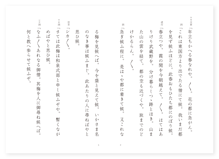 世阿弥作 前 ワキ 東国の僧 シテ 里女 後 ワキ 前に同じ シテ 和泉式部 狂言 里人 地は 京都 季は 初春 ワキ次第「年立ちかへる春なれや。〳〵。花の都に急がん。 詞「これは東国方より出でたる僧にて候。我いまだ都を見ず候ふほどに。此春おもひたち都にのぼり候。 道行「春立つや。霞の関を今朝越えて。〳〵。はてはありけり武蔵野を。分け暮らしつゝ跡とほき。山また山の雲を経て。都の空も近づくや。旅までのどけかるらん。〳〵。 詞「急ぎ候ふ程に。是はゝや都に着きて候。又これなる梅を見候へば。今を盛と見えて候。いかさま名のなき事は候ふまじ。此あたりの人に尋ねばやと思ひ候。 狂言「シカ〳〵。 ワキ詞「さては此梅は和泉式部と申し候ふぞや。暫くながめばやと思ひ候。 シテ詞「なふ〳〵あれなる御僧。其梅を人に御尋ね候へば。何と教へ参らせて候ふぞ。 ワキ詞「さん候人に尋ねて候へば。和泉式部とこそ教へ候ひつれ。 シテ「いやさやうにはいふべからず。梅の名は好文木。又は鶯宿梅などゝこそ申すべけれ。知らぬ人の申せばとて用ひ給ふべからず。此寺いまだ上東門院の御時。和泉式部此梅を植ゑおき。軒端の梅と名づけつゝ。目がれせずながめ給ひしとなり。かほどに妙なる花の縁に。御経をも読誦し給はゞ。逆縁の御利益ともなるべきなり。是こそ和泉式部の植ゑ給ひし軒端の梅にて候へ。 ワキ「さては和泉式部の植ゑ給ひし軒端の梅にて候ひけるぞや。又あの方丈は。和泉式部の御休所にて候ふか。 シテ「中々の事和泉式部のふしどなりしを。作りもかへず其まゝにて。今に絶えせぬ詠めぞかし。 ワキ「ふしぎやさては古への。名を残しおく形見とて。 シテ「花も主を慕ふかと。年々色香もいやましに。 ワキ「さもみやびたる御気色。 シテ「猶もむかしを。 ワキ「思ふかと。 地「年月を。古き軒端の梅の花。〳〵。あるじを知れば久方の。天ぎる雪のなべて世に。聞えたる名残かや。和泉式部の花ごゝろ。 ロンギ地「げにや古へを。聞くにつけても思ひでの。春や昔の春ならぬ。我身ひとりぞ心なき。 シテ「ひとりとも。いさ白雪の古事を。誰に問はまし道芝の。露の世になけれども。此花に住むものを。 地「そも此花に住むぞとは。とぶさに散るか花鳥の。 シテ「同じ道にと帰るさの。 地「先だつ跡か。 シテ「花の陰に。 地「やすらふと見えしまゝに。我こそ花の主よと。夕ぐれなゐの花の陰に。木がくれて見えざりき。木がくれて見えずなりにけり。(中入) ワキ歌「夜もすがら。軒端の梅の陰に居て。〳〵。花も妙なる法の道。迷はぬ月の夜と共に。此御経を読誦する。〳〵。 後ジテ「あらありがたの御経やな。あらありがたの御経やな。唯今読誦し給ふは譬喩品よなふ。思ひ出でたり閻浮のありさま。此寺いまだ上東門院の御時。御堂の関白この門前を通り給ひしが。御車の内にて法華経の譬喩品を高らかに読み給ひしを。式部この門の内にて聞き。門の外法の車の音きけば。我も火宅を出でにけるかなと。かやうによみし事。今の折から思ひ出でられて候ふぞや。 ワキ詞「げに〳〵此歌は。和泉式部の詠歌ぞと。田舎までも聞き及びしなり。さては詠歌の心の如く。火宅をばはや出で給へりや。 シテ「中々の事火宅は出でぬさりながら。よみおく歌舞の菩薩と為りて。 ワキ「なほ此寺に澄む月の。 シテ「出づるは火宅。 ワキ「いまぞ。 シテ「すでに。 地「三界無安の内を去りて。三つの車に法の道。すはや火宅の門を今ぞ。和泉式部は成等。正覚を得るぞ有難き。 地クリ「それ和歌といつぱ。発心説法の妙文たり。たま〳〵後世に知らるゝ者はたゞ。和歌の友なりと。貫之もこれを書きたるなり。 シテサシ「かるが故に天地を動かし鬼神を感ぜしむる事業。 地「神明仏陀の冥感に至る。殊に時ある花の都。雲井の春の空までも。のどけき心を種として。天道にかなふ詠吟たり。 クセ「所は九重の。東北の霊地にて。王城の鬼門を守りつゝ。悪魔を払ふ雲水の。水上は山陰の鴨河や。すゑ白河の波風も。いさぎよき響きは。常楽の縁をなすとかや。庭には池水をたゝへつゝ。鳥は宿す池中の樹。僧は敲く月下の門。出で入る人跡かず〳〵の。袖をつらね裳裾を染めて。色めく有様は。げに〳〵花の都なり。 シテ「見仏聞法のかず〳〵。 地「順逆の縁はいやましに。日夜朝暮に怠らず。九夏三伏の夏たけて。秋来にけりと驚かす。澗底の松の風。一声の秋を催して。上求菩提の機を見せ。池水にうつる月影は。下化衆生の相を得たり。東北陰陽の。時節もげにと知られたり。春の夜の。(序の舞) シテワカ「春の夜の。闇はあやなし梅の花。 地「色こそ見えね香やは隠るゝ。香やは隠るゝ。〳〵。 シテ「げにや色に染み香にめでし昔を。 地「よしなや今更に。思ひ出づれば我ながらなつかしく。恋しき涙を遠近人に。洩らさんも恥かし。いとま申さん。 シテ「これまでぞ花は根に。 地「今は是までぞ花は根に。鳥は旧巣に帰るぞとて。方丈のともし火を。火宅とや猶人は見