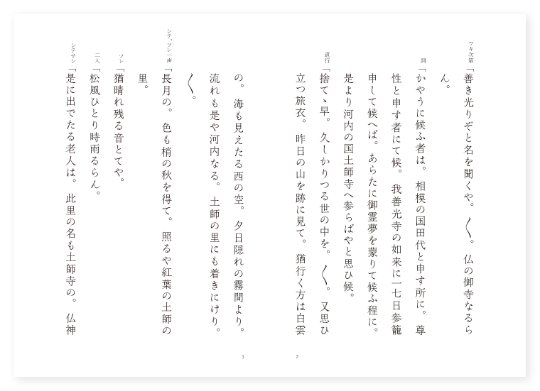 世阿弥作 前 ワキ 僧尊性 シテ 宮人 ツレ 同じく 後 シテ 白太夫 ツレ 天女 地は 河内 季は 九月 ワキ次第「善き光りぞと名を聞くや。〳〵。仏の御寺なるらん。 詞「かやうに候ふ者は。相模の国田代と申す所に。尊性と申す者にて候。我善光寺の如来に一七日参籠申して候へば。あらたに御霊夢を蒙りて候ふ程に。是より河内の国土師寺へ参らばやと思ひ候。 道行「捨てゝ早。久しかりつる世の中を。〳〵。又思ひ立つ旅衣。昨日の山を跡に見て。猶行く方は白雲の。海も見えたる西の空。夕日隠れの霧間より。流れも是や河内なる。土師の里にも着きにけり。〳〵。 シテ、ツレ一声「長月の。色も梢の秋を得て。照るや紅葉の土師の里。 ツレ「猶晴れ残る音とてや。 二人「松風ひとり時雨るらん。 シテサシ「是に出でたる老人は。此里の名も土師寺の。仏神に仕へ申す者なり。 二人「有難や利生はさま〴〵多けれども。わきて誓ひも陰高き。天満神の宮寺に。歩みを運ぶ御値遇。実に身を知れば心なき。我等が為めは頼もしや。 下歌「いざや歩みを運ばん。〳〵。 上歌「神さぶる。松は十かへり千代の秋。〳〵。霜を重ねて下草の。露の身ながらながらへて。神に仕へ奉る。宮路久しき瑞籬の。深き誓ひは有難や。〳〵。 ワキ詞「如何に是なる宮人に申すべき事の候。 シテ詞「此方の事にて候ふか何事にて候ふぞ。 ワキ「是は善光寺の如来の御夢想により。遥々当寺に参りて候。寺中の人に逢ひ申し。御夢想の様を語り申したく候。 シテ「不思議なる事を承り候ふ物かな。まづ御夢想の様を此老人に御物語り候へ。某承つて寺中の人々へ広め申し候ふべし。 ワキ「あら嬉しや候。さらば委しく申し候ふべし。寺中の人々に御広め候へ。 シテ「心得申し候。 ワキ「是は相模の国田代と申す所に。尊性と申す聖にて候ふが。我念仏往生の志有るにより。此度信濃の国善光寺へ参り。一七日参籠申す処に。如来御厨子の御戸を開き。香の衣に香の袈裟かけ給ひたる老僧の。あらたなる御声にて。汝念仏往生の志誠に懇なり。然らば五畿内河内の国土師寺は。天神の御在所なり。彼所の神明を始め奉り。七社の神々を勧請申されたり。又天神は一切衆生現当二世の為め。五部の大乗経を書き供養して埋まれたり。其軸より木槵樹の木生ひ出でたり。其木の実を取り数珠とし。念仏百万遍申さば。往生疑ひあるまじきと承つて夢覚めぬ。なんぼう有難き御夢想候ふぞ。 シテ「かゝる有難き御事こそ候はね。やがて寺中の人々に触れ申し候ふべし。まづ唯今仰せられ候ふ木槵樹を見せ申し候ふべし。此方へ御出で候へ。 ワキ「さらばやがて御供申し候ふべし。 シテ「是に神明を始め奉り。七社の神々をいはひ申され候。又此方なるは天神にて御座候。あれに見えたるこそ。唯今御物語り候ふ木槵樹にて候ふよく〳〵御拝み候へ。 ワキ詞「有難や神も仏も同一体とは申せども。天神同意の御結縁今始めて承り候。 ツレ「うたての聖の仰せやな。今に始めぬ天神の。弥陀一体の御値遇。天神と申すに其御本地。救世観音にてましまさずや。 ワキ「実に〳〵是は理なり。昔在霊山名法華。 シテ「今在西方名阿弥陀。 ワキ「娑婆示現観世音。 シテ「三世利益同一体。 ワキ「其外神や。 シテ「仏とは。 地「唯是れ水波の隔てにて。神仏一如なる寺の名の。道明らかに曇らぬ。神の宮寺ぞ尊き。有難し〳〵。実に神力も仏説も。同じ和光の影に来て。拝むぞ尊かりける。〳〵。 地クリ「それ仏の昔神の今。後五の時代に至るまで。神も濁世に応じ給ひて。暫く西都に移り給ふ。 シテサシ「如月下の五日にして。都を出でさせ給ひつゝ。 地「此土師の里に旅宿あつて。様々の御神物をとゞめ。末代値遇の御結縁。今に絶ゆる事なし。 シテ「かくても留まらぬ道のべの。 地「草葉の露もしをるゝばかり。 クセ「君が住む。宿の梢を行く〳〵も。隠るゝまでに。帰り見ぞするとの御詠め。留こそと知るぞかたじけなき。さてもいつしかに。ならはせ給はぬ旅の空。名におふ心筑紫とて。天ざかる鄙の国に。住まはせ給ひしかば。あたりは都府楼の瓦。観音寺の鐘の声。明暮に響く折々は。都の春秋を。思し召し出でぬ時はなし。 シテ「家をはなれて三四月。 地「落つる涙は百千行。万事は皆夢の如し。より〳〵彼蒼を期すといふ。其御心の至りにや。昨日は北闕に悲しみをかうぶつしたり。今日は西都に恥を清むる屍たりと。御神感あらたに。生きての恨み死しての悦び。普しや天満。陽感ぞめでたかりける。 ロンギ地「実に有難や草も木も。〳〵。皆成仏の木の実まで。玉を連ぬる光りかな。 シテ「枯れたる木にだにも。誓ひの花は咲くぞかし。ましてや面前木槵樹。花咲き実なる御覧ぜよ。 地「実にや花咲き実なるなる。梢の色もあらたにて。 シテ「法を称ふる理を。 地「思の玉の。 シテ「おのづから。 地「あの梢の木の実こそ。此数珠の御法なれ。必ず授け申さんとて。帰ると見れば立ち留りて。我は天神の御使。名をば誰とか白太夫の。