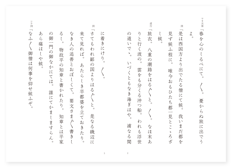 世阿弥作 前 ワキ 旅僧 シテ 里人 後 ワキ 前に同じ シテ 平知章 地は 播磨 季は 春二月 ワキ次第「春を心のしるべにて。〳〵。憂からぬ旅に出でうよ。 詞「是は西国方より出でたる僧にて候。我いまだ都を見ず候ふ程に。唯今おもひたち都一見とこゝろざし候。 道行「旅衣。八重の潮路をはる〴〵と。〳〵。なほ末ありと行く波の。雲をも分くる沖つ船。われも浮世の道いでゝ。いづくともなき海ぎはや。浦なる関に着きにけり。〳〵。 詞「さてもわれ鄙の国よりはる〴〵と。是なる磯辺に来て見れば。あたらしき卒都婆を立ておきたり。なき人の追善とおぼしくて。要文さま〴〵書きしるし。物故平の知章と書かれたり。知章とは平家の御一門の御なかにては。誰にてかましますらん。あら痛はしや候。 シテ詞「なふ〳〵御僧は何事を仰せ候ふぞ。 ワキ詞「是は遠国より上りたる僧にて候ふが。是なる卒都婆を見れば。物故平の知章と書かれて候。御一門の御中にて候ふやらんと痛はしく存じ。一遍の念仏を廻向申して候。 シテ「げに〳〵遠国の人にてましませば。知ろしめさぬは御ことわり。知章とは相国の三男新中納言知盛の御子にて候。二月七日の合戦に。この一の谷にて討たれさせ給ひて候。されば其日も今日にあたりたれば。ゆかりの人の立てたる卒都婆にて候。時もこそあれ御僧の。今日しもこゝに来り給ひ。廻向し給ふありがたさよ。一樹の陰一河の流。是れ又他生の縁なるべし。よく〳〵弔ひ給ひ候へ。 ワキ「げに〳〵仰せのごとく。他生の縁のあればこそ。かりそめながらこゝに来て。 シテ「無縁の利益をなす事よと。 ワキ「思ひの玉の数くりて。 シテ「とぶらふ事よさなきだに。 シテ、ワキ「一見卒都婆永離三悪道。何況造立者。必生安楽国。物故平の知章成等正覚。 下歌地「きのふは人の上。けふは我をも知らぬ身の。しかも弓馬の家人ならば。法にひかれつゝ。仏果に至り給へや。 上歌「唯一念の功力だに。〳〵。三悪の罪は消えぬべし。まして妙にも説く法の。道のほとりの亡き跡を。逆縁もなどかなかるべき。〳〵。 ワキ詞「さて知盛の御最期は何とかならせ給ひて候ふぞ。 シテ詞「さん候知盛は。あれに見えたる釣舟のほどなりし。遥の沖の御座船に。追ひつき助かり給ひて候。 ワキ「さてあれまでは小船にめされて候ふか。 シテ「いや馬上にて候ひし。其頃井上黒とて屈竟の名馬たりしが。二十余町の海の面を。やす〳〵とおよぎわたり。主を助けし馬なり。されども船中に所なかりし間。のする人もなくして。又もとの汀におよぎあがり。此馬ぬしの別れを慕ふかと思しくて。沖の方に向ひ高嘶きし。足搔きしてぞ立つたりける。畜類も心ありけるよと。見る人あはれを催しけり。 地「越鳥南枝に巣をかけ。胡馬北風に嘶えしも。旧郷を忍ぶ故なりとか。胡馬は北風をしたひ。此馬は西にゆく船の。纜につながれても。ゆかばやと思ふ心なり。 ロンギ地「さるほどに。日もはや暮れて須磨の浦。海人の磯屋にやどりして。逆縁ながらとぶらはん。 シテ「げに有難や我とても。よそ人ならず一門の。内外にかよふ夕月の。後の世の暗を訪ひたまへ。 地「そも一門の内ぞとは。御身いかなる人やらん。 シテ「今は何をか包井の。水がくれて住むあはれ世に。 地「亡き跡の名は。 シテ「白真弓の。 地「帰るかたを見れば。須磨の里にも野山にも。行かで汀のかたをなみ。蘆辺をさしてゆく田鶴の。浮きぬ沈むと見えしまゝに。うしろかげも失せにけりや。うしろかげも失せにけり。(中入) ワキ歌「夕波千鳥友寐して。〳〵。処も須磨の浦づたひ。野山の風もさえかへり。心も墨の衣手に。此御経を読誦する。〳〵。 後ジテ一声「あら有難の御弔ひやな。われ修羅道のくるしみの。ひまなき内にかくばかり。魄霊にひかれて来りたり。浮ぶべき。波こゝもとや須磨の浦。 地「海すこしある通路の。 シテ「うしろの山風上野のあらし。 地「草木国土有情非情も。悉皆成仏の。彼岸の海ぎはに。浮び出でたる有難さよ。 ワキ「ふしぎやなさもなまめきたる若武者の。波にうかびて見え給ふは。いかなる人にてましますぞ。 シテ詞「誰とはなどやおろかなり。御弔ひのありがたさに。知章これまで参りたり。 ワキ「さては平家の公達を。まのあたりに見たてまつる事よと。昔にかへる浦波の。 シテ「浮織物の直垂に。妻にほひの鎧着て。 ワキ「さも花やかなる御姿。 シテ「所もさぞな。 ワキ「須磨の浦に。 地「おぼろなる。仮の姿や月のかげ。〳〵。うつす絵島の島がくれ。行く船を。惜しとぞ思ふ我父に。わかれし船影の。あと白波もなつかしや。よしとても終にわが。憂き身を捨てゝ西海の。藻屑となりし浦の波。かさねて訪ひてたび給へ。〳〵。 ワキ詞「さらば其時の有様くはしく御物語り候へ。 地クリ「さても其時の有様かたるにつけて憂き名のみ。龍田の山の紅葉ばの。くれなゐ靡く旗のあし。ちり〴〵になるけしきかな。 シテサシ「主上二位殿をはじめ奉り。其外おほいどの父