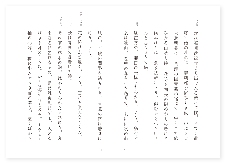 観世元雅作 前 ワキ 清凉寺の僧 シテ 青墓長者の娘 トモ 従者 後 ワキ 前に同じ ワキヅレ 伴僧 シテ 大夫進朝長 地は 美濃 季は 春正月 ワキ詞「是は嵯峨清凉寺より出でたる僧にて候。さても此度平治の乱れに。義朝都を御ひらき候。中にも大夫進朝長は。美濃の国青墓の宿にて自害し果て給ひたる由承り候。我等も朝長の御ゆかりの者にて候ふほどに。急ぎ彼所に下り。御跡をも弔ひ申さんと思ひ立ちて候。 道行「近江路や。瀬田の長橋うちわたり。〳〵。猶行すゑは鏡山。老曽の森を打ち過ぎて。末に伊吹の山風の。不破の関路を過ぎ行き。青墓の宿に着きにけり。〳〵。 シテ、トモ次第「花の跡訪ふ松風や。〳〵。雪にも恨みなるらん。 シテ「是は青墓の長者にて候。 シテ、トモ「それ草の露水の泡。はかなき心のたぐひにも。哀を知るは習ひなるに。是は殊更思はずも。人のなげきを身のうへに。かゝる涙の雨とのみ。しをるゝ袖の花薄。穂に出だすべき言の葉も。泣くばかりなる有様かな。 下歌「光りの陰を惜しめども。月日の数は程ふりて。 上歌「雪の内。春は来にけりうぐひすの。〳〵。氷れる涙今は早。解けても寝ざれば夢にだに。御面影の見えもせで。痛はしかりし有様を。思ひ出づるもあさましや。〳〵。 シテ詞「ふしぎやな此御墓所へ我ならでは。七日々々に参り。御跡弔ふものもなきに。旅人と見えさせ給ふ御僧の。涙をながし懇に弔ひ給ふは。如何なる人にてましますぞ。 ワキ詞「さん候是は朝長の御ゆかりの者にて候ふが。御跡弔ひ申さんため是まで参りて候。 シテ「御ゆかりとはなつかしや。さて朝長の御ため如何なる人にてましますぞ。 ワキ「是は朝長の御めのと何某と申す者にて候ひしが。さる事有りて御暇たまはり。はや十箇年に余り。かやうの姿となりて候。とくにも罷り下り。御跡弔ひ申したくは候ひつれども。怨敵のゆかりをば。出家の身をも許さねば。抖擻行脚に身をやつし。忍びて下向仕りて候。 シテ「さては取り分きたる御なじみ。さこそは思し召すらめ。わらはも一夜の御宿りに。あへなく自害し果て給へば。たゞ身のなげきの如くにて。かやうに弔ひ参らせ候。 ワキ「実に痛はしや我とても。もと主従の御契り。是も三世の御値遇。 シテ「わらはも一樹の陰のやどり。他生の縁と聞く時は。実に是とても二世のちぎりの。 ワキ「今日しも互にこゝにきて。 シテ「弔ふ我も。 ワキ「朝長も。 地「死の縁の。所も逢ひに青墓の。〳〵。跡のしるしか草の陰の。青野が原は名のみして。古葉のみの春草は。さながら秋の浅茅原。荻の焼原の跡までも。げに北邙の夕煙。一片の雲となり。消えし空は色も形も。なき跡ぞあはれなりける。〳〵。 ワキ詞「如何に申し候。朝長の御最期の有様くはしく語つて御きかせ候へ。 シテ「申すにつけて痛はしや。暮れし年の八日の夜に入りて。門を荒けなく敲く音す。誰なるらんと尋ねしに。鎌田殿と仰せられしほどに門を開かすれば。武具したる人四五人内に入り給ふ。義朝御親子。鎌田金王丸とやらん。わらはを頼みおぼしめす。明けなば河船にめされ。野間の内海へ御落あるべきとなり。又朝長は。都大崩にて膝の口を射させ。とかく煩ひ給ひしが。夜更け人静まつて後。朝長の御声にて。南無阿弥陀仏南無阿弥陀仏と二声のたまふ。鎌田殿まゐり。こはいかに朝長の御自害候ふと申させ給へば。義朝おどろき御覧ずれば。はや御肌衣も紅に染みて。目もあてられぬ有様なり。其時義朝。何とて自害しけるぞと仰せられしかば。朝長息の下より。さん候都大崩にて膝の口を射させ。既に難儀に候ひしを。馬にかかり是までは参り候へども。今は一足も引かれ候はず。路次にて捨てられ申すならば。犬死すべく候。唯返す〴〵御先途をも見とゞけ申さで。かやうになりゆき候ふ事。さこそゆひかひなき者と。おぼしめされ候はんずれども。道にて敵に逢ふならば。雑兵の手にかゝらん事。あまりにくちをしう候へば。是にて御暇たまはらんと。 地「是を最期の御言葉にて。事切れさせ給へば。義朝正清とりつきて。なげかせ給ふ御有様は。よその見る目も。あはれさをいつか忘れん。悲しきかなや。形をもとむれば。苔底が朽骨。見ゆるもの今は更になし。さて其声を尋ぬれば。草径が亡骨となつて。答ふるものも更になし。三世十方の仏陀の聖衆も。あはれむ心あるならば。亡魂幽霊も。さこそうれしとおもふべき。 地「かくて夕陽かげうつる。〳〵。雲たえ〴〵に行く空の。青野が原の露わけて。彼旅人を伴ひ。青墓の宿に帰りけり。〳〵。 シテ詞「御僧に申し候。見ぐるしく候へども。しばらく是に御逗留候ひて。朝長の御跡御心しづかに弔ひ参らせられ候へ。 ワキ詞「誠に御志有難う候。暫くこれに候ふべし。 シテ「誰かある罷り出でゝ御僧に宮仕へ申し候へ。(中入) ワキ「さても幽霊朝長の。仏事はさま〴〵おほけれども。 ツレ「とりわき亡者の貴み給ひし。 ワキ「観音懺法読みたてまつり。 二人歌「声満つや。法の山風月