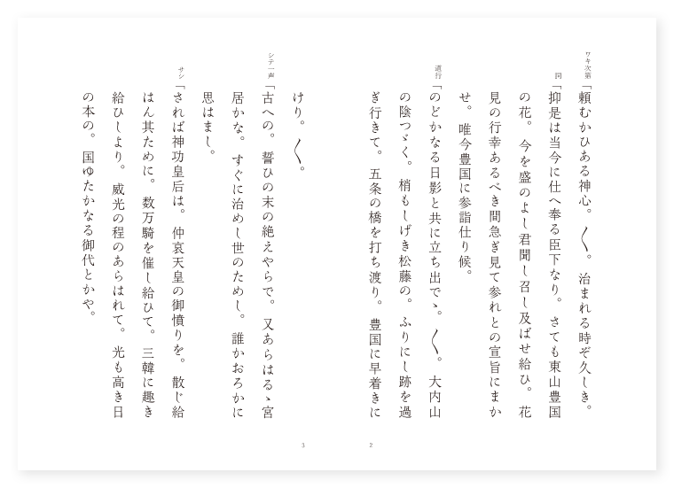 シテ 豊太閤の霊 ツレ 明の臣下遊撃将軍 ツレ 同行唐人 ツレ 神主吉田兼見 ワキ 朝臣 狂言 社人 所 山城東山 時 春 ワキ次第「頼むかひある神心。〳〵。治まれる時ぞ久しき。 詞「抑是は当今に仕へ奉る臣下なり。さても東山豊国の花。今を盛のよし君聞し召し及ばせ給ひ。花見の行幸あるべき間急ぎ見て参れとの宣旨にまかせ。唯今豊国に参詣仕り候。 道行「のどかなる日影と共に立ち出でゝ。〳〵。大内山の陰つゞく。梢もしげき松藤の。ふりにし跡を過ぎ行きて。五条の橋を打ち渡り。豊国に早着きにけり。〳〵。 シテ一声「古への。誓ひの末の絶えやらで。又あらはるゝ宮居かな。すぐに治めし世のためし。誰かおろかに思はまし。 サシ「されば神功皇后は。仲哀天皇の御憤りを。散じ給はん其ために。数万騎を催し給ひて。三韓に趣き給ひしより。威光の程のあらはれて。光も高き日の本の。国ゆたかなる御代とかや。 下歌「天が下静に守る明暮に。 上歌「年ふれば生ひ立ちにける緑子の。〳〵。影は千年の末までも。猶いやましに栄えよと。祈る心の疎なき。高き山深き海にも喩ふべき。親の恵は有難や。げにや老いせず死せずとの。其古事ぞ頼もしき。〳〵。 ワキ詞「如何に是なる人に申すべき事の候。 シテ詞「こなたの事にて候ふか何事にて候ふぞ。 ワキ「御身は当社の宮つこにて渡り候ふか。 シテ「さん候当社に故ある者にて候。 ワキ詞「見申せば美しき玉箒を持ち給ひ候ふは。如何なる謂れにて候ふぞ。 シテ「さん候此明神は花にふけり給ひ惜しませ給ふにより。かやうに一葉をもかき集めて候。 ワキ「是は勅使にて候ふが。当社の花盛のよし君聞し召され。行幸あるべき間見て参れとの勅諚にて。唯今是まで参りて候。 シテ「さては勅使にて候ふぞや。有難や君としてだに当社の花を叡覧あるべきとの御事なるに。都の外には住み候へども。朝夕此花に戯れ候ふ事。老が身の思出にてこそ候へ。けふも又桜に宿る狩衣。きつゝ馴れゆく春の山風。ふる事ながら思ひ出でられて候。 ワキカヽル「不思議なりとよ老人は。たゞ人ならぬ御気色なり。まづ〳〵当社の御来歴。委しく語り給ふべし。 シテクリ「抑此豊国大明神と申すは。本地八幡の御再誕にて。かりに和光の塵に交はり給ひ。東夷西戎南蛮北狄。御心のまゝに切り随へ給ひて。四海泰平なりし故に。今の代までも静なり。 サシ「然るに此御神の。遷宮ならぬ御時は。 地「太閤大相国秀吉公と申し奉りしが。種々の智略をめぐらし給ひて。都鄙安全に静まりて。先は津の国大阪の辺に御座を定め。玉楼金殿軒を並べ。又は山城や。伏見の里の宮作り。 シテ「金屋に花をかざり。 地「昼夜の栄花は喩へもなし。ひとへに天下の誉れとかや。 クセ「されば此君は。文武両道に疎からず。英雄の心をとり。功ある物を賞禄し。志を衆に通ず。賊を討つて怨を報ずる事は。義の決なり。惻隠の心は。仁の発なりと思し召して。土民を憐れみ給へば。仮初の出御をも。唯日月の如くに。拝せぬ者はなかりけり。金玉の台に。美玉の数をすゑおき。御遊のみに送る世の。新玉の春の朝には。吉野醍醐の花見にも。花やかなりし装ひを。今見るやうに思はるゝ。 シテ「吹きすさび空の浮雲心せよ。 地「花の盛の紅葉するまでと。連ね給ひし歌故に。曇りし空も晴れ明り。吹く風も枝を鳴らさず。天も納受し。鬼神も感をなすとかや。我は豊国の神なるが。勅使に逢はん其為に。こゝに顕はれ出でたり。暫く待ち給へと。朱の玉垣に入り給ふ。玉垣の内に入り給ふ。 ワキ上歌「夜もすがら花の木陰に枕して。〳〵。猶も奇特を見るべしと。夢待ち顔の今宵かな。〳〵。 唐人次第「道の道たる時とてや。〳〵。豊国の宮居あふがん。 詞「かやうに候ふ者は唐大明の臣下。游撃将軍とは我事なり。さても日本国太閤大相国の武勇一天四海に隠れなきにより。度々御調物を備へ申して候。又此頃は豊国大明神とならせ給ひ。猶以て御威光あまねきよし承り候ふ間。宮居を拝み申さんために。只今日本に趣き候。 道行「東海の波路をしのぎ行く舟の。〳〵。入日の影を跡に見て。月の出でくる雲間より。山見えそめて日の本の。筑紫の地をも漕ぎ過ぎて。雁の翼の門司の関。厳島根や須磨明石。淡路島山程近き堺の浦に着きにけり。〳〵。 下歌「心とめなば何くにも。住吉の浜や難波江の。角ぐむ蘆辺分け過ぎて。四方の梢も時めける。花の都の東山。豊国の社を。拝むぞ尊かりける。〳〵。 唐人ツレ「如何に神職の人の渡り候ふか。唐より游撃将軍の御参りにて候。明神に供物の候御備へ候へ。 神主「さん候某こそ神職の者にて候へ。御捧物の候はゞこなたへ給はり候へ。 唐人ツレ「是は夜光の玉とて楚王の持ち給ひし宝にて候。 神主カヽル「吉田の兼見承り。神前に参り宝珠を備へ。幣帛を捧げつゝ。同じく祝詞を参らせければ。 地「唐人も諸共に拝殿に。伺候して。伎楽をこそは奏しけれ。 神主詞「如何に游撃へ申し候。神前に於て一さし御舞ひ候へ。 唐人「心