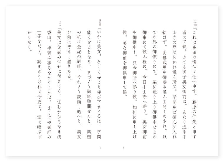 世阿弥作 シテ 藤原仲光 ツレ 多田満仲 子方 美女丸 同 幸寿 狂言 仲光従者 ワキ 恵心僧都 地は 摂津 季は 雑 シテ詞「これは多田の満仲に仕へ申す。藤原の仲光と申す者にて候。さても御子美女御前は。あたり近き中山寺に登せおかれ候ふ所に。学問をば御心に入れ給はず。明暮武勇を御嗜み候ふ由聞しめされ。以ての外の御憤りにて。某に罷り上り御供申せとの御事にて候ふ程に。今日中山寺へ参り。美女御前を御供申し。只今御所へ参り候。如何に申し上げ候。美女御前を御供申して候。 満仲詞「いかに美女。久しく寺より呼び下さゞるは。学問能くせよとなり。まづ〳〵御経聴聞せんと。紫檀の机に金泥の御経。それ〳〵読誦し給へと。美女が前にぞさし置きたる。 美女「美女は父御の仰せに付きても。住むかひもなき浅香山。手習ふ事もなかりしかば。ましてや御経の一字をだに。読まざりければ今更に。涙に咽ぶばかりなり。 満仲詞「実に〳〵満仲が子なれば。一寺の賞翫隙を得ず。御経よまぬは理なれ。さて歌は。 美女「よみ得ず候。 満仲「管絃は。問へども言はぬ口なしの。 地「こは誰が為めなれば。父がさしもに言ひし事に。跡をつけぬ庭の雪。人に見せんもなにがしが。子といふかひもなかるべしとて。御佩刀を取り給へば。走りいづるや仲光が。中にて兎角御袖に。取り付きすがり申しつゝ。危き美女御前の。御身の程ぞいたはしき。 満仲詞「いかに仲光。心をしづめて聞き候へ。子供を寺へ登せおくは。学問の為にてこそ候へ。明暮武勇を嗜まんには。寺に置きてのかひは何事ぞ。 シテ詞「御諚尤にて候ふさりながら。折々の御折檻にてこそ候へ。先々御佩刀を賜はり候へ。 満仲「所詮美女を討つて参り候へ。さなきものならば。明神氏の神も御知見あれ。仲光共にそのまゝには置くまじきぞ。 シテ「何事も御諚をば背き申すまじく候。まづ〳〵御内へ御入り候へ。 シテ詞「言語道断。以ての外の御怒りにて候。御叱り有るべきとは存じ候へども。かほどまでとは存ぜず候。いや〳〵何と仰せ候ふとも。一まづ落し申さばやと存じ候。いかに申し上げ候。只今は余りの御怒りにて。某も迷惑仕りて候。 美女「如何に仲光。只今自を逃しつるは。仲光が制するによれり。美女を討つて参らせよと怒り給ふを。我物ごしに聞きしなり。はや自が首を取り。父御の御目にかけ候へ。 シテ「げに〳〵健気なる事を仰せ候ふ物かな。所詮何と仰せ候ふとも。一まづ落し申さうずるにて候。や。何と申すぞ。又御使の立ちたると申すか。あら笑止や。さて何と仕り候ふべき。げにや何事も報い有りける憂き世かな。 詞「伝へきく阿闍世太子は頻婆娑羅を害せずや。是れ皆宿縁かくの如し。 美女「過去にてなせば。 シテ「現世にやがて。 地「報いは人の咎ならじ。只自が為すところを。愚にや恨みある。憂き世の中と思ふらん。たがひに憂き事を。語り語れば時移る。はや首とれや仲光と。言の葉も涙も。すゝむこそ悲しかりけれ。 シテ詞「あはれ某御年の程にて候はゞ。御命に代り候はんずるものを。惜しからぬ命も事によりて。心にまかせぬ口をしさは候。 幸寿詞「いかに父上。只今の御言葉こそ。幸寿が耳に留まりて候へ。早自が首を取り。美女御前と仰せ候ひて。主君の御目に掛けられ候へ。 シテ「何と申すぞ。美女御前の御命に代らうずると申すか。さすが仲光が子にて候。げに〳〵汝が首を取り薄衣に包み。夜まぎれに遠々と御目にかくるならば。さすが親子の御事なれば。よもさだかには御覧じ候ふまじ。さらば御命に代り候へ。時刻移りて叶ふまじと。太刀おつ取つて仲光は。我子の後に立ちよれば。 美女「美女は余りの悲しさに。仲光が袂にすがりつゝ。たとひ幸寿を失ふとも。共に自害に及ぶべしと。泣きかなしみて制すれば。 シテ「なふお主の命に代る事。弓矢取る身の習ひなり。 美女「悲しやな互に争ふ命の際。 幸寿「幸寿もすゝみ。 美女「美女も立ちよる。 幸寿「かなたは主君。 シテ「此方は思ひ子。 美女「中にてなか〳〵。 シテ「仲光が。 地「身は是程に惜しからじ。何とかせましとやあらんと。猛き心にも。弱り果てたるけしきかな。 美女「親にだに。惜しまれぬ身を何とたゞ。かく思ふらん中々に。情のつらさ如何ならん。 幸寿「情は人の為ならじ。今此際の御命に。代り申さずは。弓矢の家の名ぞ惜しき。 地「かなたこなたも幼き。御身にだにも理の。或は御主子は惜しゝ。主君をば如何で手にかけんと。心よわしや白真弓。ゆん手に有るは我子ぞと。思ひ切りつゝ親心の。闇討に現なき。我子を夢となしにけり。〳〵。 狂言詞「シカ〳〵。 シテ詞「げに〳〵汝が申す如く。某が心中さつし候へ。又美女御前を御供申し。何方へも立ち退き候へ。 シテ詞「如何に申し上げ候。美女御前を討ち奉りて候。 満仲詞「いしくも仕りたるものかな。さこそ最期の未練に有りつらんな。 シテ「いやさは御座なく候。某太刀抜き持つて。少しためらひ候ふところに。やあいかに仲光お
