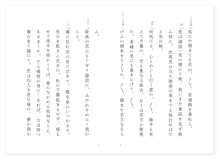世阿弥作 前 ワキ 旅僧 シテ 里男 ツレ 里女 後 ワキ 前に同じ ツレ 前に同じ シテ 里男の亡霊 地は 陸奥 季は 秋 ワキ次第「実にや聞きても忍山。〳〵。其通路を尋ねん。 詞「是は諸国一見の僧にて候。我いまだ東国を見ず候ふ程に。此度思ひ立ち陸奥の果までも修行せばやと思ひ候。 道行「何処にも。心とめじと行く雲の。〳〵。旗手も見えて夕暮の。空も重なる旅衣。おくは其方か陸奥の。希婦の里にも着きにけり。〳〵。 シテ、ツレ次第「けふの細布をり〳〵の。〳〵。錦木や名立なるらん。 シテサシ「陸奥の忍ぶもじずり誰故に。みだれそめにし我からと。 二人「藻に住む虫の音に泣きて。壁生草のいつかさて。思ひを乾さん衣手の。杜の下露起きもせず。寐もせで夜半を明かしては。春のながめも如何ならん。あさましや。そも幾程の身にしあれば。なほ待つ事の有り顔にて。思はぬ人を思ひ寐の。夢か現か寐てか覚めてか。是や恋慕のならひなる。 下歌「徒に。過ぐる心は多けれど。身になす事は涙川。流れて早き月日かな。〳〵。 上歌「実にや流れては。妹背の中の川と聞く。〳〵。吉野の山は何処ぞや。こゝは又。心の奥か陸奥の。けふの郡の名にしおふ。細布の。色こそ変はれ錦木の。千度百夜いたづらに。悔しき頼みなりけるぞ。悔しき頼みなりける。 ワキ詞「不思議やな是なる市人を見れば。夫婦と思しくて。女性の持ち給ひたるは鳥の羽にて織りたる布と見えたり。又男の持ちたるは美しく色どり飾りたる木なり。何れも〳〵不思議なる売物かな。是は何と申したる物にて候ふぞ。 ツレ詞「是は細布とて機ばり狭き布なり。 シテ詞「是は錦木とて色どり飾れる木なり。いづれも〳〵当所の名物なり。これ〳〵召され候へ。 ワキ「実に実に錦木細布の事は承り及びたる名物なり。さて何故の名物にて候ふやらん。 ツレ「うたての仰せ候や。名におふ錦木細布の。其かひもなくよそまでは。聞きも及ばせ給はぬよなふ。 シテ詞「いや〳〵それも御理。其道々に縁なき事をば。何とて知ろしめさるべき。 二人「見奉れば世を捨人の。恋慕の道の色に染む。此錦木や細布の。知ろしめさぬは理なり。 ワキ「あら面白の返答やな。さて〳〵錦木細布とは。恋路によりたる謂よなふ。 シテ詞「中々の事三年まで。立て置く数の錦木を。日毎に立てゝ千束ともよみ。 ツレ「又細布は機ばりせばくて。さながら身をも隠さねば。胸合ひ難き恋ともよみて。 シテ「恨みにも寄せ。 ツレ「名をも立てゝ。 シテ「逢はぬを種と。 ツレ「よむ歌の。 地「錦木は。立てながらこそ朽ちにけれ。〳〵。けふの細布胸合はじとやと。さしもよみし細布の。機ばりもなき身にて。歌物語恥かしや。実にや名のみは岩代の。松の言の葉取り置き。夕日の影も錦木の。宿りにいざや帰らん。〳〵。 ワキ詞「猶々錦木細布の謂御物語り候へ。 シテ詞「昔より此所の習ひにて。男女の媒には此錦木を作り。女の家の門に立つるしるしの木なれば。美しく色どり飾りて之を錦木と云ふ。さる程に逢ふべき男の錦木をば取り入れ。逢ふまじきをば取り入れねば。或は百夜三年までも立てしによつて千束ともよめり。又此山陰に錦塚とて候。是こそ三年まで錦木立てたりし人の古墳なれば。取り置く錦木の数ともに塚に築きこめて。之を錦塚と申し候。 ワキ詞「さらば其錦塚を見て。故郷の物語にし候ふべし。教へて賜り候へ。 シテ「あういで〳〵さらば教へ申さん。 ツレ「此方へ入らせ給へとて。 二人「夫婦の者は先に立ち。彼旅人を伴ひつゝ。 地「けふの細道分け暮らして。錦塚は何処ぞ。彼岡に。草刈る男心して。人の通路あきらかに。教へよや道芝の。露をば誰に問はまし。真如の玉は何処ぞや。求めたくぞ覚ゆる。 シテ「秋寒げなる夕まぐれ。 地「嵐木枯村時雨。露分けかねて足引の。山の常蔭も物さび。松桂に鳴く梟。蘭菊の花に隠るなる。狐住むなる塚の草。紅葉ば染めて錦塚は。是ぞと言ひ捨てゝ。塚の内にぞ入りにける。夫婦は塚に入りにけり。(中入) ワキ歌「男鹿の角の束の間も。〳〵。寝られん物か秋風の。松の下臥夜もすがら。声仏事をやなしぬらん。〳〵。 ツレ「如何に御僧。一樹一河の流れを汲むも。他生の縁ぞと聞く物を。ましてや値遇のあればこそ。かく宿りする草の枕の。夢ばし覚まし給ふなよ。あら貴の御法やな。 後ジテ「あら有難の御弔ひやな。二世とかねたる契りだにも。さしも三年の日数つもる。此錦木の逢ひ難き。法の値遇の有難さよ。いで〳〵姿を見え申さん。今こそは。色に出でなん錦木の。 地「三年は過ぎぬいにしへの。 シテ「夢又夢に。今宵三年の値遇に。今ぞ帰るなれと。 地「尾花が本の思草の。陰より見えたる塚の幻に。顕はれ出づるを御覧ぜよ。 シテ「いふならく。奈落の底に入りぬれば。刹利も首陀も変はらざりけり。かはらざりけり。あら恥かしや。 ワキ「不思議やなさも古塚と見えつるが。内はかゝやく灯の。影明らかなる人家の内に。機物を立て錦木を積みて。昔を顕は