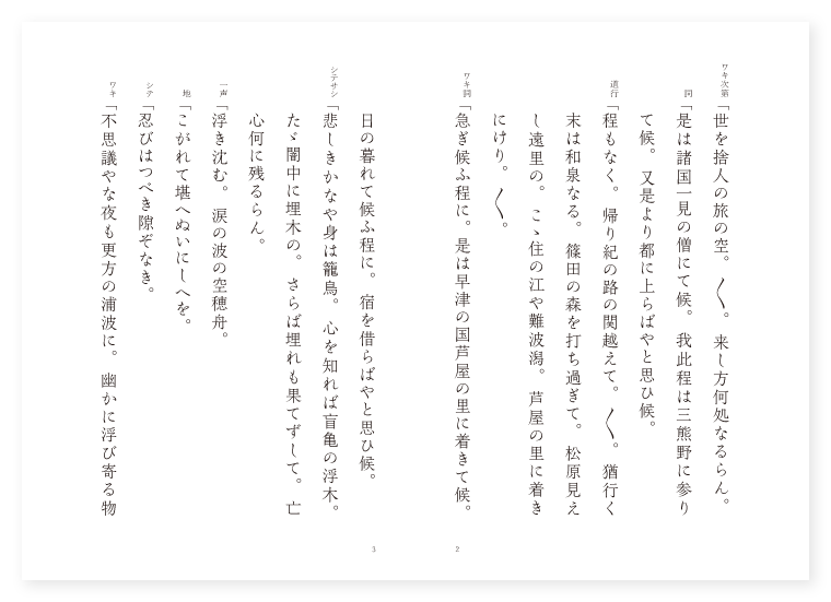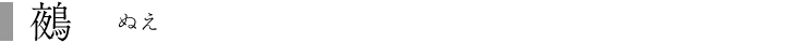 世阿弥作 前 ワキ 旅僧 シテ 船人 後 ワキ 前に同じ シテ 鵺の霊 地は 摂津 季は 四月 ワキ次第「世を捨人の旅の空。〳〵。来し方何処なるらん。 詞「是は諸国一見の僧にて候。我此程は三熊野に参りて候。又是より都に上らばやと思ひ候。 道行「程もなく。帰り紀の路の関越えて。〳〵。猶行く末は和泉なる。篠田の森を打ち過ぎて。松原見えし遠里の。こゝ住の江や難波潟。芦屋の里に着きにけり。〳〵。 ワキ詞「急ぎ候ふ程に。是は早津の国芦屋の里に着きて候。日の暮れて候ふ程に。宿を借らばやと思ひ候。 シテサシ「悲しきかなや身は籠鳥。心を知れば盲亀の浮木。たゞ闇中に埋木の。さらば埋れも果てずして。亡心何に残るらん。 一声「浮き沈む。涙の波の空穂舟。 地「こがれて堪へぬいにしへを。 シテ「忍びはつべき隙ぞなき。 ワキ「不思議やな夜も更方の浦波に。幽かに浮び寄る物を。見れば聞きしに変らずして。舟の形は有りながら。唯埋木の如くなるに。乗る人影もさだかならず。あら不思議の者やな。 シテ「不思議の者と承る。其方は如何なる人やらん。もとより憂き身は埋木の。人知れぬ身とおぼしめさば。不審な為させ給ひそとよ。 ワキ「いや是は唯此里人の。さも不思議なる舟人の。夜々来ると言ひつるに。見れば少しも違はねば。我も不審を申すなり。 シテ「此里人とは蘆の屋の。灘の塩焼く海士人の。類ひを何と疑ひ給ふ。 ワキ「塩焼く海士の類ひならば。業をば為さで暇ありげに。夜々来るは不審なり。 シテ「実に〳〵暇の有る事を。疑ひ給ふも謂あり。古き歌にも蘆の屋の。 ワキ「灘の塩焼き暇なみ。黄楊の小櫛は刺さず来にけり。 シテ「我も憂きには暇なみの。 ワキ「汐にさゝれて。 シテ「舟人は。 地「さゝで来にけり空穂舟。〳〵。現か夢か明けてこそ。みるめも刈らぬ蘆の屋に。一夜寝て海士人の。心の闇を弔ひ給へ。有難や旅人は。世を遁れたる御身なり。我は名のみぞ捨小舟。法の力を頼むなり。〳〵。 ワキ詞「何と見申せども更に人間とは見えず候。如何なる者ぞ名を名乗り候へ。 シテ詞「是は近衛の院の御宇に。頼政が矢先にかゝり。命を失ひし鵺と申しゝものゝ亡心にて候。其時の有様委しく語つて聞かせ申し候ふべし。跡を弔うて賜はり候へ。 ワキ「さては鵺の亡心にて候ふか。其時の有様委しく語り候へ。跡をば懇に弔ひ候ふべし。 地クリ「さても近衛の院の御在位の時。仁平の頃ほひ。主上夜な夜な御悩あり。 シテサシ「有験の高僧貴僧に仰せて。大法を修せられけれども。其しるし更になかりけり。 地「御悩は丑の刻ばかりにてありけるが。東三条の森の方より。黒雲一村立ち来つて。御殿の上におほへば。必ずおびえ給ひけり。 シテ「即ち公卿詮議あつて。 地「定めて変化の者なるべし。武士に仰せて警固有るべしとて。源平両家の兵を撰ぜられける程に。頼政を撰び出だされたり。 クセ「頼政其時は。兵庫の頭とぞ申しける。頼みたる郎等には。猪早太。唯一人召し具したり。我身は二重の狩衣に。山鳥の尾にてはいだりける。尖矢二筋。滋籐の弓に取り添へて。御殿の大床に伺候して。御悩の刻限を。今や〳〵と待ち居たり。さる程に案の如く。黒雲一村立ち来り。御殿の上におほひたり。頼政きつと見上ぐれば。雲中に。怪しき者の姿あり。 シテ「矢取つて打ちつがひ。 地「南無八幡大菩薩と。心中に祈念して。よつぴきひやうと放つ矢に。手答へしてはたと当る。得たりやおうと矢叫びして。落つる所を猪早太。つゝと寄りてつゞけさまに。九刀ぞ刺いたりける。さて火を灯し能く見れば。頭は猿尾は蛇。足手は虎のごとくにて。鳴く声鵺に似たりけり。恐ろしなんども。愚かなる形なりけり。 ロンギ地「実に隠れなき世語りの。其一念を翻へし。浮ぶ力となり給へ。 シテ「浮ぶべき。たより渚の浅緑。水のかしはに有らばこそ。沈むは浮ぶ縁ならめ。 地「実にや他生の縁ぞとて。 シテ「時もこそあれ今宵しも。 地「なき世の人に合竹の。 シテ「棹取り直し空穂舟。 地「乗ると見えしが。 シテ「夜の波に。 地「浮きぬ沈みぬ。見えつ隠れ絶々の。幾重に聞くは鵺の声。恐ろしや冷ましや。あら恐ろしや冷ましや。(中入) ワキ歌「御法の声も浦波も。〳〵。皆実相の道弘き。法を受けよと夜と共に。此御経を読誦する。〳〵。一仏成道観見法界。草木国土悉皆成仏。 後ジテ「有情非情皆共成仏道。 ワキ「頼むべし。 シテ「頼むべしや。 地「五十二類も我同性の。涅槃に引かれて真如の月の。夜汐に浮びつゝ是まで来れり。有難や。 ワキ「不思議やな目前に来る者を見れば。面は猿足手は虎。聞きしにかはらぬ変化の姿。あら恐ろしの有様やな。 シテ「さても我悪心外道の変化となつて。仏法王法の障りとならんと。王城近く遍満して。東三条の林頭に暫く飛行し。丑三つばかりの夜な夜なに。御殿の上に飛び下れば。 地「即ち御悩しきりにて。玉体を悩まして。おびえたまいらせ給ふ事も。我なす業よと怒りをなしゝに。思ひもよらざりし