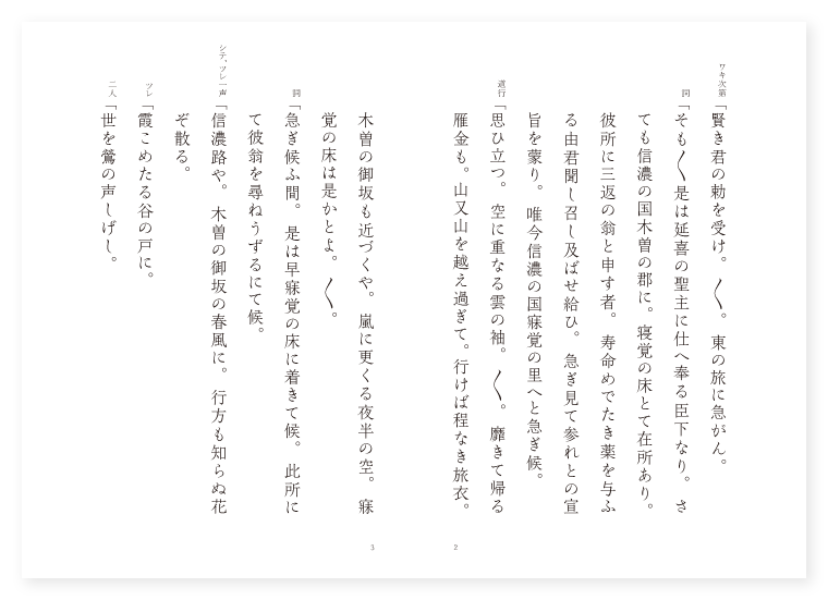 前 ワキ 勅使 シテ 老翁 ツレ 里人 後 シテ 三返の翁 ツレ(謡なし) 天女 ツレ(謡なし) 龍神 地は 信濃 季は 春 ワキ次第「賢き君の勅を受け。〳〵。東の旅に急がん。 詞「そも〳〵是は延喜の聖主に仕へ奉る臣下なり。さても信濃の国木曽の郡に。寝覚の床とて在所あり。彼所に三返の翁と申す者。寿命めでたき薬を与ふる由君聞し召し及ばせ給ひ。急ぎ見て参れとの宣旨を蒙り。唯今信濃の国寐覚の里へと急ぎ候。 道行「思ひ立つ。空に重なる雲の袖。〳〵。靡きて帰る雁金も。山又山を越え過ぎて。行けば程なき旅衣。木曽の御坂も近づくや。嵐に更くる夜半の空。寐覚の床は是かとよ。〳〵。 詞「急ぎ候ふ間。是は早寐覚の床に着きて候。此所にて彼翁を尋ねうずるにて候。 シテ、ツレ一声「信濃路や。木曽の御坂の春風に。行方も知らぬ花ぞ散る。 ツレ「霞こめたる谷の戸に。 二人「世を鶯の声しげし。 シテサシ「所から春立つ山路分け過ぎて。 二人「採るや薪の尾上の鐘。朧々と聞き馴れて。たどるや老の坂ならん。 歌「立ち上る。木曽の麻衣袖しをり。〳〵。賤が家居の業なれば。崖路の橋も馴れ〳〵て。いくへ重なる白雪の。解けて落ち来る谷川の。水も岩根や伝ふらん。〳〵。 ワキ詞「如何に是なる老翁に尋ぬべき事の候。 シテ詞「此方の事にて候ふか何事にて候ふぞ。見奉れば此あたりにては見馴れ申さぬ御姿なり。若し都よりの御下向にて候ふか。 ワキ「実によく見て有る物かな。是は延喜の聖主に仕へ奉る臣下なるが。此所に三返の翁と申す者。寿命めでたき薬を与ふる由君聞し召し及ばせ給ひ。急ぎ見て参れとの宣旨なり。彼老翁が私宅を教へ候へ。 シテ「さては勅使にて御座候ふぞや。あら有難や候。総じて此三返の翁と申すは。生所もあらず出所もなく。 ツレ「唯おのづから其まゝにて。寐覚の枕松が根を。 シテ「宿りと定むる翁なれば。定めてこゝに来るべし。 ワキ「実に〳〵是はいはれたりと。岩根の枕寐覚の床に。 シテ「暫く御待ち候へとよ。 ワキ「暫し休らふ。 シテ「其内に。 地「日も夕暮に程もなく。〳〵。なるや弥生の空なれば。月も朧にさし出でゝ。山の端白き松の風。枝を鳴らさぬ木の下に。暫し休らふ旅居かな。〳〵。 ワキ詞「なほ〳〵寐覚の床の謂委しく御物語り候へ。 クリ地「そもそも此寐覚の床と申すは。役の行者暫く御座をなし給ひて。観念の眠りを覚まし給ふ。 シテサシ「然るに彼三返の老翁は。生所も知らず出所もなく。 地「唯おのづから忽然と。顕はれ出でゝ寐覚の床に。千年を送る其内に。寿命めでたき薬を服し。三度若やぐ故により。三返の翁と名づけたり。 クセ「或る時翁申すやう。羿養射術を伝へて。其名を雲の上にあげ。されば愛染明王は。定の弓恵の矢にて。悪魔を従へ給ふなり。我は又御薬の。威徳を以て大君の。代を治めんと思ふぞと。勅使に申し上げゝれば。勅使喜悦の色をなし。汝如何にと宣へば。 シテ「今は何をか包むべき。 地「我此所に年経たる。三返の翁なるが。目前に来りたり。勅使暫く待ち給へ。夕月の夜もすがら。舞楽を奏し見せ申し。又御薬を与へんと。いふかと見れば老翁は。岩陰に寄ると見えて。行方知らずなりにけり。行方も知らず失せにけり。(中入) 地「天つ風。〳〵。雲の通路吹きとぢよ。乙女の衣色々に。糸竹も音を添へて。波の鼓声澄むや。海青楽を奏しけり。 後ジテ「そも〳〵是は医王仏の化現。無病息災の方便の為め。三返の翁仮に顕はれ出でたるなり。 地「其時老翁扃を開き。〳〵。青天遥かに見渡しければ。 シテ「東南に雲晴れ。西北の風も吹きをさまつて。 地「花降り異香音楽の響き。舞楽の数々乙女の袂。返す〴〵も面白や。 地「夜遊の舞楽も時過ぎて。〳〵。有明方の月も。落ちくる折からに。不思議や川波はげしく荒れて。二龍の姿は顕はれたり。 地「両龍王は川波に浮び。〳〵。彼御薬を捧ぐる気色。汀に坐してぞ見えたりける。 シテ「老翁悦びの思ひをなして。〳〵。彼客人の御慰みに。神通自在の秘術を顕はして。夜遊の戯ぶれなし給ふ。(楽) シテ「かくて時移り頃去れば。 地「かくて時移り頃去れば。彼御薬を君に捧げ。勅使に与へて是までなりと。木曽の桟ゆらりと打ち渡り。帰り給へば。龍神も東西に飛行の翔り。波に戯ぶれ巌に上れば。夜も白々と明方の空に。〳〵。夢の寐覚は覚めにけり。 底本:国立国会図書館デジタルコレクション『謡曲評釈 第四輯』大和田建樹 著