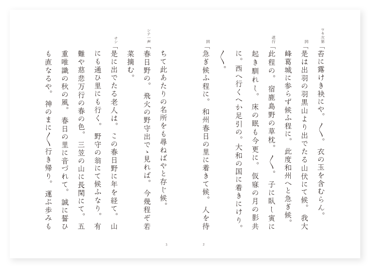 禅鳳作 前 シテ 野守の翁 ワキ 山伏 後 ワキ 前に同じ シテ 鬼 地は 大和 季は 正月 ワキ次第「苔に露けき袂にや。〳〵。衣の玉を含むらん。 詞「是は出羽の羽黒山より出でたる山伏にて候。我大峰葛城に参らず候ふ程に。此度和州へと急ぎ候。 道行「此程の。宿鹿島野の草枕。〳〵。子に臥し寅に起き馴れし。床の眠も今更に。仮寐の月の影共に。西へ行くへか足引の。大和の国に着きにけり。〳〵。 詞「急ぎ候ふ程に。和州春日の里に着きて候。人を待ちて此あたりの名所をも尋ねばやと存じ候。 シテ一声「春日野の。飛火の野守出でゝ見れば。今幾程ぞ若菜摘む。 サシ「是に出でたる老人は。この春日野に年を経て。山にも通ひ里にも行く。野守の翁にて候ふなり。有難や慈悲万行の春の色。三笠の山に長閑にて。五重唯識の秋の風。春日の里に音づれて。誠に誓ひも直なるや。神のまに〳〵行き帰り。運ぶ歩みも積る老の。栄行く御影仰ぐなり。 下歌「唐までも聞えある。此宮寺の名ぞ高き。 上歌「昔し仲麿が。〳〵。我日の本を思ひやり。天の原。ふりさけ見ると詠めける。三笠の山陰の月かも。夫は明州の月なれや。こゝは奈良の都の。春日長閑けき気色かな。〳〵。 ワキ詞「如何に是なる老人に尋ぬべき事の候。 シテ詞「何事を御尋ね候ふぞ。 ワキ「御身は此所の人か。 シテ「さん候ふ是は此春日野の野守にて候。 ワキ「野守にてましまさば。是によし有りげなる水の候ふは名の有る水にて候ふか。 シテ「是こそ野守の鏡と申す水にて候へ。 ワキ「あら面白や野守の鏡とは。何と申したる事にて候ふぞ。 シテ「我等如きの野守。朝夕影を写し申すにより。野守の鏡と申し候。又誠の野守の鏡とは。昔鬼神の持ちたる鏡とこそ承り及びて候へ。 ワキ「何とて鬼神の持ちたる鏡をば。野守の鏡とは申し候ふぞ。 シテ「昔し此野に住みける鬼の有りしが。昼は人となりて此野を守り。夜は鬼となつて是なる塚に住みけるとなり。されば野を守りける鬼の持ちし鏡なればとて。野守の鏡とは申し候。 ワキ「謂を聞けば面白や。さては此野に住みける鬼の。持ちしを野守の鏡とも云ひ。 シテ「又は野守が影を写せば。水をも野守の鏡と云ふ事。 ワキ「両説何れも謂あり。 シテ「野守が其名は昔も今も。 ワキ「かはらざりけり。 シテ「御覧ぜよ。 地「立ち寄れば。実にも野守の水鏡。〳〵。影を写していとゞ猶。老の波は真清水の。あはれ実に見しまゝの。昔の我ぞ恋しき。実にや慕ひても。かひあらばこそ古への。野守の鏡得し事も。年古き世の例かや。〳〵。 ワキ詞「如何に申すべき事の候。はし鷹の野守の鏡とよまれたるも。此水に付きての事にて候ふか。 シテ詞「さん候ふ此水に付きての謂にて候。語つて聞かせ申し候ふべし。 ワキ「さらば御物語り候へ。 シテ詞「昔し此野に御狩の有りしに。御鷹を失ひ給ひ。彼方此方を御尋ね有りしに。一人の野守参り合ふ。翁は御鷹の行くへや知りて有りけるぞと問はせ給へば。彼翁申すやう。さん候是なる水の底にこそ。御鷹の候へと申せば。何しに御鷹の水の底に在るべきぞと。狩人ばつと寄り見れば。実にも正しく水底に。 地「あるよと見えて白斑の鷹。〳〵。よく〳〵見れば木の下の。水に写れる影なりけるぞや。鷹は木居に在りけるぞ。さてこそはし鷹の。〳〵。野守の鏡得てしがな。思ひ思はず。よそながら見んとよみしも。木の鷹を写す故なり。誠に賢き時代とて。御狩も茂き春日野の。飛火の野守出で合ひて。叡慮にかゝる身ながら。老の思出の世語を。申せば進む涙かな。〳〵。 ロンギ地「実にや昔の物語。聞くにつけても誠の。野守の鏡見せ給へ。 シテ「思ひよらずの御事や。それは鬼神の鏡なれば。如何にして見すべき。 地「さてや鏡の有所。聞かまほしきに春日野の。 シテ「野守と云ふも我なれば。 地「鏡はなどか。 シテ「持たざらんと。 地「疑はせ給ふかや。鬼の持ちたる鏡ならば。見ては恐れやし給はん。誠の鏡を見ん事は。叶ふ真白の鷹を見し。水鏡を見給へとて。塚の内に入りにけり。塚の内にぞ入りにける。(中入) ワキ「かゝる奇特に逢ふ事も。是れ行徳の故なりと。思ふ心を便にて。鬼神の住みける塚の前にて。肝胆を砕き祈りけり。我年行の功を積める。其法力の誠あらば。鬼神の明鏡あらはして。我に奇特を見せ給へや。南無帰依仏。 後ジテ「有難や天地を動かし鬼神を感ぜしめ。 地「土砂山河草木も。 シテ「一仏成道の法味に引かれて。 地「鬼神に横道曇りなく。野守の鏡はあらはれたり。 ワキ「恐ろしや打火かゝやく鏡の面に。写る鬼神の眼の光。面を向くべき様ぞなき。 シテ「恐れ給はゞ帰らんと。鬼神は塚に入らんとす。 ワキ「暫く鬼神待ち給へ。夜はまだ深き後夜の鐘。 シテ「時は虎臥す野守の鏡。 ワキ「法味にうつり給へとて。 シテ「重ねて数珠を。 ワキ「押しもんで。 地「台嶺の雲を凌ぎ。〳〵年行の功を積む事。一千余箇日。しば〳〵身命を惜しまず。採菓汲水に隙を得ず。一矜伽羅二制多伽。三に