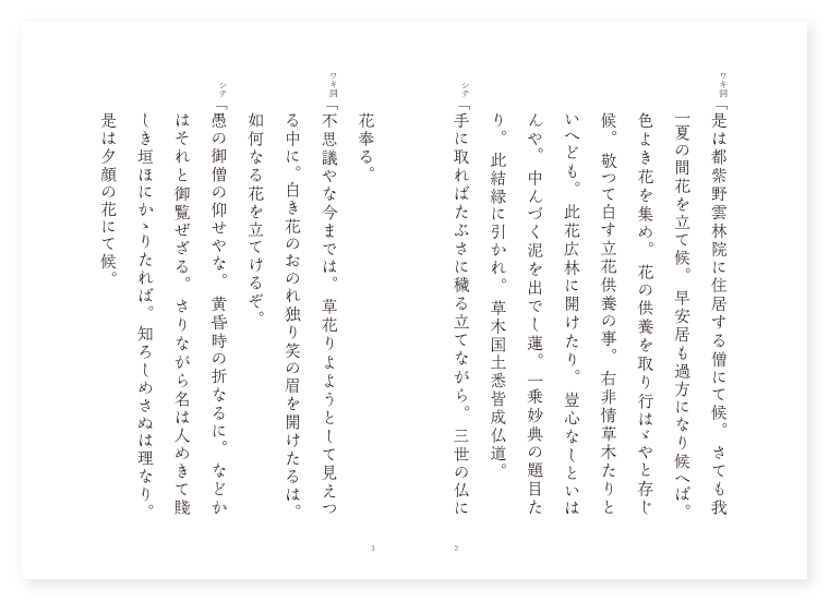 内藤左衛門作 前 ワキ 雲林院の僧 シテ 女 後 ワキ 前に同じ シテ 夕顔の精 地は 前は都雲林院 後は都五条 季は 夏六月 ワキ詞「是は都紫野雲林院に住居する僧にて候。さても我一夏の間花を立て候。早安居も過方になり候へば。色よき花を集め。花の供養を取り行はゞやと存じ候。敬つて白す立花供養の事。右非情草木たりといへども。此花広林に開けたり。豈心なしといはんや。中んづく泥を出でし蓮。一乗妙典の題目たり。此結縁に引かれ。草木国土悉皆成仏道。 シテ「手に取ればたぶさに穢る立てながら。三世の仏に花奉る。 ワキ詞「不思議やな今までは。草花りよようとして見えつる中に。白き花のおのれ独り笑の眉を開けたるは。如何なる花を立てけるぞ。 シテ「愚の御僧の仰せやな。黄昏時の折なるに。などかはそれと御覧ぜざる。さりながら名は人めきて賤しき垣ほにかゝりたれば。知ろしめさぬは理なり。是は夕顔の花にて候。 ワキ「実に〳〵さぞと夕顔の。花の主は如何なる人ぞ。 シテ「名のらずと終には知ろし召さるべし。我は此花の陰より参りたり。 ワキ「さては此世になき人の。花の供養に逢はん為めか。それに付けても名のり給へ。 シテ「名は有りながら亡き跡に。なりし昔の物語。 ワキ「何某の院にも。 シテ「常はさむらふ誠には。 地「五条あたりと夕顔の。〳〵。空目せし間に夢となり。面影ばかり亡き跡の。立花の陰に隠れけり。〳〵。(中入) ワキ「有りし教へに随つて。五条あたりに来て見れば。実にも昔の居まし所。さながら宿りも夕顔の。瓢簞しば〳〵空し。草顔淵が巷に滋し。 後ジテ「藜藋深く鎖せり。夕陽の残晴新に窓を穿つて去る。 地「愁嘆の泉の声。 シテ「雨原憲が枢を湿ほす。 下歌地「さらでも袖を湿ほすは。廬山の雪の曙。 上歌「窓頭に向ふ朗月は。〳〵。琴瑟に当り。愁傷の秋の山。物すごの気色や。 ロンギ地「実に物すごき風の音。簀戸の竹垣有りし世の。夢の姿を見せ給へ。菩提を深く弔らはん。 シテ「山の端の。心も知らで行く月は。上の空にて絶えし跡の。又いつか逢ふべき。 地「山賤の。垣ほ荒るとき折々は。 シテ「哀をかけよ撫子の。 地「花の姿をまみえなば。 シテ「跡訪ふべきか。 地「中々に。 シテ「さらばと思ひ夕顔の。 地「草の半蔀おし上げて。立ち出づる御姿。見るに涙のとゞまらず。 クセ「其頃源氏の中将と聞こえしは。此夕顔の草枕。たゞ仮臥の夜もすがら。隣を聞けば三吉野や。御嶽精進の御声にて。南無当来導師。弥勒仏とぞ称へける。今も尊き御供養に。其時の思ひ出でられて。そゞろに濡るゝ袂かな。猶それよりも忘れぬは。源氏此宿を。見そめ給ひし夕つ方。惟光を招き寄せ。あの花折れと宣へば。白き扇の。つまいたう焦がしたりしに。此花を折りて参らする。 シテ「源氏つく〴〵と御覧じて。 地「打ち渡す。遠方人に問ふとても。それ其花と答へずは。終に知らでもあるべきに。逢ひに扇を手に触るゝ。契の程のうれしさ。折々尋ね寄るならば。定めぬ海士の此宿の。主を誰と白波の。よるべの末を頼まんと。一首を詠じおはします。 地「折りてこそ。(序の舞) シテ「折りてこそそれかとも見め。 地「黄昏に。 地「ほの〴〵見えし花の夕顔。〳〵。〳〵。 シテ「終の宿りは知らせ申しつ。 地「常にはとむらひ。 シテ「おはしませと。 地「木綿附の鳥の音。 シテ「鐘もしきりに。 地「告げ渡る東雲。あさまにもなりぬべし。明けぬ先にと夕顔の宿り。明けぬ先にと夕顔の宿りの。又半蔀の内に入りて。其まゝ夢とぞなりにける。 底本:国立国会図書館デジタルコレクション『謡曲評釈 第一輯』大和田建樹 著