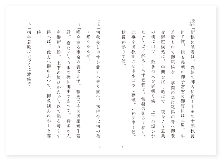 笛の巻(前) シテ 常磐御前 子方 牛若丸 ワキ 羽田秋長 橋弁慶(後) シテ 武蔵坊弁慶 トモ 従者 子方 源牛若 九月 〔笛の巻〕 ワキ詞「斯様に候者は。義朝の御内に在し羽田の十郎秋長にて候。扨も義朝の御子常磐の御腹には三男。牛若殿と申て御座候を。学問の為に鞍馬の寺へ御登せ御座候処に。学問をばし給はで。夜な〳〵五条の橋に出で。数多の人を御斬り候。上下の煩ひかた〴〵以て然る可らず候程に。常磐の御方に参り。此事を御教訓させ申さばやと存候。いかに申し候。秋長が参りて候。 シテ母「何秋長と申すか此方へ来り候へ。扨唯今は何の為に来りたるぞ。 ワキ「唯今参る事余の義に非ず。鞍馬の寺に御座候牛若殿。夜な〳〵五条の橋に御出であつて。数多の人を御斬り候。上下の煩ひかた〴〵以て然る可らず候へば。此方へ御申あつて。御教訓あれかしと存候。 シテ「扨牛若殿はいづくに渡候ぞ。 ワキ「あれに御座候。 シテ「此方へと申候へ。 ワキ「畏て候。此方へ御参候へ。 シテ「いかに牛若殿。此程は寺にあるかとこそ思しに。何とて此方へは下りたるぞ。 牛若「さん候久しく母上を見参らせず候程に参りて候。 シテ「いや〳〵お事の心を見るに。思ふといふも虚言よ。今程平家の公達の肩を並べしを争ひ。同じ寺中にあるとても。学問にだに勝れなば。他山の聞え寺家の覚え。かた〴〵母も嬉しう思ふべきに。学問をこそせざらめ。夜な〳〵五条の橋に出で。人を失ふ由を聞くぞとよ。まこと左様にあるならば。母と思ふな子とも亦。 同「思ふまじげによしなやな。か程に母は思へ共。其かひ更になき上は。しかりてもよしぞなきうたての者の心や。 上歌「よしやよし親子をも。〳〵。思ひ思はぬ中ならば。中々に安からぬ。御身の為は然るべし。いかなれば畜類。又は空飛び翔る鳥も。其ことわりを知ればこそ。鳩に三枝の礼をなし。烏きう〳〵の。孝行なるはいかばかり。などや御身は不孝なると。しかれば牛若も。手を合せ立寄りて許し給へと泣き居たり。 クセ「おことまたいとけなかりし時よりも。父に離れてむざんやな。敵の手にも渡りなば。いかなる淵川の。瀬にも沈みもやせましと。心にかけて思ひ寝の。夢の一時。花の夕べの山颪。声高く泣く時は。六波羅の人やもし。聞くらんものを悲しやと。忍びて落ちしも今思ひでの涙かな。 ロンギ牛若「母の仰の重ければ。明けなば寺へ登るべし。去乍ら此笛に。えたる便のあるぞとは。いかなる謂候ぞ。 母「げに理の不審かな。是は弘法大師とて。貴き人の御笛を。伝へたる故なれば。斯様に我もいふぞとよ。 牛若「抑や大師の御事は。久しき事と聞ものを。伝へ給ふはいかならん。 母「是はもと入唐の。商人もてる笛なるに其虫喰のあるぞとよ。 牛若「扨はしるしの何ぞとも。現はし給ふ文字やらん。委しく語りおはしませ。 母「是御覧ぜよ今迄は。人にも隠し御身にも。 牛若「見せさせ給ふ事もなきに。 同「今こそ委しくは。見も明石潟島隠れ。並ぶや蟬のもとに。巻き隠したる錦を。解きて能く見れば。不思議やな虫喰の。一万五千。三百余歳経て。弘法大師の。御手に渡り其後に。義朝の末の子牛若が手に渡るべしと。確かなる虫喰。かたじけなやと戴き。明けなば寺に登るべし。かまえておこと偽はるな。又よと母はいひすてゝ常のすみかに入りにけり常のすみかに入りにけり。 牛若詞「いかに羽田。母の仰の重ければ。明けなば寺へ登るべし。今宵ばかりの名残なれば。五条の橋に出で。たち待ちに月を眺めうずるにてあるぞ。 ワキ「畏つて候。(是より外の巻橋弁慶の 牛若一声「扨も牛若は母の仰の重ければ へ続くとなり) 〔橋弁慶〕 牛若一声「扨も牛若は。母の仰せの重ければ。明けなば寺へ登るべし。今宵ばかりの名残なれば。五条の橋に立出て。川波そへて立ち待ちに。月の光を待つべしと。 一声「夕波の。気色はそれか夜嵐の。夕べ程なき。秋の風。 上歌同「面白の気色やな。〳〵。そゞろうきたつ我心。波も玉散る白露の。夕顔の花の色。五条の橋の橋板を。とゞろ〳〵とふみならし。音も静かに更くる夜に。通る人をぞ待ち居たる〳〵。 シテ詞一声「既に此夜も明け方の。三塔の鐘もすぎまの雲の。光りかゝやく月の夜に。着たる鎧は黒革の。おどしに縅せる大鎧。草摺長に着なしつゝ。もとより好む大長刀。真中取て打ちかつぎ。ゆらり〳〵といでたる有様。いかなる天魔鬼神なり共。面を向べきやうあらじと。我身ながらも物頼もしうて。手にたつ敵の。恋しさよ。 牛若「川風もはや更過ぐる橋の面に。通る人もなきぞとて。心すごげに休らへば。 シテ「弁慶かくとも白波の。立より渡る橋板を。さも荒らかに踏み鳴らせば。 牛若「牛若彼を見るよりも。すはやうれしや人来るぞと。薄衣猶もひきかづき。傍によりそひ佇めば。 シテ「弁慶彼を見つけつゝ。詞をかけんと思へ共。見れば女の姿なり。我は出家の事なれば。思ひ煩ひ過てゆく。 牛若「牛若彼をなぶつて見んと。行き違ひさまに長刀の。柄元を