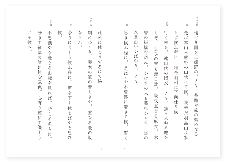 前 ワキ 熊野の山伏 ツレ 同行の山伏 シテ 樵の翁 後 ワキ 前に同じ ツレ 前に同じ シテ 鬼神 地は 信濃 季は 秋 ワキ次第「遥けき国を三熊野の。〳〵。苔路や旅の始めなる。 詞「是は本山三熊野の山伏にて候。我未だ羽黒山に参らず候ふ程に。唯今羽州に下向仕り候。 道行「行く末も。遠山伏の摺衣。〳〵。遥々来ぬる旅をしぞ。思ひの末も幾日数。幾夜重なる麻衣。木曽の掛橋谷深み。かけぢの末も暮れかゝる。雲の八重山いかばかり。〳〵。 詞「急ぎ候ふ程に。是はゝや木曽路に着きて候。暫く此所に休まうずるにて候。 シテ一声「馴れつゝも。妻木の道の苦しきや。重なる老の坂ならん。 詞「余りに苦しう候ふ程に。薪を下し休まばやと思ひ候。 ワキ詞「不思議やな是なる山賤を見れば。所こそ多きに。分きて紅葉の陰に休む気色。心有り顔にて優しうこそ候へ。 シテ「本より賤しき賤の男の。何の心の候ふべき。彼黒主が歌の心は。薪を負へる山人の。花の木陰に休むけしきを。残し置きたる筆の跡。我等が休むも紅葉の木陰。いたづら事にて候ふなり。 ワキ「実に心ある答へかな。先々紅葉の名所々々。彼方此方に多けれども。彼業平の心には。神代も聞かずと言ひ置きし。 シテ「名にも龍田の紅葉の色。 ワキ「初瀬の山は檜原が木の間に。色洩れ出づる村紅葉。 シテ「又は八塩の岡のもみぢ葉。 ワキ「其外高雄。 シテ「嵐山。 地「色々を。四方に染めなす秋の日の。〳〵。朝には雪としぐれ。夕べには雨とそゝぎ。このもかのもの草木の。はや下染も時過ぎて。百入千入に薄き濃き。梢の秋は面白や。 シテ「白露も。 地「白露も。時雨もいたく漏る山は。下葉残らぬもみぢ葉を。片敷く今宵山伏の。一夜を明かし給はゞ。我も帰りて夜もすがら。夜遊を慰め申さんと。谷の戸深く入りにけり。〳〵。 ワキ「あら恐ろしの気色やな。小夜も半に更方の。 ツレ「月影闇き山中に。 ワキ「行くべき方もあらざれば。 ツレ「あらたなりける夢の告と。 ワキ「頼みを掛けて。 ツレ「読誦する。 二人「南無や開山役の優婆塞。殊には三熊野三所権現。力を添へてたび給へ。 地「不思議や峨々たる石根に。〳〵。黒雲一村起ると見えしが。谷峰一同に響き震動し。磐石を砕き木を折る嵐に。先立ち飛雲の光りの内に。顕はれ出づる鬼神の姿。面をむくべき様ぞなき。 ワキ「東方に降三世明王。 ツレ「南方に軍荼利夜叉明王。 ワキ「西方に大威徳明王。 ツレ「北方に金剛夜叉明王。 ワキ「中央に大日大聖不動明王。 二人「唵呼嚕々々旋荼利摩登枳。唵阿毘羅吽剣蘇嚩訶。 地「鬼神の通力忽ちに。〳〵。明王の繫縛にかゝると見えしが。飛行をなして上らんとすれども。大地に斃れ伏し起きつまろびつ。おのれと身を責め苦しむ気色に。行者の威力いよ〳〵増さり。数珠さら〳〵と押しもんで。見我身者発菩提心。〳〵。聞我名者断悪修善。聴我説者得大智恵。智我心者即身成仏。即身成仏と祈り伏せ。行者は遥かに立ち退けば。 シテ「不思議や今までは。 地「不思議や今までは。大勢力の鬼神と見えしが。立ちどころに弱り伏して。唯茫然と起き上りて。たゞよひ行くと見えつるが。有りつる姿は雲煙。有りつる姿は雲煙と。立ち消えて。鬼神の姿は失せにけり。 底本:国立国会図書館デジタルコレクション『謡曲評釈 第八輯』大和田建樹 著