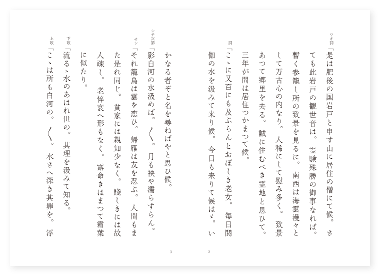 世阿弥作 前 ワキ 岩戸の僧 シテ 里の老女 後 ワキ 前に同じ シテ 檜垣の嫗 地は 肥後 季は 雑 ワキ詞「是は肥後の国岩戸と申す山に居住の僧にて候。さても此岩戸の観世音は。霊験殊勝の御事なれば。暫く参籠し所の致景を見るに。南西は海雲漫々として万古心の内なり。人稀にして慰み多く。致景あつて郷里を去る。誠に住むべき霊地と思ひて。三年が間は居住つかまつて候。 詞「こゝに又百にも及ぶらんとおぼしき老女。毎日閼伽の水を汲みて来り候。今日も来りて候はゞ。いかなる者ぞと名を尋ねばやと思ひ候。 シテ次第「影白河の水汲めば。〳〵。月も袂や濡らすらん。 サシ「それ籠鳥は雲を恋ひ。帰雁は友を忍ぶ。人間もまた是れ同じ。貧家には親知少なく。賤しきには故人疎し。老悴衰へ形もなく。露命きはまつて霜葉に似たり。 下歌「流るゝ水のあはれ世の。其理を汲みて知る。 上歌「こゝは所も白河の。〳〵。水さへ深き其罪を。浮びやすると捨人に。値遇を運ぶ足引の。山下庵に着きにけり。山下庵に着きにけり。 シテ詞「いつもの如く今日もまた御水あげて参りて候。 ワキ詞「毎日老女の歩み返す〴〵も痛はしうこそ候へ。 シテ「せめてはかやうの事にてこそ。少しの罪をも遁るべけれ。亡からん跡を弔ひ給ひ候へ。明けなば又参り候ふべし。御暇申し候はん。 ワキ「暫く。御身の名を名乗り給へ。 シテ「何と名を名乗れと候ふや。 ワキ「中々の事。 シテ「是は思ひもよらぬ仰せかな。彼後選集の歌に。年ふれば我黒髪も白河の。 詞「みつは汲むまで老いにけるかなと。よみしもわらはが歌なり。昔し筑前の太宰府に。庵に檜垣しつらひて住みし白拍子。後には衰へて此白河の辺りに住みしなり。 ワキ「実にさる事を聞きしなり。其白河の庵のあたりを。藤原の興範通りし時。 シテ「水やあると乞はせ給ひし程に。其水汲みて参らするとて。 ワキ「みづはくむとは。 シテ「よみしなり。 地「そもみづはくむと申すは。〳〵。唯白河の水にはなし。老いてかゞめる姿をばみつはぐむと申すなり。其しるしをも見給はゞ。彼の白河の辺りにて。我跡とひてたび給へと。夕まぐれして失せにけり。〳〵。(中入) ワキ詞「さては古への檜垣の嫗仮に顕はれ。我に言葉をかはしけるぞや。一つは末世の奇特ぞと。思ひながらも尋ね行けば。 歌「不思議や早く日も暮れて。〳〵。河霧深く立ちこもる。陰に庵の灯の。ほのかに見ゆる不思議さよ。〳〵。 後ジテ「あら有難の弔ひやな。〳〵。風緑野に収つて煙条直し。雲岸頭に定まつて月桂円かなり。朝に紅顔あつて世路に楽しむといへども。 地「夕べには白骨となつて郊原に朽ちぬ。 シテ「有為の有様。 地「無常のまこと。 シテ「誰か生死の理を論ぜざる。 地「いつを限る習ひぞや。老少といつぱ分別なし。変はるを以て期とせり。誰か必滅を期せざらん。誰かは是れを期せざらん。 ワキ「不思議やな声を聞けば有りつる人なり。同じくは姿を顕はし給ふべし。御跡とひて参らせん。 シテ「さらば姿を顕はして。御僧の御法を受くべきなり。人にな顕はし給ひそとよ。 ワキ「中々に人に顕はす事有るまじ。早々姿を見え給へ。 シテ「涙曇りの顔ばせは。それとも見えぬ衰へを。誰白河のみつはぐむ。老の姿ぞ恥かしき。 ワキ「あら痛はしの御有様やな。今も執心の水を汲み。輪廻の姿見え給ふぞや。早々浮び給へ。 シテ「我いにしへは舞女の誉れ世に勝れ。其罪深き故により。今も苦しみを三つ瀬河に。熱鉄の桶を荷なひ。猛火の釣瓶を提げて此水を汲む。其水湯となつて。我身を焼く事隙もなけれども。此程は御僧の値遇に引かれて。釣瓶はあれども猛火はなし。 ワキ「さらば因果の水を汲み。其執心を振り捨てゝ。とく〳〵浮び給ふべし。 シテ「いで〳〵さらば御僧の為め。此かけ水を汲み乾さば。罪もや浅くなるべきと。 ワキ「思ひも深き小夜衣の。袂の露の玉だすき。 シテ「影白河の月の夜に。 ワキ「底澄む水を。 シテ「いざ汲まん。 地「釣瓶の水に影落ちて。袂を月や上るらん。 地クリ「それ残星の鼎には北渓の水を汲み。後夜の炉には南嶺の柴を焚く。 シテサシ「それ氷は水より出でゝ水よりも寒く。 地「青き事藍より出でゝ藍より深し。本の憂き身の報いならば。今の苦しみ去りもせで。 シテ「いや増さりぬる思ひの色。紅の涙に身を焦がす。 クセ「釣瓶の懸縄繰り返し。憂きいにしへも。紅花の春のあした。紅葉の秋の夕暮も。一日の夢と早なりぬ。紅顔の粧ひ。舞女のほまれもいとせめて。さも美しき紅顔の。翡翠のかづら花しをれ。桂の眉も霜降りて。水にうつる面影。老衰かげ沈んで。緑に見えし黒髪は。土水の藻屑塵芥。変はりける。身の有様ぞ悲しき。実にや有りし世を。思ひ出づればなつかしや。其白河の波かけし。 シテ「藤原の興範の。 地「其いにしへの白拍子。今一節と有りしかば。昔の花の袖。今更色も麻衣。短き袖を返し得ぬ。心ぞつらき陸奥の。希婦の細布胸合はず。何とか白拍子。其面影の有るべき。よし〳