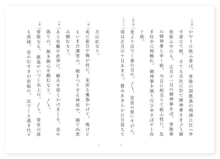 世阿弥作 前 ワキ 鹿島の神職 シテ 里の男 ツレ(一同) 参詣人 ツレ 里の女 後 ワキ 前に同じ シテ 鹿島明神 地は 常陸 季は 正月 ワキ詞「かやうに候ふ者は。常陸の国鹿島の明神に仕へ申す者にて候。さても当社に於て御神事さま〴〵御座候ふ中にも。正月十一日の御神事をば。常陸帯の御神事と申し候。今日に相当りて候ふ程に。急ぎ社中に相触れ。御神事を執り行ひ申さばやと存じ候。 一同次第「是より出でし春の日の。〳〵。宮居の祭いそがん。 シテサシ「頃は正月の十日あまり。霞みあきらかに日落ちて万山紅なり。 一同「実に面白や梅が枝に。来居る鶯春かけて。鳴けどもいまだ薄雪の。朝まつりする神垣や。隔てぬ恵み頼むなり。 下歌「あら有難や此神に。頼みを深くかけまくも。忝や偽りの。無き御心を頼むなり。〳〵。 上歌「常陸なる。鹿島やいづく水上の。〳〵。常世の波も深緑。苔のむすきが岩船の。出でしも遠き代々を経て。国豊かなる今までも。誓ひの船に身を浮けて。御影を頼む春の日の。今日長閑なるあしたかな。〳〵。 ワキ「時を得て今日の手向か神祭る。正月長閑けき空色の。手向も同じ袖はへて。貴賤群集ぞありがたき。 シテ「我は又同じ手向の其内に。わきて心も色ふかき。花田の帯の末長く。契り結ぶの神の御前に。信心をいたして参りけり。 ワキ「よそ目にはそれとも知らぬ思ひ妻。或ひは花の手向草。 シテ詞「又は名におふ常陸帯の。面に一首の歌を書く。同じ世をかけて頼まん常陸帯の。結ぶかひある契りなりせば。 下歌地「神は偽りましまさじ。人やもしも空色の。花田に染める常陸帯の。契りかけたりや。かまひて守り給へや。 上歌「唯頼めかけまくも。〳〵。かたじけなしや此神の。恵みも鹿島野の。草葉に置ける露のまも。惜しめたゞ恋の身の。命のありてこそ。同じ世を頼むしるしなれ。 ツレ女「不思議やな手向も繁き其内に。わきて心も色ふかき。花田の帯のうつくしきを。御前に掛けたる不思議さよ。よりて見れば歌を書きたり。同じ世をかけて頼まん常陸帯の。結ぶかひある契りなりせば。心を知れば恋の歌なり。そも此手向に恋心を。手向けば神も受け給ふべきか。返す〴〵も不審なるぞや。 シテ詞「嬉しやな今までは。つれなかりける御心の。今はやはらぐ言の葉の。結ぶ契りの末頼もしうこそ候へ。 ツレ「そも契りの末の頼もしきとは。心得がたき言葉かな。もし人たがへにてあるやらん。 シテ「何をか包み給ふらん。数書き贈りし玉章の。返事をだにも白露の。身の置き処のなきまゝに。当社に祈りをかけし身の。今日待ちえたる常陸帯の。我にかごとはよもあらじ。 ツレ「そも契りの末の常陸帯とは。御前に見えたる花田の帯に。 シテ詞「書く歌占を一番に。詠ぜん人を妹背ぞと。昔より神の御告なり。 ツレ「昔の事はさもありなん。今は誠を白木綿の。 シテ「神は末世によもあらじ。唯信仰の誠あらば。今も威光はよもつきじ。 ツレ「いやとにかくに言葉づくし。よその人目も恥かしとて。あらざる方へ立ちのけば。 シテ「あら情なの御事や。よし我にこそ疎くとも。 地「神は契りの常陸帯。結びとめさせ給ふべし。恐ろしや疑ひの。神罰あたり給ふな。 ロンギ地「実に疑ひはあらかねの。島根は是か鹿島野の。神の御心頼むなり。ことわり給へ御誓ひ。 シテ「是や此東路の。道の果なる常陸帯の。かごとばかりも逢ひ見んと。人陰にたゝずめば。 地「立ちよる陰も人繁き。手向の袖も様々に。神の御祭あがめよ。 シテ「よしとても今日よりは。人も我もむつび月の。袖ふれて寄り来よ。 地「実にや睦月の空なれや。緑立ちそふ青柳の。 シテ「陰ふむ道に休らひて。 地「貴賤の群集おし隔て。 シテ「後影も見えざれば。 地「せん方もなく。 シテ「日も暮れぬ。 地「とにかくに恋はなど。さのみ心を筑波嶺の。このもかのもに道はあれど。恋の道は迷へり。あらうたて御神。常陸帯かへし給へや。(中入) ワキ「是は不思議の神託とて。宮人数々騒ぎあひ。神慮を疑ふ人あらば。心中になどか知らざらん。もしも包まば重ね〴〵。其神罰は疑ひあるまじ。悔み給ふな人々と。参籠の中に触れければ。 ツレ「思ひ内にあれば色外に顕はれ候ふぞや。あら悲しや恐ろしや。神慮を疑ふ科により。白蛇の責めを蒙るぞや。あら悲しの御事やな。 後ジテ「神は非礼を受け給はず。水上清しや鹿島の波。 地「御殿しきりに鳴動して。 シテ「御神楽の鼓灯の影。 地「和光同塵もかくやらんと。顕はれ給ふぞ忝き。 シテ「我劫初より此かた。此秋津洲に住んで。其かたち八尺の白蛇と現じ。衆生の明闇を守り。陰陽のなかだちと為つて。契りの末や常陸帯の。かごとなき事を守る処に。汝今更疑ふべしや。 地「疑ふべしや心の馬の。隙ゆく道や神の木綿四手。結びとめよや結びとめよや。さてこそ契りの常陸帯。 地「報いは常の世の習ひ。いかに廻るも小車の。すぐなる道はかはらじ。たゞ狂へ〳〵狂女よ。 シテ「そも〳〵恋路に於て。 地「そも〳〵恋路
