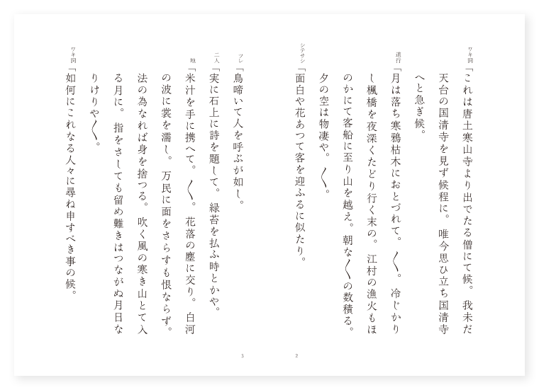 シテ 豊干禅師 ツレ 寒山 ツレ 拾得 ワキ 寒山寺の僧 所 支那 時 冬 ワキ詞「これは唐土寒山寺より出でたる僧にて候。我未だ天台の国清寺を見ず候程に。唯今思ひ立ち国清寺へと急ぎ候。 道行「月は落ち寒鴉枯木におとづれて。〳〵。冷じかりし楓橋を夜深くたどり行く末の。江村の漁火もほのかにて客船に至り山を越え。朝な〳〵の数積る。夕の空は物凄や。〳〵。 シテサシ「面白や花あつて客を迎ふるに似たり。 ツレ「鳥啼いて人を呼ぶが如し。 二人「実に石上に詩を題して。緑苔を払ふ時とかや。 地「米汁を手に携へて。〳〵。花落の塵に交り。白河の波に裳を濡し。万民に面をさらすも恨ならず。法の為なれば身を捨つる。吹く風の寒き山とて入る月に。指をさしても留め難きはつながぬ月日なりけりや〳〵。 ワキ詞「如何にこれなる人々に尋ね申すべき事の候。 シテ「此方の事にて候か。何事にて候ぞ。 ワキ「天台の国清寺とは此所を申し候か。 シテ「さん候。これこそ天台の国清寺にて候へ。扨御僧はいづくより来り給ひて候ぞ。 ワキ「これは寒山寺より出でたる僧にて候。 シテ「何と御僧は寒山寺より御出でと候や。それにつき思ひ出したる事の候。古此所に寒山拾得と申せし人の。住み給ひたる所なり。 ワキ「実に〳〵これは貧士風狂の士として。 シテ「常の徒にこれをおすべきにあらず。 地「布儒又零落し。〳〵。面貌孤衰して膚ぎやう骨と衰へ。或時は樺皮を冠とし。又或時は大なる木履をはきて風狂の。姿と見れど心は仏意に帰する人とかや〳〵。 ワキ詞「如何に申し上げ候。豊干禅師の旧院はいづくの程にて候ぞ。 シテ詞「豊干禅師の旧院は経蔵の後なり。今は寂として人なし。さりながら此方へ御入り候へ教へ申さう。これこそ豊干禅師の旧院にて候へ。 ワキ「とてもの事に豊干禅師の謂委しく御物語り候へ。 クリ地「扨も豊干禅師と申すは。天台の国清寺に帰す。髪を切つて肩に等し。布裘又像を見す。 サシシテ「人あつて借問すれば。随時の二字を答へて他の語なし。 地「楽んで独穀を碓舂き。則ち菜炊にこれをそふ。 シテ「曽て虎に乗じて松門に入れば。 地「各衆僧を。恐懼する。 クセ「或時豊干あまねく。山行せしに不思議やな。児の泣く声を聞きしかば。立ち寄りて委しく端倪を問ふに舎なうして。孤来と答へ申せば。誠に哀を催し拾ひ得たりと心得。拾得と彼を名づけつゝ。豊干様々養育す。 シテ「かゝりける所に。 地「いづこより来りけん。拾得の如くなる寒山といへる童子来り。常に遊楽のたはむれの。浅からざりし有様は。喝呵大笑して言語も更に常ならず。 シテ詞「其時呂丘といつし人豊干に伺ひ。国清に今顕学の輩ありもやと問ひ給へば。寒山は文珠なり。拾得は普賢なりと答ふ。 地「呂丘此時驚きさわぎ。須臾に堂に入つてこれを礼す。 クセ「寒山拾得は。何故に今更我をば礼し給ふぞと。問ふに呂丘は豊干の教かくぞと語れば。 シテ「二人此時驚きて。 地「入禅の豊干こそ則ち弥陀の化現よと。云ひ捨て閑巌幽崛の内に入りにけり。誠は我は古の寒山拾得よ疑ふなと。いふかと見れば閑巌石根は雲と立ちのぼり。縫目の中に入りにけり〳〵。 ワキ「苔の莚に法をのべ。〳〵。ありつる告をまたんとて。袖を片しき臥しにけり〳〵。 後シテ「一声の山鳥曙雲の外。虎降供して松門に入る。如何に沙門。汝貴き故により。忽ち夢中に豊干向顔をなす。同じく寒山拾得。世上の信たる事を知らせんが為。石の縫目をとく法の。仏体を顕し。給ふべし。 ツレ二人「石に精あり水に音あり。 シテ「虎うそぶけば。風は大虚に渡る。 地「像せんせつたる石崛二つに割るれば普賢文珠顕れ給ふぞ有り難き。 ワキ「不思議やな目のあたりなる御姿を。拝する事の貴さよと。掌を合せて如我昔所願。今者已満足。 地「其時豊干は。虎上より。〳〵。静におりて。菩薩に向ひ。迚姿を顕す上は。法恩微妙の舞楽をなさんと琴瑟鐘鼓。琵琶笋和琴。笙篳篥。虚空に舞楽を奏しけり。 地「舞楽も今は時過ぎて。〳〵。有明がたの尽きぬ名残。白むは東の山葛。かゝる奇特は此寺の。仏法王法伽藍長久五穀成就の其誓願を夢中に見せて。普賢文珠は。二巌に上り。豊干は忽ち弥陀と現じ。西方遥の雲に乗じ。飛行自在を顕し給へば菩薩も獅子象にのりの姿。如来も金色の光を放つて。紫雲の内にぞ入りにける。 底本:国立国会図書館デジタルコレクション『古今謡曲解題』丸岡桂 著、『四流対照 謡曲二百番 下巻』芳賀矢一 訂