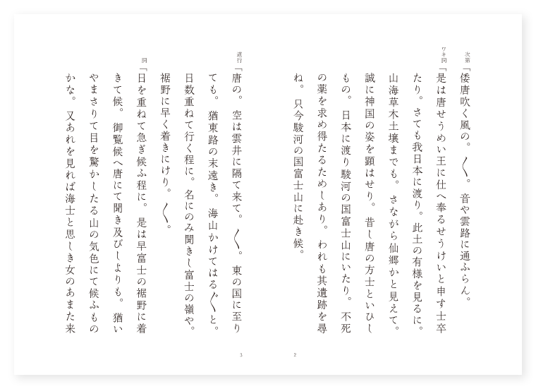 観世小次郎作 前 ワキ 唐人 シテ 海人女 ツレ 同じく 後 シテ 富士の山霊 地は 駿河 季は 六月 次第「倭唐吹く風の。〳〵。音や雲路に通ふらん。 ワキ詞「是は唐せうめい王に仕へ奉るせうけいと申す士卒たり。さても我日本に渡り。此土の有様を見るに。山海草木土壌までも。さながら仙郷かと見えて。誠に神国の姿を顕はせり。昔し唐の方士といひしもの。日本に渡り駿河の国富士山にいたり。不死の薬を求め得たるためしあり。われも其遺跡を尋ね。只今駿河の国富士山に赴き候。 道行「唐の。空は雲井に隔て来て。〳〵。東の国に至りても。猶東路の末遠き。海山かけてはる〴〵と。日数重ねて行く程に。名にのみ聞きし富士の嶺や。裾野に早く着きにけり。〳〵。 詞「日を重ねて急ぎ候ふ程に。是は早富士の裾野に着きて候。御覧候へ唐にて聞き及びしよりも。猶いやまさりて目を驚かしたる山の気色にて候ふものかな。又あれを見れば海士と思しき女のあまた来り候。彼者を相待ち。事の子細をも尋ねばやと存じ候。 シテ、ツレ次第「砂長ずる山河や。〳〵。富士の鳴沢なるらん。 シテサシ「朝日さす高根の深雪空晴れて。野は夕立の富士おろし。 三人「雲もおり立つ田子の浦に。船さしとめて海人乙女の。通ひ馴れたる磯の浪の。よるべ何くと定むらん。実に心なき海士なれども。所からとて面白さよ。松風の音信のみに身を知るや。住む蘆の屋の窓の雨。〳〵。打ち寄する。駿河の海は名のみにて。〳〵。浪静かなる朝なぎに。雲は浮島が原なれど。風は夏野の深みどり。湖水にうつる雪までも。妙なる山の御影かな。〳〵。 ワキ詞「いかに是なる人々に尋ね申すべき事の候。 シテ詞「此方の事にて候ふか何事にて候ふぞ。 ワキ「むかし唐の方士と云ひしもの。此富士山に至り。不死の薬を求め得たる例あり。我も其遺跡を尋ねて。是まで来りたり。其遺跡を知り給へりや。 シテ「げに〳〵さる事の有りしなり。昔し鶯の卵化して小女と成りしを。時の帝の皇女に召されしに。時至りけるか天にあがり給ひし時。かたみの鏡に不死の薬を添へて置き給ひしを。後日に富士の嶽にして。其薬を焼きしより。富士の煙は立ちしなり。 ツレ「然れば本号は不死山なりしを。郡の名に寄せて。富士の山とは申すなり。是れ蓬萊の仙郷たり。 ワキ「さては此山仙郷なるべし。先づ目前の有様にも。今は水無月上旬なるに。雪まだ見えて白妙なり。これは如何なる事やらん。 シテ「さればこそ我朝にても不審多し。然れば日本の歌仙の歌に。時知らぬ山は富士の嶺いつとてか。鹿の子まだらに雪の降るらん。是れ三伏の夏の歌なり。 ワキ「げに〳〵見聞くに謂れあり。時に当りて水無月なるに。さながら富士は雪山なれば。時知らぬとは理りかな。 シテ「殊更今の詠めの気色。波もゆるがぬ四つの時。 ワキ「暑き空にも雪見えて。 シテ「さながら一季に。 ワキ「夏。 シテ「冬を。 地「三保の松原田子の浦。〳〵。何れも青水無月なるに。高嶺は白き富士の雪を。実にも時知らぬ。山とよみしも理りや。実にや天地の。開けし時よ神さびて。高くたふとき駿河の富士。実にも妙なる山とかや。〳〵。 クリ地「抑も此富士山と申すは。月氏しちだふの大山。天竺より飛び来る故に。即ち新山となづけたり。 シテサシ「頂上は八葉にして。内に満池を湛へたり。 地「神仙人気の境界として。四季をり〳〵を一時に顕はし。天地陰陽の通道として。希代の霊験他に異なり。 クセ「凡そ富士の嶺は。年に高さや増るらん。消えぬが上に積る雪の。見れば異山の。高嶺々々を伝ひ来て。富士の裾野にかゝる雲の。上は晴れて青山たり。何くより降るやらん。雲より上の白雪は。然れば此山は。仙郷の隠れ里の。人間に異なる其瑞験もまのあたり。竹林のおほひとして。皇女に備はりて。鏡に不死薬を添へつゝ。別るゝ天の羽衣の。雲路に立ち帰つて。神と成り給へり。 シテ「帝その後。かくや姫の教へに随つて。 地「富士の高嶺の上にして。不死の薬を焼き給へば。煙は満天に立ち登つて。雲霞逆風に薫じつゝ。日月星宿もさながら。あらぬ光りをなすとかや。さてこそ唐の方士も。此山に登り不死薬を。求め得て帰るなり。これ我朝の名のみかは。西天唐土扶桑にも。ならぶ山なしと名を得たる。富士山の粧ひ。誠に上なかりけり。 ワキ詞「富士山の謂れは承り候ひぬ。さて〳〵あれに見えたる山は。いかなる山と申すやらん。 シテ詞「あれは足高山とて。富士にならべる高山にて。金胎両部をあらはせり。これ足高の神前なり。 ワキ「さて〳〵浅間大菩薩とは。取り分き何れの神やらん。 シテ「あう浅間大菩薩とは。さのみは何と優女の姿。 地「恥かしやいつかさて。〳〵。其神体を顕はして。誰にか見えけん神の名を。さのみに顕はさば浅間の。あさまにやなりなん。不死の薬はあたふべし。しばらくこゝに待てしばし。芝山の雲と成つて。立ち登る富士の嶺の。行方知らずなりにけり。〳〵。(中入) 地「かゝりければ富士の