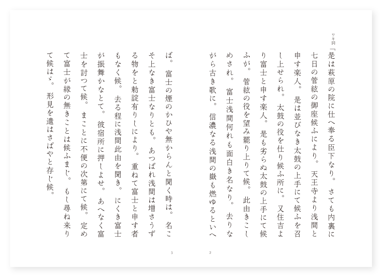 世阿弥作 ワキ 官人 シテ 富士の妻 ヒメ 富士の娘 狂言 侍者 地は 京都 季は 秋 ワキ詞「是は萩原の院に仕へ奉る臣下なり。さても内裏に七日の管絃の御座候ふにより。天王寺より浅間と申す楽人。是は並びなき太鼓の上手にて候ふを召し上せられ。太鼓の役を仕り候ふ所に。又住吉より富士と申す楽人。是も劣らぬ太鼓の上手にて候ふが。管絃の役を望み罷り上りて候。此由きこしめされ。富士浅間何れも面白き名なり。去りながら古き歌に。信濃なる浅間の嶽も燃ゆるといへば。富士の煙のかひや無からんと聞く時は。名こそ上なき富士なりとも。あつぱれ浅間は増さうずる物をと勅諚有りしにより。重ねて富士と申す者もなく候。去る程に浅間此由を聞き。にくき富士が振舞かなとて。彼宿所に押しよせ。あへなく富士を討つて候。まことに不便の次第にて候。定めて富士が縁の無きことは候ふまじ。もし尋ね来りて候はゞ。形見を遣はさばやと存じ候。 次第二人「雲の上なほ遥なる。〳〵。富士の行方を尋ねん。 シテサシ「是は津の国住吉の楽人。富士と申す人の妻や子にて候。さても内裏に七日の管絃のましますにより。天王寺より楽人めされ参る由を聞き。妾が夫も太鼓の役。 二人「世に隠れ無ければ。望み申さん其為めに。都へのぼりし夜の間の夢。心にかゝる月の雨。 下歌「身を知る袖の涙かと。明かしかねたる夜もすがら。 上歌「寐られぬまゝに思ひ立つ。〳〵。雲井やそなた故郷は。跡なれや住吉の。松のひまより詠むれば。月落ちかゝる山城も。はや近づけば笠をぬぎ。八幡に祈り掛帯の。結ぶ契りの夢ならで。うつゝに逢ふや男山。都にはやく着きにけり。〳〵。 シテ詞「急ぎ候ふ程に。都に着きて候。此所にて富士の御行方を尋ねばやと存じ候。いかに案内申し候。 狂言「シカ〳〵。 シテ「是は富士がゆかりの者にて候。富士に引き合はせられて賜はり候へ。 狂言「シカ〳〵。 ワキ詞「富士がゆかりと申すは何くにあるぞ。 シテ「これに候。 ワキ「さて是は富士が為め何にて有るぞ。 女「恥かしながら妻や子にて候。 ワキ「なう富士は討たれて候ふよ。 シテ「何と富士は討たれたると候ふや。 ワキ「中々の事富士は浅間に討たれて候。 シテ「さればこそ思ひ合はせし夢の占。重ねて問はゞ中々に。浅間に討たれ情なく。 地「さしも名高き富士はなど。煙とは為りぬらん。今は歎くに其かひも。なき跡に残る思子を。見るからにいとゞ猶。すゝむ涙はせきあへず。 ワキ詞「今は歎きてもかひなき事にて有るぞ。是こそ富士が舞の装束候ふよ。夫れ人の嘆には。形見に過ぎたる事あらじ。是を見て心を慰め候へ。 シテ「今までは行方も知らぬ都人の。妾を田舎の者と思召して。偽り給ふと思ひしに。誠にしるき鳥甲。月日もかはらぬ狩衣の。疑ふ所も有らばこそ。痛はしや彼人出で給ひし時。みづから申すやう。天王寺の楽人は召しにて上りたり。御身は勅諚なきに。押して参れば下として。上を量るに似たるべし。其うへ御身は当社地給の楽人にて。明神に仕へ申すうへは。何の望みの有るべきぞと申しゝを。知らぬ顔にて出で給ひし。 下歌地「其面影は身に添へど。まことの主は亡きあとの。忘形見ぞよしなき。 上歌「兼ねてより。かく有るべきと思ひなば。〳〵。しうこうが手を出だし。はんらうが涙にても。留むべき物を今更に。神ならぬ身を恨みかこち。歎くぞあはれなる。歎くぞあはれなりける。 シテ詞「あら恨めしや如何に姫。あれに夫の敵の候ふぞやいざ討たう。 姫「あれは太鼓にてこそ候へ。思ひのあまりに御心乱れ。筋なき事を仰せ候ふぞや。あら浅ましや候。 シテ「うたての人の言ひごとや。あかで別れし我夫の。失せにし事も太鼓故。たゞ恨めしきは太鼓なり。夫の敵よいざ打たう。 姫「げに理なり父御前に。別れし事も太鼓故。さあらば親の敵ぞかし。打ちて恨みを晴らすべし。 シテ「妾が為めには夫の敵。いざやねらはん諸共に。 姫「男の姿狩衣に。物の具なれや鳥甲。 シテ「恨みの敵討ちをさめ。 姫「鼓を苔に。 シテ「埋まんとて。 地「寄するや鬨の声立てゝ。秋の風より冷ましや。 シテ「打てや〳〵と攻鼓。 地「あらさてこりの泣く音やな。 地「なほも思へば腹たちや。〳〵。化したる姿に引きかへて。心言葉も及ばれぬ。富士が幽霊きたると見えて。よしなの恨みや。もどかしと太鼓打ちたるや。(楽) シテ「持ちたる撥をば剣と定め。 地「持ちたる撥をば剣と定め。嗔恚の焰は太鼓の烽火の。天にあがれば雲の上人。誠に富士おろしに。絶えず揉まれて裾野の桜。四方へばつと散るかと見えて。花衣さす手も引く手も。伶人の舞なれば。太鼓の役は本より聞ゆる。名の下空しからず。たぐひなやなつかしや。 ロンギ地「げにや女人の悪心は。煩悩の雲晴れて。五常楽を打ち給へ。 シテ「修羅の太鼓は打ちやみぬ。此君の御いのち。千秋楽と打たうよ。 地「さてまた千代や万代と。民も栄えて安穏に。 シテ「太平楽を打たうよ。 地「日も既に傾きぬ。〳〵。