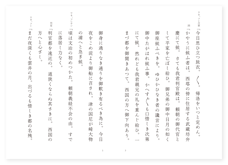 観世小次郎作 前 ワキ 武蔵坊弁慶 ワキヅレ(数人) 義経従者 子方 判官義経 狂言 船頭 シテ 静 後 ワキ 前に同じ ワキヅレ 前に同じ 子方 前に同じ シテ 平知盛 地は 摂津 季は 雑 ワキ、ツレ次第「今日思ひ立つ旅衣。〳〵。帰洛をいつと定めん。 詞「かやうに候ふ者は。西塔の傍に住居する武蔵坊弁慶にて候。さても我君判官殿は。頼朝の御代官として平家を亡ぼし給ひ。御兄弟の御中日月の如く御座候ふべきを。ゆひかひなき者の讒言により。御中たがはれ候ふ事。かへす〴〵も口惜しき次第にて候。然れども我君親兄の礼を重んじ給ひ。一まづ都を御開きあつて。西国の方へ御下向あり。御身に過りなき通りを御歎き有るべき為に。今日夜をこめ淀より御船に召され。津の国尼が崎大物の浦へと急ぎ候。 ワキ、ツレサシ「頃は文治の初めつかた。頼朝義経不会の由。すでに落居し力なく。 判官「判官都を遠近の。道狭くならぬ其さきに。西国の方へと心ざし。 ワキ、ツレ「まだ夜深くも雲井の月。出づるも惜しき都の名残。ひとゝせ平家追討の。都出には引きかへて。唯十余人すご〳〵と。さも疎からぬ友舟の。 下歌「上り下るや雲水の。身は定めなき習ひかな。 上歌「世の中の。人は何とも石清水。〳〵。清み濁るをば神ぞ知るらんと。高き御影を伏し拝み。行けば程なく旅心。潮も波も共に引く。大物の浦に着きにけり。〳〵。 ワキ詞「御急ぎ候ふ程に。是はゝや大物の浦に御着きにて候。某ぞんじの者の候ふ間。御宿の事を申し付けうずるにて候。如何に此屋のあるじの渡り候ふか。 狂言「誰にて御入り候ふぞ。 ワキ「いや武蔵にて候。 狂言「さて只今は何の為の御いで候ぞ。 ワキ「さん候我君を是まで御供申して候。御宿を申し候へ。 狂言「さらば奧の間へ御通り候へ。御用心の事は御心安く思しめされ候へ。 ワキ「如何に申し上げ候。恐れ多き申し事にて候へども。正しく静は御供と見え申して候。今の折節何とやらん似合はぬ様に御座候へば。あつぱれ是より御かへしあれかしと存じ候。 判官「ともかくも弁慶はからひ候へ。 ワキ「畏つて候。さらば静の御宿へ参りて申し候ふべし。 ワキ詞「いかに此屋の内に静の渡り候ふか。君よりの御使に武蔵が参じて候。 シテ詞「武蔵殿とはあら思ひよらずや。何のための御使にて候ふぞ。 ワキ「さん候只今参る事余の儀にあらず。我君の御諚には。是までの御参りかへす〴〵も神妙に思しめし候ふ去りながら。唯今は何とやらん似合はぬやうに御座候へば。是より都へ御帰りあれとの御事にて候。 シテ「是は思ひもよらぬ仰せかな。いづくまでも御供とこそ思ひしに。頼みても頼みなきは人の心なり。あら何ともなや候。 ワキ「さて御返事をば何と申し候ふべき。 シテ「みづから御供申し。君の御大事になり候はゞ留まり候ふべし。 ワキ「あら事々しや候。たゞ御とまり有るが肝要にて候。 シテ「よく〳〵物を案ずるに。是は武蔵殿の御はからひと思ひ候ふ程に。わらは参り直に御返事を申し候ふべし。 ワキ「それはともかくもにて候。さらば御参り候へ。 ワキ詞「如何に申し上げ候。静の御参りにて候。 判官「いかに静。此度思はずも落人となり落ち下る所に。是まではる〴〵来りたる心ざし。かへす〴〵も神妙なりさりながら。はる〴〵の波濤をしのぎ下らん事しかるべからず。先此度は都にのぼり。時節を待ち候へ。 シテ「さては誠に我君の御諚にて候ふぞや。よしなき武蔵殿を恨み申しつる事のはづかしさよ。返す〴〵も面目なうこそ候へ。 ワキ「いや〳〵是は苦しからず候。唯人口を思しめすなり。御心変はるとな思召しそと。涙を流し申しけり。 シテ「いやとにかくに数ならぬ。身には恨みもなけれども。是は舟路の門出なるに。 地「浪風も。静を留め給ふかと。〳〵。涙を流し木綿四手の。神かけて変はらじと。契りし事も定めなや。げにや別れより。まさりて惜しき命かな。君に二たび。逢はんとぞ思ふ行末。 判官「如何に弁慶。静に酒をすゝめ候へ。 ワキ「畏つて候。げにげに是は御門出の。行末千代ぞと菊の盃。静にこそはすゝめけれ。 シテ「妾は君の御別れ。やる方なさにかきくれて。涙にむせぶばかりなり。 ワキ「いや〳〵これは苦しからぬ。旅の舟路の門出の和歌。唯一さしと勧むれば。 シテ「其時静は立ち上り。時の調子を取りあへず。渡口の郵船は。風静まつて出づ。 地「波頭の謫所は。日晴れて見ゆ。 ワキ「是に烏帽子の候ふめされ候へ。 シテ「立ち舞ふべくもあらぬ身の。 地「袖打ち振るも恥かしや。 シテサシ「伝へ聞く陶朱公は勾践を伴なひ。 地「会稽山に籠りゐて。種々の智略をめぐらし。終に呉王を亡ぼして。勾践の本意を達すとかや。 クセ「しかるに勾践は。二度代を取り。会稽の恥を雪ぎしも。陶朱功を成すとかや。されば越の臣下にて。政を身に任せ。功名富み貴く。心の如くなるべきを。功成り名遂げて身退くは。天の道と心得て。小船に棹さして。五湖の遠島をたのしむ。 シテ「かゝる例も有明の。 