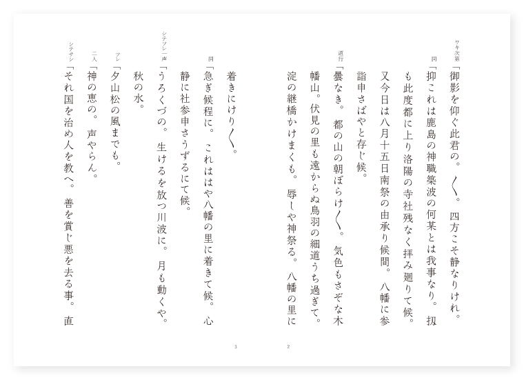 シテ 武内の神 前ツレ 神の化身(従者) ワキ 鹿島の神職 所 山城男山 時 八月 ワキ次第「御影を仰ぐ此君の。〳〵。四方こそ静なりけれ。 詞「抑これは鹿島の神職築波の何某とは我事なり。扨も此度都に上り洛陽の寺社残なく拝み廻りて候。又今日は八月十五日南祭の由承り候間。八幡に参詣申さばやと存じ候。 道行「曇なき。都の山の朝ぼらけ〳〵。気色もさぞな木幡山。伏見の里も遠からぬ鳥羽の細道うち過ぎて。淀の継橋かけまくも。辱しや神祭る。八幡の里に着きにけり〳〵。 詞「急ぎ候程に。これははや八幡の里に着きて候。心静に社参申さうずるにて候。 シテツレ一声「うろくづの。生けるを放つ川波に。月も動くや。秋の水。 ツレ「夕山松の風までも。 二人「神の恵の。声やらん。 シテサシ「それ国を治め人を教へ。善を賞じ悪を去る事。直なる御代のためしなり。 二人「かるが故に知れるはいよ〳〵万徳を得。無智は又恵に叶ひ。おのづから積善の余慶殊に満ち。善悪の影響の如し。かゝる御影の道ひろき。誓の海のうろくづの。生きとし生ける物として。豊なる世に住まふ事。偏に当社の。御利生なり。 歌「仕へて年も千早振る神のまに〳〵詣で来て。此御代に。照る槻弓の八幡山。〳〵。宮路の跡は久堅の。雨壌を湿して枝を鳴さぬ松の風。千代の声のみいやましに。戴きまつる社かな〳〵。 ワキ「如何にこれなる翁に尋ぬべき事の候。 シテ詞「此方の事にて候か何事にて候ぞ。 ワキ「今日は八幡の御神事とて皆々清浄の儀式の姿なるに。翁に限り生きたる魚を持ち。誠に殺生の業不審にこそ候へ。 シテ「実に〳〵御不審は御理。扨々今日の御神事をば。何とか知ろし召されて候ぞ。 ワキ「さん候これは遠国より始めて参詣申して候程に。委しき事をば知らず候。いで此御神事をば放生会とかや申すよのう。 シテ「さればこそ放生会とは。生けるを放つ祭ぞかし。御覧候へ此魚は。生きたる魚を其まゝにて。 ツレ「放生川に放さん為なり。知らぬ事をな宣ひそ。 シテ「其上古人の文を聞くに。 二人「方便の殺生だに。菩薩の万行には越ゆると云ふ。ましてやこれは生けるを放せば。魚は逃れ我は又。かへつて誓の網に漏れぬ。神の恵を仰ぐなり。 ワキ「実に有り難き御事かな。扨々生けるを放つなる。其御謂は何事ぞ。 ツレ「異国退治の御時に。多くの敵を亡し給ひし。幾生の善根のその為に。放生の御願を起し給ふ。 ワキ「謂を聞けば有り難や。扨々生けるを放つなる。川はいづれの程やらん。 シテ詞「御覧候へ此小河の。水の濁も神徳の。 ワキ「誓は清き石清水の。 シテ「末は一つぞ此川の。 ワキ「岸に臨みて。 シテ「水桶に。 地「取り入るゝ。此うろくづを放さんと。〳〵。裳裾も同じ袖ひぢて。結ぶやみづから水桶を。水底に沈むれば。魚は悦び鰭ふるや水を穿ちて岸陰の。潭荷葉動くこれ魚の遊ぶ有り様の。実にも生けるを放つなる御誓あらたなりけり。 ワキ詞「猶々当社の御事懇に御物語り候へ。 地クリ「抑当社と申すは。欽明天皇の昔より。一百余歳の代々を経て。此山に移りおはします。 シテサシ「然るに宗廟の神として。 地「御代を守り国家を助け。文武二つの道ひろく。九重つゞく八幡山。神にも御名は八つの文字。 シテ「それ諸仏出世の本来空。 地「真性不生の道をしめし。八正道を顕し人仏不二の御心にて。正直の頭に。宿り給ふ。 クセ「人の国より我国。他の人よりも我人と。誓はせ給ふ御恵。実に有り難や我等如きのあさましき。迷を照し給はんの。其御誓願まのあたり。行教和尚の御法の袖に影うつる。花の都を守らんと。南の山に澄む月の光も三つの衣手にうつり給へり。さればにや宗廟の。跡明に君が代の。直なる道をあらはし。国富み民の竈まで。賑はふ鄙の貢舟四海の波も静なり。 シテ「利益諸衆生の御誓。 地「二世安楽の。神徳は猶栄ゆくや。男山にし松立てる。梢も草も吹く風は皆実相の響にて。峰の山神楽。其外里神楽懺悔の心夢覚め。夜声もいとゞ神さびて。月かげろふの石清水の。浅からぬ誓かな実に浅からぬ誓かな。 ロンギ地「不思議なりとよ老人よ。〳〵。かほど委しく木綿四手の神の告かや有り難や。 シテ「代々に仕へし古も。二百余歳の春秋を。 地「送り迎へて神徳を請し。身の齢武内の神は我なりと。名宣りもあへず男山。鳩の杖にすがりて山上さして。上りけり。〳〵。 ワキ歌「猶照せ。代々に替らぬ男山。〳〵。仰ぐ峰より月影の。さやかに出でゝ隈もなく。光も共に夜神楽の。声澄み上る。気色かな〳〵。 後シテ「有り難や百王守護の日の光。ゆたかに照す天が下。いく万代の秋ならん。和光の影も年を経て神と君とに仕への臣。武内と申す老人なり。 上地「末社は各出現して。今日まち得たる放生の。神の御幸を早むれば。 シテ「御先飛び去る鳩の峰。 地「山下に連る神拝の社人。 シテ「小忌の衣の袖を連ね。 地「千早振なり天少女。 シテ「久堅の。月の桂の男山。 地「さやけき影は。所から。 ロンギ地「扨は神代