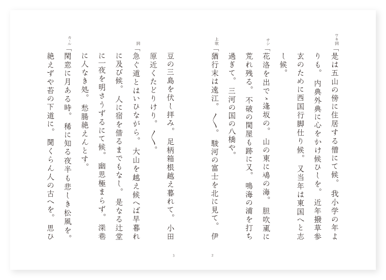 シテ 北条氏政の霊 ワキ 五山の僧 所 相模小田原 時 秋 ワキ詞「是は五山の傍に住居する僧にて候。我小学の年よりも。内典外典に心をかけ候ひしを。近年撥草参玄のために西国行脚仕り候。又当年は東国へと志し候。 サシ「花洛を出でゝ逢坂の。山の東に鳰の海。胆吹颪に荒れ残る。不破の関屋も跡に又。鳴海の浦を打ち過ぎて。三河の国の八橋や。 上歌「猶行末は遠江。〳〵。駿河の富士を北に見て。伊豆の三島を伏し拝み。足柄箱根越え暮れて。小田原近くたどりけり。〳〵。 詞「急ぐ道とはいひながら。大山を越え候へば早暮れに及び候。人に宿を借るまでもなし。是なる辻堂に一夜を明さうずるにて候。幽思極まらず。深巷に人なき処。愁腸絶えんとす。 カヽル「閑窓に月ある時。稀に知る夜半も悲しき松風を。絶えずや苔の下道に。聞くらん人の古へを。思ひやるこそあはれなれ。 シテ詞「なふ〳〵御僧は何くの人にてましませば。程近からん人家をば尋ね給はで。此草深き松陰に。露の宿りをしめ給ふぞ。 ワキ詞「是は捨身の事なれば。樹下石上の住居こそおのづからなる座禅の床なれ。何か此身に厭ふべき。 シテ詞「げにも捨身の御僧の。心の内こそ奇特なれ。さもおろかなる身の上に。真如実相参得の。教を示し給へとよ。 ワキカヽル「もとより心外無別法。満目青山これこそは。教の外の伝へなれ。 シテ「いざさらば立ち寄りて。 ワキ「猶参学を。 シテ「極めんと。 地「岩がねの苔の緑を片敷の。〳〵。袖の白露こぼれそひ。一むら薄ほの〴〵と。月落ちかゝる山の端に。秋風吹きて虫の音を。誘ふは荻の上葉かな。〳〵。 ワキ詞「如何に尉殿。此国は北条家年久しく守護し給ひし処と承り及びて候。北条の氏政父子果て給ひし由来を語つて御聞かせ候へ。 シテ詞「心得申し候。念頃に御物語申さうずるにて候。 クリ地「さても当家は先祖より。東の方を残らずも。従へ来つゝあたりには。恐れをなさぬ人もなく。心にまかせ居たりしに。 シテサシ「秀吉公は日本の。世の政あづかりて。靡かぬ草木もなかりけり。 シテ「氏政も此度は。都に登り礼譲を。なし申さんと定めしを。家中の者にいひなされ。又上洛を違変する。 クセ「然れば都には。此由聞し召されつゝ。相国大に逆鱗の。書状を下し氏政が。父子の頭を刎ん事。踵を廻らすべからずと。書きとゞめけん言の葉に。無念を起し反逆の。色を顕はしにら山や。猶山中を固とし。足柄箱根の切所には。乱杭逆茂木柵を築き。たとひ大軍寄するとも。ゆめ〳〵叶ふべからずと。思ひ定めし半天の。雲を嵐の吹く如く。敵の人数に襲はれて。はかなくなりし氏政が。運の極まる処なり。 シテ「つら〳〵之を案ずるに。 地「昔周の代息侯は。鄭の荘公に。約を違ヘて戦ひしに。息の軍は破れつゝ。息侯滅びける事は。随ふべきに随はず。力も絶えて偽の。報いとこそは聞えけれ。北条も其如く。正理にそむく天命は。後にぞ思ひ知られたる。 ロンギ地「げに老人の夜もすがら。〳〵。古事語り聞きしより。故ある人と覚えたり。其名顕はし給へかし。 シテ「我はもとより埋木の朽ち果てたりし身なれども。夢にまみえて御僧の。教を頼むばかりなり。 地「身は朽ち果てゝ跡にしも。名は残りつゝ武士の。 シテ「八十氏人の氏政が。 地「幽霊なれや。 シテ「今こゝに。 地「忍ぶとすれど名取川。顕れ渡る埋木の。はかなき水のあはれ世の。面影消えて失せにけり。〳〵。 ワキ歌「麻衣草の苔路の露の世に。〳〵。不測不説の理りも。妙なる文字の跡見する。水鳥樹林おのづから。声法事をやなしぬらん。〳〵。 後ジテ「周孔盗跖塵の世の。迷悟善悪諸共に。如夢幻泡影如露亦如電。応作如是観。 詞「さて御僧の示し給ふ。禅法猶も参得の。志にて再来を。いかでか咎め給ふべき。 ワキ「さては氏政の幽霊夢幻に来れるかや。さらば過ぎこし秋の夜の。最期を顕はし見せ給へ。 シテ詞「お僧の仰に叛かじと。語るにつけて無念さの。数も限りもなかりけり。既に官軍寄せくれば。彼山中の固めには。我身に変らぬ一類の。兵撰び入れ置きて。こゝを先途と待ちかけしに。 地「近江の国の中納言秀次の卿。此度の先陣を望み。険難の谷峰いはず攻め登れば。味方の兵ふせぎ矢射る矢下にかゝりて。堀をば飛び越えいかきはね越え。秀次真先かけ給ひ。向ふ者をば切て捨て。逃ぐるを追ひ掛け残さず亡ぼし給ひけり。相国城に入り給ひ。如何に秀次いしくも励ます戦功かな。此軍忠の恩恵に。世の政譲らんと。かたく契約ましませば。秀次の卿拝請し。名をも雲井に揚げ給ふ。其時相国は。勢ひに依つて破れとの。其先言に任せつゝ。今度は相国先掛にて。此小田原に攻め寄する。切つて出でんと思ひしに。同名なりし陸奥守。諫めて曰く此城を。離れて打ち出で給ふならば。雑兵の手にかゝりつゝ。必ず不覚あるべし。我介錯を申さんと。涙を流し申せしを。 シテ「尤と同心し。 地「尤と同心し。自害をせんと剣を抜き。弓手へ指し立て馬手へ引く。う