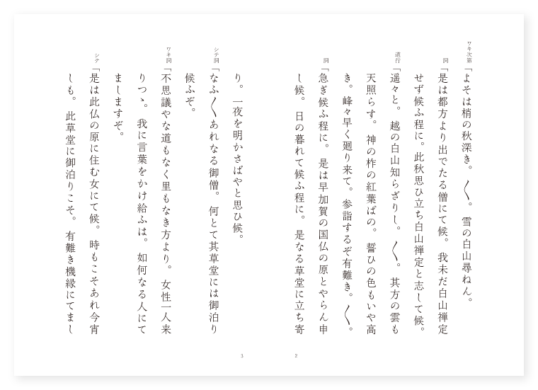 世阿弥作 前 ワキ 旅僧 シテ 里女 後 ワキ 前に同じ シテ 仏御前 地は 加賀 季は 秋九月 ワキ次第「よそは梢の秋深き。〳〵。雪の白山尋ねん。 詞「是は都方より出でたる僧にて候。我未だ白山禅定せず候ふ程に。此秋思ひ立ち白山禅定と志して候。 道行「遥々と。越の白山知らざりし。〳〵。其方の雲も天照らす。神の柞の紅葉ばの。誓ひの色もいや高き。峰々早く廻り来て。参詣するぞ有難き。〳〵。 詞「急ぎ候ふ程に。是は早加賀の国仏の原とやらん申し候。日の暮れて候ふ程に。是なる草堂に立ち寄り。一夜を明かさばやと思ひ候。 シテ詞「なふ〳〵あれなる御僧。何とて其草堂には御泊り候ふぞ。 ワキ詞「不思議やな道もなく里もなき方より。女性一人来りつゝ。我に言葉をかけ給ふは。如何なる人にてましますぞ。 シテ「是は此仏の原に住む女にて候。時もこそあれ今宵しも。此草堂に御泊りこそ。有難き機縁にてましませ。今日は思ふ日に当れり。御経を読み仏事をなしてたび給へ。さなきだに五障三従の此身なれば。迷ひの雲も晴れ難き。心の水の濁りを澄まして。涼しき道に引導し給へ。 ワキ「御経を読み仏事をなせと承る。それこそ出家の望みなれ。さて〳〵吊ひ申すべき。亡者は誰にてましますぞ。 シテ「さらば其名を顕はすべし。いにしへ仏御前と申しし白拍子は。此国より出でし人なり。都に上り舞女のほまれ世に勝れたまひしが。後には故郷なればとて此国に帰り。終にここにて空しくなる。跡のしるしも此草堂の。露と消えにし其跡なり。 ワキ「不思議やさてはいにしへの。其名に聞えし仏御前の。亡き跡までも名を留めて。 シテ「仏の原といふ名所も。昔をとゞむる名残なれば。 ワキ「今吊ふも疑ひなき。成仏の縁ある其人の。 シテ「名も頼もしや一仏成道。 ワキ「観見法界。 シテ「草木国土。 二人「悉皆成仏と聞く時は。 地「仏の原の草木まで。〳〵。皆成仏は疑はず。有難や折からの。野もせにすだく虫の音までも。声仏事をやなしぬらん。山風も夜嵐も。声澄み渡る此原の。草木も心あるやらん。〳〵。 ワキ詞「猶々仏御前の御事委しく御物語り候へ。 地クリ「昔し平相国の御時。妓王妓女仏刀自とて。温顔舞曲花めきて。世上に名を得し遊女有りしに。 シテサシ「始めは妓王を召し置かれて。遊舞の寵愛甚しくて。 地「色香を飾る玉衣の。袖の白露起き臥しの。御簾の内を立ち去らで。さながら宮女の如くなりしに。 シテ「思はざるに折を得て。 地「仏御前を召されしより。御心うつりていつしかに。妓王は出だされ参らせて。 シテ「世を秋風の音更けて。 地「涙の雨もをやみもせず。 クセ「実にや思ふ事。叶はねばこそ浮世なれ。我は本より優色の。花一時の盛なれば。散るを何と恨みんや。嵐は吹けども。松は本より常盤なり。いつ歎き。いつ驚かん浮世ぞと。思へばかゝる折節の。来たるこそ教へなれ。しかも迷ひを照らすなる。 シテ「弥陀の御国も其方ぞと。 地「頼みをかけて西山や。浮世の嵯峨の奥深き。草の庵の隠家の。隠れて住むと思ひしに。思ひの外なる仏御前の。様を変へ来りたり。こはそもさるにても。かく捨つる身と為りぬれど。猶も御身の恨めしさの。執心は残るに。そもかゝる心持つ人かや。今こそ誠の。仏にてましませとて。妓王は手を合はせ。感涙を流すばかりなり。 ロンギ地「昔語りはさて置きぬ。さて今跡を吊ひ給ふ。御身如何なる人やらん。 シテ「我は誰とか岩代の。松の葉結ぶ露の身の。行方を何と問ひ給ふ。 地「行方いづくと白雪の。跡を見よとは此原の。 シテ「草の庵はこゝなれや。 地「露の身を置く。 シテ「草堂の。 地「主は仏よといひ捨てゝ。立ち去る影は草衣。尾花が袖の露分け。草堂の内に入りにけり。〳〵。(中入) ワキ歌「松風寒き此原の。〳〵。草の仮寐のとことはに。御法をなして夜もすがら。彼跡吊ふぞ有難き。〳〵。 後ジテ「あら有難の御経やな。早明方にもなるやらん。遠寺の鐘も幽に響き。月落ちかゝる山かづらの。嵐烈しき仮寐の床に。夢ばし覚まし給ふなよ。 ワキ「不思議やな仏の原の草枕に。遊女の影の見え給ふは。如何様きゝつる仏御前の。幽霊にてぞましますらん。 シテ詞「恥かしながら古の。仏といはれし名を便にて。輪廻の姿も歌舞をなす。 ワキ「極楽世界の御法の声。 シテ「仏事をなすや。 ワキ「此原の。 シテ「仏の舞の妙なる袖。 地「草木も靡く気色かな。(序の舞) シテ「ひとり猶仏の御名を尋ね見ん。 地「おの〳〵帰る法の庭人。法の庭人の。 シテ「法の教へも幾程の世ぞや。 地「前仏は過ぎぬ。 シテ「後仏はいまだなり。 地「夢の中間は。 シテ「此世の内ぞや。 地「鐘も響き。 シテ「鳥も音を鳴く。 地「夜半の内なる夢幻の。一睡の内ぞ仏も有るまじ。まして人間も。 シテ「嵐吹く雲水の。 地「嵐吹く雲水の。天に浮べる波の。一滴の露の始めをば。何とかゝへす舞の袖。一歩挙げざる先をこそ。仏の舞とはいふべけれと。うたひ捨てゝ失せにけりや。うたひ捨てゝ失