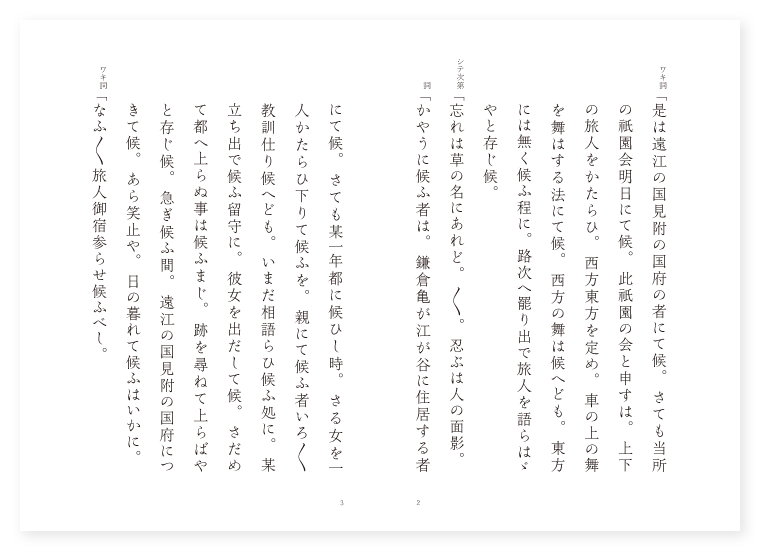 増作 ワキ 里人 シテ 鎌倉の男 ツレ 都の女 地は 遠江 季は 六月 ワキ詞「是は遠江の国見附の国府の者にて候。さても当所の祇園会明日にて候。此祇園の会と申すは。上下の旅人をかたらひ。西方東方を定め。車の上の舞を舞はする法にて候。西方の舞は候へども。東方には無く候ふ程に。路次へ罷り出で旅人を語らはゞやと存じ候。 シテ次第「忘れは草の名にあれど。〳〵。忍ぶは人の面影。 詞「かやうに候ふ者は。鎌倉亀が江が谷に住居する者にて候。さても某一年都に候ひし時。さる女を一人かたらひ下りて候ふを。親にて候ふ者いろ〳〵教訓仕り候へども。いまだ相語らひ候ふ処に。某立ち出で候ふ留守に。彼女を出だして候。さだめて都へ上らぬ事は候ふまじ。跡を尋ねて上らばやと存じ候。急ぎ候ふ間。遠江の国見附の国府につきて候。あら笑止や。日の暮れて候ふはいかに。 ワキ詞「なふ〳〵旅人御宿参らせ候ふべし。 シテ詞「あら嬉しや候。俄に日の暮れて候ふ処に。御宿御貸しあるべきと承り候。やがて参らうずるにて候。 ワキ「此方へ御入り候へ。いかに申すべき事の候。 シテ「何事にて候ふぞ。 ワキ「思し召しよらぬ申し事にて候へども。当所の祇園の会明日にて候。かの祇園会と申すは。上下の旅人をかたらひ。西方東方をさだめ。車の上の舞をまはうずる法にて候ふ程に。そと御舞ひ候へ。 シテ「是は思ひもよらぬ事を承り候ふ物かな。それがしは一期に舞まうたる事はなく候。なか〳〵思ひもよらぬ事にて候。 ワキ「いや何と仰せ候ふとも。舞はせ申さでは叶ひ候ふまじ。 シテ「是は人を尋ねて都へ上る者にて候ふ間。自余の人に仰せられ候へ。 ワキ「人を尋ねて御上り候はゞ。当社の御はからひにて。末はめでたうやがて御逢ひ候べし唯御舞ひ候へ。 地「足いたや旅人の。はや伏柴の鳥の網。のがるべき方もあらばこそ。中々さる者と。見え申すこそ恨みなれ。 ワキ詞「日本一の事にて候。御領掌かしこまり候。やがて御こしらへ候へ。先々西方の舞を御始め候へ。 地クリ「在中将業平。契りを結びし美人の数を尋ぬるに。三千七百三十三人なり。 ツレ「およそ伊勢物語に見えたるは以上十二人なり。 地「第一は紀の有常が娘。第二には忠仁公の御娘。清和天皇の皇后に。染殿の后是なり。 クセ「第五には長柄の卿の御娘。第六は筑紫の染川の里の女なりけり。第十は増尾の卿の妹に。恋死の女是なり。十一は周防の守在原の仲平が娘なりけり。十二には大和の守継蔭が娘に。今の伊勢にてありしが。其名の処を書きかへて。皇后の上童に。まし子の前とぞ召されける。住吉の社に参りて。日数を送り紀念する。懇誓しきりに隙なくは。感応いかで無からんと。頼みを深く掛けまくも。かしこき神の御前にて。静かに法施を参らせ。宮人とおぼしき老体に。此物語を尋ぬれば。 ツレ「いさとよ対面の始めに。 地「伊勢物語の奥儀を。くれ〴〵と語らんは。かつうは空恐ろし。かつうは道の聊爾なりとて。左右なう物をも言はざりけり。美人の中に取りては。何れか劣り勝らん。 ワキ詞「近頃御舞見事にて候。さらば東方の舞を御始めあらうずるにて候。 シテ詞「かしこまつて候。 シテクリ「漢皇三尺の剣。 地「居ながら秦の乱を鎮めたり。 シテ「比叡山延暦寺の座主。法性坊の僧正とて。尊き人おはします。 地「此人は三伏の夏の夜。五更もいまだ明けざるに。九識の窓の前。十乗の床のほとりに。瑜伽の法水をたゝへて。三密の月を澄まし見るに。 クセ「妻戸をほと〳〵と。たゝく声すなり。誰なるらんと思し召し。戸を開き見給へば。過ぎにし二月や。後の五日に。世を早うすと聞えし。菅亟相にておはします。不思議やと思し召し。請じ入れ奉り。深夜の御光臨。何事にかはと有りしかば。菅相答へてのたまはく。濁れる世に生れて。無実の讒言力なし。讒臣の仇を報ぜん為め。雷とならんとき。禅室ばかりこそ。威光めでたう候へ。いかなる勅使なりとも。内裏に参り給はずは。生々世々に此恩を。などかは報ぜざるべき。此御難儀は申しても。余りあるべし。いかなる勅使なりとても。二度までは参るまじ。勅使三度に及ばゝ。普天の下卒土の内。王土にあらずといふ事なし。さのみはいかゞと有りしかば。菅亟相の御色は。事の外に変はりたり。折節御前に。柘榴を置かれたりしを。追つ取り口に含んで。はら〳〵と噛みくだき。妻戸にくわつと吐きかくる。赤き柘榴は忽ちに。火焰となつて妻戸に。三尺ばかり燃えあがる。 シテ「僧正見給ひ。洒水の印を結んで。鑁字の明を誦せしかば。火焰は消えにけりやな。其妻戸は山上の。本坊に今もありと聞ゆる。 ワキ詞「近頃いづれも御舞見事にて候。見物衆の中より今一番と御所望にて候。 ツレ詞「大磯の虎が祐成に名残をしみの所を舞はうずるにて候。 ワキ「何と大磯の虎が祐成に名残をしみの処を舞はうずると仰せられ候ふか。さらば東方へも所望申さうずるにて候。いかに申し候。見物衆の中よりあまりに御舞見事にて候