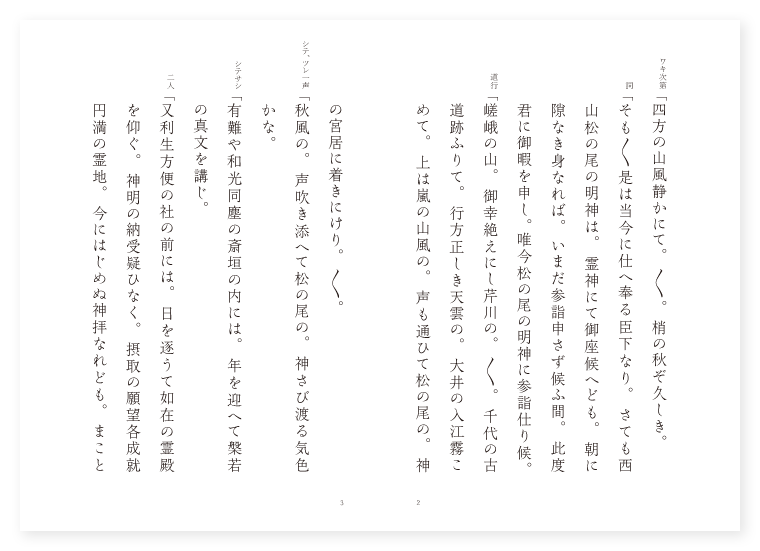 世阿弥作 前 ワキ 官人 シテ 老翁 ツレ 男 後 ワキ 前に同じ シテ 松尾明神 地は 山城 季は 秋 ワキ次第「四方の山風静かにて。〳〵。梢の秋ぞ久しき。 詞「そも〳〵是は当今に仕へ奉る臣下なり。さても西山松の尾の明神は。霊神にて御座候へども。朝に隙なき身なれば。いまだ参詣申さず候ふ間。此度君に御暇を申し。唯今松の尾の明神に参詣仕り候。 道行「嵯峨の山。御幸絶えにし芹川の。〳〵。千代の古道跡ふりて。行方正しき天雲の。大井の入江霧こめて。上は嵐の山風の。声も通ひて松の尾の。神の宮居に着きにけり。〳〵。 シテ、ツレ一声「秋風の。声吹き添へて松の尾の。神さび渡る気色かな。 シテサシ「有難や和光同塵の斎垣の内には。年を迎へて槃若の真文を講じ。 二人「又利生方便の社の前には。日を逐うて如在の霊殿を仰ぐ。神明の納受疑ひなく。摂取の願望各成就円満の霊地。今にはじめぬ神拝なれども。まことに貴き社内かな。 下歌「時しも今は長月の。紅葉も四方の気色にて。 上歌「春見しは。花の都の雲霞。〳〵。立つや日数も移り来て。今ぞ時なる秋の空。曇らぬ月の都路に。ゆきゝも繁き諸人の。秋ゆたかなる心かな。〳〵。 ワキ詞「如何に是なる老人に尋ぬべき事の候。 シテ詞「老人とは此方の事にて候ふか。まづ御姿を見奉れば。此あたりにては見馴れ申さぬ御事なり。都よりの御参詣にて御座候ふか。 ワキ「実によく見てあるものかな。都より始めて当社参詣の者なり。山の姿神館の面白さに詠め居て候。当社の御謂委しく申し候へ。 シテ「さん候此山林は。皆神の御敷地なり。誠に御代千秋の君が住む。都は間近き神前にて。 ツレ「むかふ梅津の秋の葉は。河水に浮ぶ綾錦。 シテ詞「織りかく雲も小倉山。しぐるゝ頃の朝な〳〵。 ワキ「昨日は薄きもみぢ葉の。 シテ「今日は濃染の色深き。 ワキ「西紅の峰つゞき。 シテ「さながら四方の。 二人「錦なれども。 地「松の尾の。山は梢の秋ならで。〳〵。唯時雨のみ年経るや。霜の後。雪の冬木になるまでも。時知らぬ常盤木の。いく久し神松の。落葉ばかりは塵の世に。交はる誓ひ頼もしや。〳〵。 地クリ「それ天は陽を以て徳とし。地は陰を以て用とす。 シテサシ「然れば神は人天百王の守護神として。 地「本地寂光の都を出で給ひ。此閻浮提に示現し。五衰の睡りを無上正覚の月に覚まし。 シテ「国土豊に民厚かれと。 地「安全を守りおはします。 クセ「和光同塵は結縁の御はじめ。八相成道は利物の終りを見する御誓ひ。実に目前にあらたなり。仏は又常住不滅の相を顕はし。有無中道を離れて。人を済度の方便。是れ以て同じ悲願なり。神といひ仏といひ。唯是れ水波の隔てにて。本地垂跡と顕はれ。三世了達の智恵を以て。現当二世までの。道を照らし給へり。さればにや此社。いづくもといひながら。殊に所も九重の。雲居の西の山の端を。照らすや光りも夕月の。空さえて嵐山の。峰には実相の声満ちて。聞法の便のみ。大井の波の音までも。常楽我浄の。結縁をなす心なり。 シテ「梅津桂の色々に。 地「日も茜さす紫野。北野平野や賀茂貴船。祇園林の秋の風。稲荷の山のもみぢ葉の。青かりし恵みもさま〴〵に。誓ひの色はかはれども。此神は分きて世の。月常住の地をしめ。王城を守る神徳の。久しき国に跡垂れて。慈尊三会の暁を。松の尾の神垣。かはらぬ色ぞ久しき。 ロンギ地「実にや誓ひの秋久に。〳〵。代々を守りの御神徳。猶ゆくすゑぞ頼もしき。 二人「時しも今日の御神拝。有難しとも木綿四手の。神の夜神楽めん〳〵に。神をすゞしめ申さん。 地「さては時しも夜神楽の。声も普き数々に。 二人「すはや照り添ふ夕月の。 地「庭燎の光り。 二人「榊葉を。 地「うたふ乙女の袖はえて。花の裳裙も色々に。紅葉をかざし松の尾の。神の告を都人。夜神楽を拝み給へとよ。〳〵。(中入) ワキ歌「実に今とても神の代の。〳〵。誓ひは尽きぬしるしとて。神と君との御恵み。まことなりけり有難や。〳〵。 後ジテ「それ千秋の松が枝には。万歳の緑常盤にて。御代を守りの御影山。君安全に民栄え。五日の風も枝を鳴らさぬ。松の尾の神とは我事なり。 地「八乙女の。袖もかざしの玉かづら。 シテ「かけてぞ祈る玉松の。 地「光りも散るや露も白縫の。鈴も颯々の。舞の袂はおもしろや。(神舞) ロンギ地「秋の夜神楽声澄みて。〳〵。神さびわたる深更の。朱の光りは有難や。 シテ「庭燎の影も明らけき。榊葉うたふ妙文の。こや松の尾の神風。ふけ行く秋ぞ惜しまるゝ。 地「実に惜しむべし惜しむべし。今宵の時も逢ひにあふ。 シテ「月の光りも照り添ふや。 地「朱の玉垣。 シテ「玉の扉。 地「さし引く袖の露かけて。光りも散るなり小忌衣。立ち舞ふ花も白妙の。雪をめぐらし千早ぶる。神ぞ久しき松の尾の。おのづから長き夜の。神楽ぞめでたかりける。〳〵。 底本:国立国会図書館デジタルコレクション『謡曲評釈 第五輯』大和田建樹 著