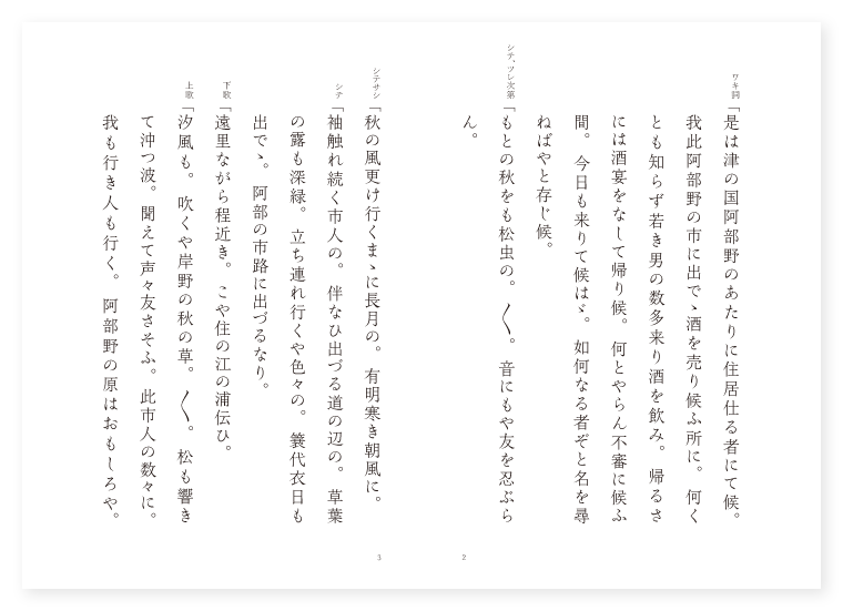 前 ワキ 市人 シテ(男) 客人 ツレ(同) 同じく 後 ワキ 前に同じ シテ 亡霊 地は 摂津 季は 九月 ワキ詞「是は津の国阿部野のあたりに住居仕る者にて候。我此阿部野の市に出でゝ酒を売り候ふ所に。何くとも知らず若き男の数多来り酒を飲み。帰るさには酒宴をなして帰り候。何とやらん不審に候ふ間。今日も来りて候はゞ。如何なる者ぞと名を尋ねばやと存じ候。 シテ、ツレ次第「もとの秋をも松虫の。〳〵。音にもや友を忍ぶらん。 シテサシ「秋の風更け行くまゝに長月の。有明寒き朝風に。 シテ「袖触れ続く市人の。伴なひ出づる道の辺の。草葉の露も深緑。立ち連れ行くや色々の。簔代衣日も出でゝ。阿部の市路に出づるなり。 下歌「遠里ながら程近き。こや住の江の浦伝ひ。 上歌「汐風も。吹くや岸野の秋の草。〳〵。松も響きて沖つ波。聞えて声々友さそふ。此市人の数々に。我も行き人も行く。阿部野の原はおもしろや。〳〵。 ワキ「伝へ聞く白楽天が酒功賛を作りし琴詩酒の友。今も知られて市屋形に。樽をすゑ盃をならべて。寄り来る人を待ち居たり。 詞「如何に人々酒召され候へ。 シテ「我宿は菊売る市にあらねども。四方の門辺に人さわぐと。よみしも古人の心なるべし。如何に人々面々に。霊酒を汲みてもてなし給へ。 ワキ「又彼人の来れるぞや。 詞「今日はいつより酒をたゝへ。遊楽遊舞の和歌を詠じ。人の心を慰め給へ。早くな帰り給ひそとよ。 シテ「何我を早くな帰りそとよ。 ワキ「中々の事暮過ぐるとも。月をも見捨て給ふなよ。 シテ「仰せまでもなし何とてか。此酒友をば見捨つべき。古き詠にも花のもとに。 ワキ「帰らん事を忘るゝは。 シテ「美景によると作りたり。 二人「樽の前に酔をすゝめては。是れ春の風ともいへり。 地「今は秋の風。暖め酒の身を知れば。薬と菊の花のもとに。帰らん事を忘れ。いざや御酒を愛せん。たとひ暮るゝとも。〳〵。夜遊の友に馴衣の。袂に受けたる月影の。うつろふ花の顔ばせの。盃に向へば。色も猶まさり草。千年の秋をも限らじや。松虫の音も尽きじ。いつまで草のいつまでも。変はらぬ友こそは。買ひ得たる市の宝なれ。〳〵。 ワキ詞「如何に申し候。唯今の言葉の末に。松虫の音に友を忍ぶと承り候ふは。如何なる謂にて候ふぞ。 シテ詞「さん候それに付いて物語の候ふ語つて聞かせ申し候ふべし。 ワキ「さらば御物語り候へ。 シテ「むかし此阿部野の松原を。ある人二人連れて通りしに。折節松虫の声おもしろく聞えしかば。一人の友人。彼虫の音を慕ひ行きしに。今一人の友人。やゝ久しく待てども帰らざりし程に。心もとなく思ひ尋ね行き見れば。彼者草露に臥して空しくなる。死なば一所とこそ思ひしに。こはそも何と云ひたる事ぞとて。泣き悲しめどかひぞなき。 地「其まゝ土中に埋木の。人知れぬとこそ思ひしに。朽ちもせで松虫の。音に友を忍ぶ名の。世に漏れけるぞ悲しき。今も其。友を忍びて松虫の。〳〵。音に誘はれて市人の。身を変へて亡き跡の。亡霊こゝに来りたり。恥かしや是までなり。立ちすがりたる市人の。人かげに隠れて。阿部野の方に帰りけり。〳〵。 ロンギ地「不思議やさては此世にも。なき影すこし残しつゝ。此程の友人の。名残を暫し留め給へ。 シテ「折節秋の暮。松虫も鳴く物を。我をや待つ声ならん。 地「そも心なき虫の音の。我を待つ声ぞとは。誠しからぬ言葉かな。 シテ「虫の音も。〳〵。忍ぶ友をば待てばこそ。言の葉にもかゝるらめ。 地「実に〳〵思ひ出だしたり。古き歌にも秋の野に。 シテ「人松虫の声すなり。 地「我かと行きて。いざとぶらはんと。思し召すか人々。有難や。是ぞ誠の友を。忍ぶぞよ松虫の。音に伴なひて帰りけり。虫の音に連れて帰りけり。(中入) ワキ歌「松風寒き此原の。〳〵。草の仮寐のとことはに。御法をなして夜もすがら。彼跡とふぞ有難き。〳〵。 後ジテ「あら有難の御弔ひやな。秋霜に枯るゝ虫の音聞けば。閻浮の秋に帰る心。猶郊原に朽ち残る。魄霊是まで来りたり。うれしく弔ひ給ふ物かな。 ワキ「はや夕影も深緑。草の花色露深き。其方を見れば人影の。幽に見ゆるは有りつる人か。 シテ詞「中々なれやもとよりの。昔の友を猶忍ぶ。虫の音ともに顕はれて。手向を受くる草衣の。 ワキ「浦は難波の里も近き。 シテ「阿部の市人馴れ〳〵て。 ワキ「弔ふ人も。 シテ「弔はるゝ我も。 ワキ「いにしへ今こそ。 シテ「かはれども。 地「故郷に。住みしは同じ難波人。住みしは同じ難波人。蘆火焼く屋も市屋形も。かはらぬ契りを忍草の。忘れ得ぬ友ぞかし。あらなつかしの心や。 地クリ「忘れて年を経し物を。又いにしへに帰る波の。何はの事のよしあしも。実に隔てなき友とかや。 シテサシ「朝に落花を踏んで相伴なつて出づ。 地「夕べには飛鳥に従つて一時に帰る。 シテ「然れば花鳥遊楽の瓊莚。 地「風月の友にさそはれて。春の山辺や秋の野の。草葉にすだく虫までも。聞けば心の友ならずや。 クセ「一樹の陰の宿りも。