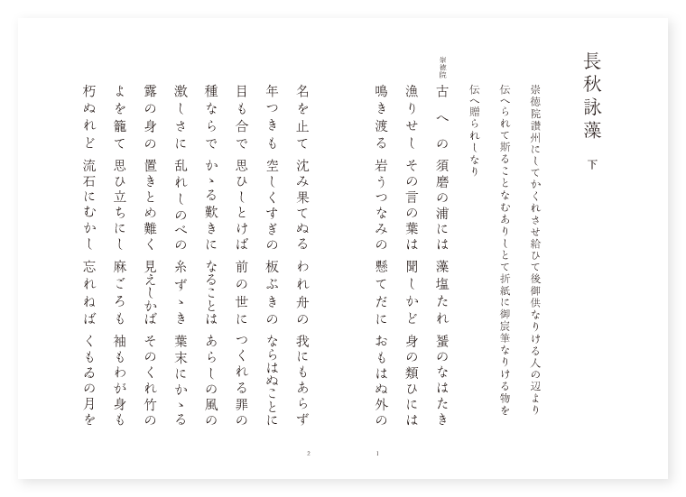 新院は佗しい配所の御住居に、明け暮れ在りし日の夢を追ひ給ひ、「望郷の鬼とならん。」と仰せられたが、御発念あつて五部の大乗経を三年間かゝつて御写経遊ばされ、貝鐘の音も聞えぬ所に置くのを残念に思召して、八幡山か高野山、御許があるならば鳥羽の安楽寿院の故鳥羽法皇の御墓所へ奉納し度き旨、仁和寺の五の宮へ申入れさせられた。五の宮から関白忠通へ此由お伝へになり、忠通は色々御取計らひ申上げたが勅許なく、御写経を御戻し遊ばされたので、御室から書を添へて御返しになつた。