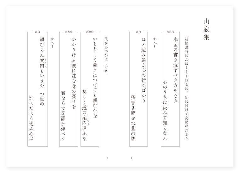 仁安三年の冬、西行法師が諸国修行の途次、白峰の御陵に参拝して往時を思ひ出でて、一首を詠じた。