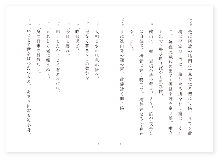 井阿弥作 前 ワキ 旅僧 シテ 老翁 ツレ 老女 後 ワキ 前に同じ シテ 平通盛 ツレ 小宰相局 地は 阿波 季は 秋 ワキ詞「是は阿波の鳴門に一夏を送る僧にて候。さても此浦は平家の一門はて給ひたる所なれば痛はしく存じ。毎夜此磯辺に出でゝ御経を読み奉り候。唯今も出でゝ弔ひ申さばやと思ひ候。 歌「磯山に。暫し岩根の待つ程に。〳〵。誰が夜舟とは白波に。楫音ばかり鳴門の。浦静かなる今宵かな。〳〵。 ツレサシ「すは遠山寺の鐘の声。此磯近く聞え候。 シテ「入相ごさめれ急が給へ。 ツレ「程なく暮るゝ日の数かな。 シテ「昨日過ぎ。 ツレ「今日と暮れ。 シテ「明日またかくこそ有るべけれ。 ツレ「されども老に頼まぬは。 シテ「身の行末の日数なり。 二人一声「いつまで世をばわたづみの。あまりに隙も波小舟。 ツレ「何を頼みに老の身の。 シテ「命の為めに。 二人「使ふべき。 地「憂きながら。心の少し慰むは。〳〵。月の出汐の海士小舟。さも面白き浦の秋の気色かな。所は夕浪の。鳴門の沖に雲つゞく。淡路の島や離れ得ぬ。浮世の業ぞ悲しき。〳〵。 シテサシ「暗濤月を埋んで清光なし。 ツレ「舟に焚く海士の篝火更け過ぎて。 二人「苫よりくゞる夜の雨の。蘆間に通ふ風ならでは。音する物も波枕に。夢か現か御経の声の。嵐につれて聞ゆるぞや。楫音を静め唐櫓を抑へて。聴聞せばやと思ひ候。 ワキ「誰そや此鳴門の沖に音するは。 シテ「泊り定めぬ海士の釣舟候ふよ。 ワキ「さもあらば思ふ子細有り。此磯近く寄せ給へ。 シテ「仰せに随ひさし寄せ見れば。 ワキ「二人の僧は巌の上。 シテ「漁の舟は岸の陰。 ワキ「蘆火の影を仮初に。御経を開き読誦する。 シテ「有難や漁する。業は蘆火と思ひしに。 ワキ「善き灯に。 シテ「鳴門の海の。 二人「弘誓深如海。歴劫不思議の奇縁によりて。五十展転の随喜功徳品。 下歌「実に有難や此経の。面ぞ闇き浦風も。蘆火の影を吹き立てゝ。聴聞するぞ有難き。 上歌「龍女変成と聞く時は。〳〵。姥も頼もしや。祖父はいふに及ばず。願ひも三つの車の。蘆火は清く明かすべし。猶々御経遊ばせ。〳〵。 ワキ詞「あら嬉しや候。火の光りにて心静かに御経を読み奉りて候。先々此浦は。平家の一門果て給ひたる所なれば。毎夜此磯辺に出でゝ御経を読み奉り候。取り分き如何なる人此浦にて果て給ひて候ふぞ。委しく御物語り候へ。 シテ詞「仰せの如く或は討たれ。又は海にも沈み給ひて候。中にも小宰相の局こそ。や。諸共に御物語り候へ。 ツレ「さる程に平家の一門。馬上を改め。海士の小船に乗り移り。月に棹さす時もあり。 シテサシ「こゝだにも都の遠き須磨の浦。 二人「思はぬ敵に落されて。実に名を惜しむ武士の。磤馭盧島や淡路潟。阿波の鳴門に着きにけり。 ツレ「さる程に小宰相の局乳母を近づけ。 二人「如何に何とか思ふ。我頼もしき人々は都に留まり。通盛は討たれぬ。誰を頼みてながらふべき。此海に沈まんとて。主従泣く〳〵手を取り組み舟端に臨み。 ツレ「さるにてもあの海にこそ沈まうずらめ。 下歌地「沈むべき身の心にや。涙の兼ねて浮ぶらん。 上歌「西はと問へば月の入る。〳〵。其方も見えず大方の。春の夜や霞むらん。涙も共に曇るらん。乳母泣く〳〵取り付きて。此時の物思ひ。君一人に限らず。思し召し止り給へと。御衣の袖に取り付くを。振り切り海に入ると見て。老人も同じ満汐の。底の水屑となりにけり。〳〵。(中入) ワキ歌「此八軸の誓ひにて。〳〵。一人も洩らさじの。方便品を読誦する。 ワキ「如我昔所願。 後ジテ「今者已満足。 ワキ「化一切衆生。 シテ「皆令入仏道の。 地「通盛夫婦。御経に引かれて立ち帰る波の。 シテ「あら有難の御法やな。 ワキ「不思議やなさもなまめける御姿の。波に浮びて見え給ふは。いかなる人にてましますぞ。 ツレ「名ばかりはまだ消え果てぬあだ波の。阿波の鳴門に沈み果てし。小宰相の局の幽霊なり。 ワキ「今一人は甲冑を帯し。兵具いみじく見え給ふは。いかなる人にてましますぞ。 シテ「是は生田の森の合戦に於て。名を天下に掲げ。武将たつし誉れを。越前の三位通盛。昔を語らん其為に。是まで顕はれ出でたるなり。 地サシ「そも〳〵此一の谷と申すに前は海。上は嶮しき鵯越。まことに鳥ならでは翔り難く獣も。足を立つべき地にあらず。 シテ「唯幾度も追手の陣を心もとなきぞとて。 地「宗徒の一門さし遣はさる。通盛も其随一たりしが。忍んで我陣に帰り。小宰相の局に向ひ。 クセ「既に軍。明日にきはまりぬ。痛はしや御身は。通盛ならで此うちに。頼むべき人なし。我ともかくもなるならば。都に帰り忘れずは。亡き跡とひてたび給へ。名残惜しみの御盃。通盛酌を取り。指す盃の宵の間も。転寐なりし睦言は。たとへば唐の。項羽高祖の攻を受け。数行虞氏が涙も。是にはいかで増さるべき。灯闇うして。月の光りにさし向ひ。語り慰む所に。 シテ「舎弟の能登の守。 地「早甲冑をよろひつゝ。通盛は何くにぞ。など遅