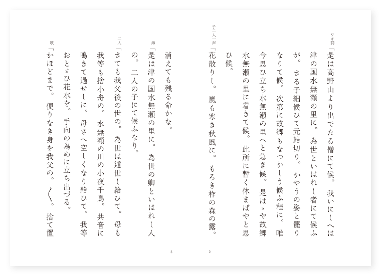 ワキ 高野の僧(為世) 子二人 姉と弟 シテ 子の亡母 地は 摂津 季は 秋 ワキ詞「是は高野山より出でたる僧にて候。我いにしへは津の国水無瀬の里に。為世といはれし者にて候ふが。さる子細候ひて元結切り。かやうの姿と罷りなりて候。次第に故郷もなつかしう候ふ程に。唯今思ひ立ち水無瀬の里へと急ぎ候。是はゝや故郷水無瀬の里に着きて候。此所に暫く休まばやと思ひ候。 子二人一声「花散りし。嵐も寒き秋風に。もろき柞の森の露。消えても残る命かな。 姉「是は津の国水無瀬の里に。為世の卿といはれし人の。二人の子にて候ふなり。 二人「さても我父後の世の。為世は遁世し給ひて。母も我等も捨小舟の。水無瀬の川の小夜千鳥。共音に鳴きて過せしに。母さへ空しくなり給ひて。我等おとゞひ花水を。手向の為めに立ち出づる。 歌「かほどまで。便りなき身を我父の。〳〵。捨て置き給ふ思ひ子の。恋ひ悲しめるあはれさよ。人は帰らで見る夢の。別れとゞまる物ならば。現に逢はんよしもがな。〳〵。 ワキ詞「不思議やな是なる幼き者を見れば。古の某が子にて候。さらぬ様にて過ぎ行かばやと思ひ候。 弟「いかに姉上。聖の御通り候ふ御留め候へ。 姉「実によく仰せ候ふ御留め候へ。 二人「いかに御聖聞し召せ。往来の利益の御為めならば。我等が母の空しき跡。弔ひてたばせ給へなふ。 ワキ「無慙やな父とも知らでおとゞひは。利益をなさんと往来の。僧を供養し給ふぞや。さらば留まり申すべし。 二人「嬉しや今日は母上の。空しき跡の其日なり。御経読みてたび給へ。 ワキ「それこそ易き御事なれと。落つる涙を押さへつゝ。御経を読まんと志せば。 二人「我等が母の亡き跡を。弔ひ給ふ御聖を。 ワキ「父とも知らで。 二人「今は又。 地「よそのあはれに言ひなして。〳〵。さらば留まりて。跡を弔らひ申さん。 二人「嬉しの今の仰せやと。おとゞひ共に喜べば。 地「見れば昔に変はりたる。庭の桂木窓の梅。主忘れぬしるしぞと。匂ひを留めて吹く風の。洩る月影も冷ましや。見苦しけれど此方へと。御僧を請じ入れければ。 ワキ「千度百度親子ぞと。 地「名乗らばやとは思へども。輪廻の業の目を塞ぎ。念仏申し撫子の。弔ふ法の結縁に。正覚ならせ給へや。〳〵。 ワキ「南無幽霊成等正覚。 シテ「念仏衆生無量寿如来。 ワキ「一代教主釈迦牟尼法号。 シテ「来迎引摂。 地「あら有難や。 ワキ「更闌け夜静かに帳門開かざるに。影の如くに見え給ふは。此世には亡き古人の。姿顕はし給へるか。 シテ「恥かしや猶も輪廻に帰り来て。見え参らするは憚りなれども。親と名乗らで情なく。よそがましげにおはします。恨み申しに参りたり。 ワキ「尤それはさる事なれども。捨つる浮世の身を恥ぢて。親と名乗らぬばかりなり。 シテ「なふ包むも事による物をと。亡者は子供の手を取りて。 ワキ「草の枕の夜の宿。 シテ「夢に相逢ふ親と子の。 子二人「袂にすがれば。 ワキ「兎も角も。 地「争ひかねて捨人は。いとゞ心の迷ひ子に。親と名乗らんは。よその人目もいかならん。 シテ「羨ましや父も子も。 地「同じ浮世の身にあれば。逢瀬の便もあるぞかし。我は冥途に帰りなば。いつ又夢にも逢ふべき。 地「緑子は三界の。〳〵。首かせに繫がれて。娑婆にも行かれず冥途にも。帰りかねて悲しやな。苦しみは受くれども。忘るゝ隙なきは。娑婆に残る妄執。愛着恋慕の妨ぐる。心の鬼の身を責めて。烏羽玉の黒髪を手に繰りからまき。引つ提げ引きすゑ左右に引き分けて。立つも立たれず居るも居られぬ。因果の車の廻り来て。問へども何かは答ふべき。叫べども叶はず。 シテ「されどもかやうの弔ひに。 地「されどもかやうの弔ひに。今こそ親子に鸚鵡の袖を。振り切りがたき糸竹の。紫雲たなびき音楽聞え。紫雲たなびき音楽聞えて。成仏するこそ有難けれ。成仏するぞ有難き。 底本:国立国会図書館デジタルコレクション『謡曲評釈 第八輯』大和田建樹 著