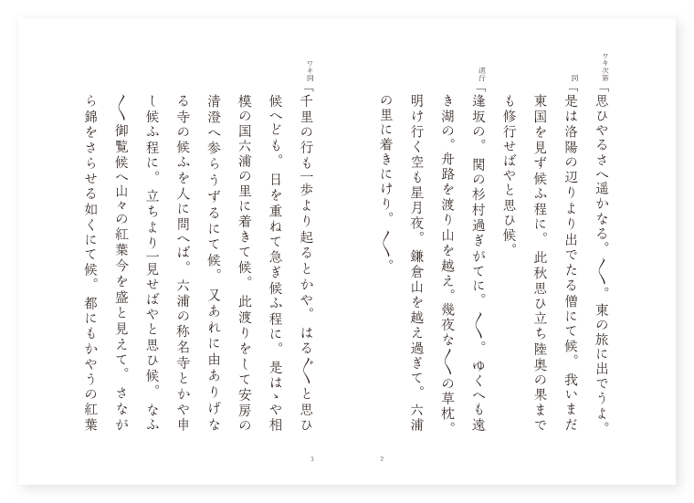 左阿弥作 前 ワキ 都の僧 シテ 里女 後 ワキ 前に同じ シテ 楓の精 地は 武蔵 季は 九月 ワキ次第「思ひやるさへ遥かなる。〳〵。東の旅に出でうよ。 詞「是は洛陽の辺りより出でたる僧にて候。我いまだ東国を見ず候ふ程に。此秋思ひ立ち陸奥の果までも修行せばやと思ひ候。 道行「逢坂の。関の杉村過ぎがてに。〳〵。ゆくへも遠き湖の。舟路を渡り山を越え。幾夜な〳〵の草枕。明け行く空も星月夜。鎌倉山を越え過ぎて。六浦の里に着きにけり。〳〵。 ワキ詞「千里の行も一歩より起るとかや。はる〴〵と思ひ候へども。日を重ねて急ぎ候ふ程に。是はゝや相模の国六浦の里に着きて候。此渡りをして安房の清澄へ参らうずるにて候。又あれに由ありげなる寺の候ふを人に問へば。六浦の称名寺とかや申し候ふ程に。立ちより一見せばやと思ひ候。なふ〳〵御覧候へ山々の紅葉今を盛と見えて。さながら錦をさらせる如くにて候。都にもかやうの紅葉の候ふべきか。また是なる本堂の庭に楓の候ふが。木立余の木に勝れ。唯夏木立の如くにて。一葉も紅葉せず候。如何さま謂のなき事は候ふまじ。人来りて候はゞ尋ねばやと思ひ候。 シテ詞「なふ〳〵御僧は何事を仰せ候ふぞ。 ワキ詞「さん候是は都より始めて此所一見の者にて候ふが。山々の紅葉今を盛と見えて候ふに。是なる楓の一葉も紅葉せず候ふ程に。不審をなし候。 シテ「げによく御覧じとがめて候。いにしへ鎌倉の中納言為相の卿と申しゝ人。紅葉を見んとて此所に来り給ひし時。山々の紅葉いまだなりしに。此木一本に限り紅葉色深くたぐひなかりしかば。為相の卿とりあへず。如何にして此一本に時雨れけん。山にさきだつ庭のもみぢ葉と詠じ給ひしより。今に紅葉をとゞめて候。 ワキ「おもしろの御詠歌やな。われ数ならぬ身なれども。手向の為めにかくばかり。旧りはつる此一本の跡を見て。袖のしぐれぞ山にさきだつ。 シテ詞「あら有難の御手向やな。いよ〳〵此木の面目にてこそ候へ。 ワキ「さて〳〵先に為相の卿の御詠歌より。今に紅葉をとゞめたる。謂は如何なる事やらん。 シテ「実に御不審は御理り。さきの詠歌に預かりし時。此木心に思ふやう。かゝる東の山里の。人も通はぬ古寺の庭に。われ先だちて紅葉せずは。いかで妙なる御詠歌にも預かるべき。功成り名遂げて身退くは。是れ天の道なりといふ古き言葉を深く信じ。今に紅葉をとゞめつつ。唯常盤木の如くなり。 ワキ「是は不思議の御事かな。此木の心をかほどまで。しろしめしたる御身はさて。如何なる人にてましますぞ。 シテ「今は何をか包むべき。我は此木の精なるが。御僧たつとくまします故に。唯今顕はれ来りたり。今宵はこゝに旅居して。夜もすがら御法を説き給はゞ。重ねて姿を見え申さんと。 地「夕べの空も冷ましく。此古寺の庭の面。霧の籬の露深き。千草の花をかき分けて。ゆくへも知らずなりにけり。〳〵。(中入) ワキ歌「所から。心にかなふ称名の。〳〵。御法の声も松風も。はや更け過ぐる秋の夜の。月澄み渡る庭の面。寐られんものかおもしろや。〳〵。 後ジテ「あら有難の御弔ひやな。妙なる値遇の縁にひかれて。二度こゝに来りたり。夢ばしさまし給ふなよ。 ワキ「不思議やな月澄みわたる庭の面に。有りつる女人とおぼしくて。影の如くに見え給ふぞや。草木国土悉皆成仏の。此妙文を疑ひ給はで。なほ〳〵昔を語り給へ。 シテクリ「夫れ四季をり〳〵の草木。おのれ〳〵の時を得て。 地「花葉さま〴〵の其姿を。心なしとは誰かいふ。 シテサシ「夫れ青陽の春の初め。 地「色香たへなる梅が枝の。かつ咲きそめて諸人の。心や春になりぬらん。 シテ「又は桜の花盛。 地「唯雲とのみ三吉野の。千本の花にしくはなし。 クセ「月日経て。移れば変はる詠めかな。桜は散りし庭の面に。咲きつゞく卯の花の。垣根や雪にまがふらん。時移り夏暮れ。秋も半になりぬれば。空定めなき村時雨。きのふは薄きもみぢ葉も。露しぐれ洩る山は。下葉残らぬ色とかや。 シテ「さるにても。東の奥の山里に。 地「あからさまなる都人の。あはれも深き言の葉の。露の情にひかれつゝ。姿をまみえ数々に。言葉をかはす値遇の縁。深き御法を授けつゝ。仏果を得しめ給へや。 シテ「更け行く月の夜遊をなし。 地「色なき袖をやかへさまし。(序の舞) シテ「秋の夜の。千夜を一夜に重ねても。 地「言葉のこりて鳥や鳴かまし。 シテ「八声の鳥も数々に。 地「八声の鳥も数々に。鐘も聞ゆる。 シテ「明方の空の。 地「所は六浦の浦風山風。吹きしをり吹きしをり。散るもみぢ葉の月に照り添ひて。唐紅の庭の面。明けなば恥かし。暇申して帰る山路に。行くかと思へば木の間の月の。〳〵。かげろふ姿となりにけり。 底本:国立国会図書館デジタルコレクション『謡曲評釈 第四輯』大和田建樹 著