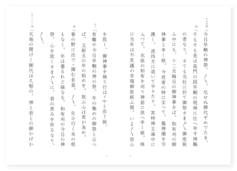 前 ワキ 早鞆神職 シテ 漁翁 ツレ 海士乙女 後 ツレ 前に同じ ツレ(天女) 神女 シテ 龍神 地は 豊前 季は 十二月 ワキ次第「今日早鞆の神祭。〳〵。尽せぬ御代ぞめでたき。 詞「そもそも是は長門の国早鞆の明神に仕へ申す神職の者なり。さても当社に於て御祭さま〴〵御座候ふ中にも。十二月晦日の御神事をば。和布刈の御神事と申し候。今夜寅の時に至つて。龍神潮を守護し。波四方に退いて平々たり。其時神主海中に入つて。水底の和布を刈り神前に供へ申し候。殊に当年は不思議の奇瑞御座候ふ間。いよ〳〵信心を致し。御神事を執り行はゞやと存じ候。 サシ「有難や今日早鞆の神の祭。年の極めの御祭と云つぱ。又新玉の年の始めを。祝ふ心は君が為め。 歌「春の野に出でゝ摘む若菜。〳〵。生ひ行く末の程もなく。年は暮るれど緑なる。和布刈の今日の神祭。心を致しさま〴〵に。君の恵みを祈るなり。〳〵。 シテ、ツレ一声「天地の開けし御代は久堅の。神と君との御かげかな。 ツレ「今日にめぐるも早鞆の。 二人「共に暮れ行く年なれや。 シテサシ「有難やそれ秋津洲の内に於て。神所の御祭さま〴〵なれども。 二人「此早鞆の神祭り。世界わたづみ隔てなくて。薀藻の礼奠感応の。海松和布浮和布の花も咲く。波をかざしの手向草。塵に交はる神心。誓ひに漏るゝ方もなし。 下歌「歩みを運ぶ此神に。いざ結縁をなさうよ。 上歌「所は早鞆の。〳〵。ゆきゝの舟も楫を絶え。数々の捧物。海士のしわざに至るまで。かひ有るべしや志。それこそ花の手向なれ。〳〵。 ワキ「不思議やな夕影すぐる神の御前に。手向を捧ぐる人影は。そもや如何なる人やらん。 ツレ「是は賤しき海士乙女の。数には有らぬ憂き身なるが。手向を捧ぐるばかりなり。 シテ詞「我は又年経て住める此浦の。漁翁の罪を恐るゝ故。賤しき者は軽き身を。浮べん為めにて候ふなり。 ワキ「中々なれや鱗までも。誓ひに漏れぬ此浦の。 シテ「海士の漁火焦がるとも。 二人「和光の影は曇りなく。 下歌地「明らかなれや天地の。開けし神代の如くにて。すなほなるべき人心。いやましの瑞験。顕はれにけるぞ有難き。 上歌「海原や。博多の海も程近く。〳〵。汐引島も見え渡る。早鞆の友千鳥。沖の鷗も群れ立つや。春秋の。雲井の雁もとゞめ得ぬ。誰が玉章の門司の関守と。よみし心も理や。〳〵。 地クリ「それ地神第四の御代。火々出見尊。豊玉姫と契りをなし。海陸の隔てなかりしに。 シテサシ「其御産の時豊玉姫。尊に向ひ宣はく。 地「産後に於て我姿を。あへて見給ふ事なかれと。御約諾の詔。互にかたく誓ひ給ふ。 クセ「然れども時至り。さすがに御気色。いぶかしく思しけるかとよ。かいまみえさせ給ひしを。いとあさましと恨みかこち。長く海路の通ひを。立ち隠す波の玉の御子を。捨てつゝ豊玉姫は。龍宮に入り給ふ。其後潮さしひきの。朝暮の時はありながら。人畜類の生をそむき。境をさかりにき。 シテ「然れば神代の昔より。 地「此早鞆の神祭り。神慮普き誓ひなれや。上は非想の雲の上。下は下界の龍神まで。渇仰の心中。まことに深き蒼海を。陸地になして此国の。長門の通ひ隔てもなき。海蔵の御宝も。意の如くなるべし。 ロンギ地「げにや心の如くにて。〳〵。此結縁もさま〴〵の。人の願ひの無かるべき。 ツレ「今は何をか包むべき。我住む方は久方の。 地「天つ乙女の雲の袖。 シテ「かざしの花の手向草。 地「色こそかはれ。 シテ「わたづみの。 地「花は波路の底よりも。龍宮の捧げもの。天地ともに渇仰の。天つ乙女は雲に乗れば。翁は老の波に。隠れ入り給ひけりや。隠れ入らせ給ひけり。(中入) 地「汀に神幸なり給へば。〳〵。虚空に音楽松風に和して。皎月照らし異香薫ずる。龍女は波をもかざしの袖を。かへすも立ち舞ふ袂かな。(天女の舞) 天女「さる程に〳〵。 地「和布刈の時至り。虎嘯くや風早鞆の。龍吟ずれば雲起り雨となり。潮も光り鳴動して。沖より龍神あらはれたり。 地「龍神すなはち現はれて。〳〵。 シテ「和布刈の所の水底を穿ち。 地「払ふや汐瀬に。こゆるぎの磯菜摘む。 シテ「めざし濡らすな沖に居れ波。 地「沖に居れ波と夕汐を退け。屛風を立てたる如くに分れて。海底の砂は平々たり。 ワキ「神主松明振り立てゝ。 地「神主松明振り立てゝ。御鎌を持つて岩間を伝ひ。つたひ下つて半町ばかりの。海底の和布を刈り帰り給へば。程なく跡に汐さし満ちて。もとの如く荒海となつて。波白妙のわたづみ和田の原。天を浸し。雲の波煙の波風。海上にをさまれば。波風海上にをさまれば蛇体は。龍宮に飛んでぞ入りにける。 底本:国立国会図書館デジタルコレクション『謡曲評釈 第七輯』大和田建樹 著