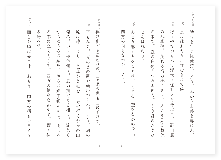 観世小次郎作 世阿弥作とも 前 シテ 貴女 ツレ 侍女 ワキ 平維茂 トモ 従者 後 ワキ 前に同じ シテ 鬼神 地は 信濃 季は 九月 シテ、ツレ次第「時雨を急ぐ紅葉狩。〳〵。ふかき山路を尋ねん。 シテ「是は此あたりに住む女にて候。 一同「げにやながらへて浮世に住むとも今は早。誰白雲の八重葎。茂れる宿の淋しきに。人こそ見えね秋の来て。庭の白菊うつろふ色も。うき身のたぐひとあはれなり。 シテ「あまり淋しき夕まぐれ。しぐるゝ空をながめつゝ。四方の梢もなつかしさに。 下歌一同「伴ひ出づる道のべの。草葉の色も日にそひて。 上歌「下もみぢ。夜のまの露や染めつらん。〳〵。朝の原は昨日より。色ふかき紅を。分け行くかたの山深み。げにや谷河に。風の掛けたる柵は。流れもやらぬもみぢ葉を。渡らば錦中絶えんと。まづ木の本に立ちよりて。四方の梢をながめて。暫く休み給へや。 ワキサシ「面白や頃は長月廿日あまり。四方の梢もいろ〳〵に。錦を色どる夕時雨。ぬれてや鹿のひとり鳴く。声をしるべの狩場のすゑ。げに面白き景色かな。 トモ一声「明けぬとて。野辺より山に入る鹿の。跡吹き送る風の音に。駒の足並勇むなり。 歌「大丈夫が。弥猛心の梓弓。〳〵。入る野の薄露分けて。行くへも遠き山陰の。しがきの道のさかしきに。落ちくる鹿の声すなり。風のゆくへも心せよ。〳〵。 ワキ詞「如何に誰かある。 トモ詞「御前に候。 ワキ「あの山陰にあたつて人影の見え候ふは。如何なる者ぞ名を尋ねて来り候へ。 トモ「畏つて候。名を尋ねて候へば。やごとなき上﨟の。幕うちまはし屛風を立て。酒宴なかばと見えて候ふ程に。懇にたづねて候へば。名をば申さず。只さる御方とばかり申し候。 ワキ「あら不思議や。此あたりにてさやうの人は思ひもよらず候。よし誰にてもあれ上﨟の。道のほとりの紅葉狩。ことさら酒宴の半ならば。かた〴〵乗打叶ふまじと。 地「馬よりおりて沓をぬぎ。〳〵。道をへだてゝ山陰の。岩の崖路を過ぎ給ふ。心づかひぞたぐひなき。〳〵。 シテ「げにや数ならぬ身ほどの山の奥に来て。人は知らじと打ち解けて。ひとりながむるもみぢ葉の。色見えけるか如何にせん。 ワキ「我は誰とも白真弓。たゞやごとなき御事に。恐れて忍ぶばかりなり。 シテ「忍ぶもぢずり誰ぞとも。知らせ給はぬ道のべの。たよりに立ち寄り給へかし。 ワキ「思ひよらずの御事や。何しに我をば留め給ふべきと。さらぬやうにて過ぎ行けば。 シテ「あら情なの御事や。一村雨の雨宿り。 ワキ「一樹の陰に。 シテ「立ちよりて。 地「一河の流れを汲む酒を。いかでか見捨て給ふべきと。恥かしながらも。袂にすがりとゞむれば。さすが岩木にあらざれば。心よわくも立ち帰る。所は山路の菊の酒。何かは苦しかるべき。 地クリ「げにや虎渓を出でし古も。心ざしをば捨てがたき。人の情の盃の。深き契のためしとかや。 シテサシ「林間に酒をあたゝめて紅葉を焼くとかや。 地「げに面白や所から。巌の上の苔莚。片敷く袖も紅葉衣の。くれなゐ深き顔ばせの。 ワキ「此世の人とも思はれず。 地「胸うち騒ぐばかりなり。 クセ「さなきだに人心。乱るゝふしは竹の葉の。露ばかりだに受けじとは。思ひしかども盃に。向へばかはる心かな。されば仏も戒めの。道はさま〴〵多けれど。ことに飲酒を破りなば。邪婬妄語も諸共に。乱心の花かづら。斯かる姿はまた世にも。たぐひ嵐の山桜。よその見る目も如何ならん。 シテ「よしや思へば是とても。 地「前世のちぎり浅からぬ。深き情の色見えて。かゝる折しも道のべの。草葉の露のかごとをも。かけてぞ頼む行末を。契るもはかな打ちつけに。人の心も白雲の。立ちわづらへるけしきかな。かくて時刻も移りゆく。雲に嵐の声すなり。散るか正木の葛城の。神のちぎりの夜かけて。月の盃さす袖も。雪をめぐらす袂かな。堪へず紅葉。(中の舞) シテ「堪へず紅葉青苔の地。 地「堪へず紅葉青苔の地。又これ涼風暮れゆく空に。雨うちそゝぐ夜嵐の。もの凄ましき山陰に。月待つほどのうたゝ寐に。かたしく袖も露深し。夢ばし覚まし給ふなよ。〳〵。(中入) ワキ「あらあさましや我ながら。無明の酒の酔心。まどろむ隙もなき内に。新なりける夢の告と。 地「驚く枕に雷火みだれ。天地もひゞき風遠近の。たづきも知らぬ山中に。覚束なしや恐ろしや。 歌「不思議や今までありつる女。〳〵。とり〴〵化生の姿をあらはし。あるひは巌に火焰を放ち。または虚空に焰を降らし。咸陽宮の煙の内に。七尺の屛風の上になほ。あまりて其たけ一丈の鬼神の。角はかぼく眼は日月。面を向くべきやうぞなき。 ワキ「維茂すこしも騒がずして。 地「維茂すこしも騒ぎ給はず。南無や八幡大菩薩と。心に念じ。剣を抜いて待ちかけ給へば。微塵になさんと飛んでかゝるを。飛び違ひむずと組み。鬼神の真中さしとほす所を。頭をつかんで上らんとするを。切り払ひ給へば。剣に恐れて巌へ上るを。引きおろし刺し通し。忽ち鬼神を従へ給ふ