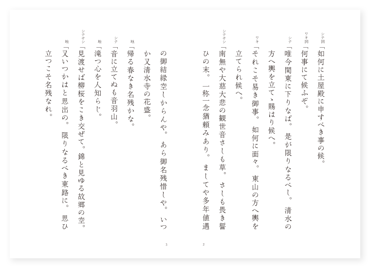 結崎十郎作 世阿弥作とも シテ 主馬盛久 ワキ 土屋三郎 ワキヅレ 太刀取 地は 京都より鎌倉に至る 季は 春 シテ詞「如何に土屋殿に申すべき事の候。 ワキ詞「何事にて候ふぞ。 シテ「唯今関東に下りなば。是が限りなるべし。清水の方へ輿を立てゝ賜はり候へ。 ワキ「それこそ易き御事。如何に面々。東山の方へ輿を立てられ候へ。 シテサシ「南無や大慈大悲の観世音さしも草。さしも畏き誓ひの末。一称一念猶頼みあり。ましてや多年値遇の御結縁空しからんや。あら御名残惜しや。いつか又清水寺の花盛。 地「帰る春なき名残かな。 シテ「音に立てぬも音羽山。 地「滝つ心を人知らじ。 シテサシ「見渡せば柳桜をこき交ぜて。錦と見ゆる故郷の空。 地「又いつかはと思出の。限りなるべき東路に。思ひ立つこそ名残なれ。 シテ「我なまじひに弓馬の家に生れ。世上に隠れなき身とて。 地「思はざる外の旅行の道。関の東に趣けば。跡白河を行く波の。いつ帰るべき旅ならん。 下歌「こゝは誰をか松坂や。四の宮河原四の辻。 上歌「是や此。行くも帰るも別れては。〳〵。知るも知らぬも。逢坂の関守も。今の我をばよも留めじ。勢田の長橋うち渡り。立ち寄る影は鏡山。さのみ年経ぬ身なれども。衰へは老曽の。森を過ぐるや美濃尾張。熱田の浦の夕汐の。道をば波に隠されて。廻れば野辺に鳴海潟。又八橋や高師山。〳〵。 ロンギ地「汐見坂橋本の。浜名の橋を打ち渡り。 シテ「旅衣。かく来て見んと思ひきや。命なりけり。小夜の中山は是かとよ。 地「変はる淵瀬の大井川。過ぎ行く波も宇津の山。 シテ「越えても関に清見潟。 地「三保の入海田子の浦。打ち出でゝ見れば真白なる。雪の富士の嶺箱根山。猶明け行くや星月夜。早鎌倉に着きにけり。〳〵。 シテサシ「夢中に道あつて塵埃を隔つ。実にやそことも知らざりし。山を越え水を渡つて。此関東に着きぬ。百年の栄花は塵中の夢。一寸の光陰は沙裏の金。実にや故郷は雲井のよそ。千代もと契りし友人も。変はる世なれや我一人。鎌倉山の雲霞。実に斯かる身の習ひかや。 詞「かくてながらへ諸人に面をさらさんより。天晴疾う斬らればやと思ひ候。 ワキ詞「あら痛はしや盛久の独言を仰せ候。如何に申し候。土屋が参りて候。 シテ詞「土屋殿と候ふや此方へ御入り候へ。 ワキ詞「御下向の由を披露申して候へば。急ぎ誅し申せとの御事にて候。 シテ「唯今も独言に申しゝ如く。かくてながらへ諸人に面を曝さんよりも。天晴疾う斬らればやとの念願。さては早叶ひて候ふよ。さて最期は唯今にて候ふか。 ワキ「いや御最期は此暁か。然らずは明夜かと仰せ出だされて候。 シテ「さては暫くの時刻にて候ふよ。さても此程土屋殿の御芳志。申すも中々愚かなり。又無からん跡一返の念仏をも御回向に預からば。二世までの御芳志たるべし。我此年月清水の観世音を信じ。毎日彼御経を怠る事なし。さりながら今日はいまだ読誦申さず候ふ程に。御暇を賜はり候へ。彼御経を読誦申したく候。 ワキ「それこそ有難う候へ。土屋も是にて聴聞申さうずるにて候。 シテ「有難や大慈大悲は薩埵の悲願。定業亦能転は菩薩の直道とかや。願はくは無縁の慈悲を垂れ。我を引導し給へ。今生の利益もし欠けば。後生善所をも誰か頼まん。二世の願望もし空しくは。大聖の誓約豈虚妄にあらずや。或遭王難苦臨刑欲寿終。念彼観音力刀尋段々壊。 ワキ詞「有難や此御経を聴聞申せば。御命も頼もしうこそ候へ。 シテ詞「実によく御聴聞候ふ物かな。此文と謂つぱ。たとひ人王難の災に逢ふといふとも。その剣段々に折れ。 ワキ「又衆怨悉退散といふ文は。射る矢も其身に立つまじければ。 シテ「実に頼もしや去りながら。全く命の為めに此文を誦するにあらず。 二人「種々諸悪趣地獄鬼畜生。生老病死苦以漸悉令滅。 地「此文の如くは。諸の悪趣をも。三悪道は遁るべしや。有難しと夕露の。命は惜しまず。唯後生こそは悲しけれ。 地「昔在霊山の。御名は法華一仏。今西方の主又。娑婆示現し給ひて。我等が為めの観世音。三世の利益同じくは。かく刑戮に近き身の。誓ひにいかで洩るべきや。盛久が終の道。よも闇からじ頼もしや。 シテ詞「あら不思議や。少し睡眠の内に。新なる霊夢を蒙りて候ふは如何に。あら有難や候。 ワキ「既に八声の鶏鳴いて。御最期の時節唯今なり。早々御出で候へとよ。 シテ詞「待ち設けたる事なれば。左には金泥の御経。右には思ひの珠の緒の。命も今を限りなれば。是ぞ此世を門出の庭に。足よわ〳〵と立ち出づる。 ワキ「武士前後を囲みつゝ。是ぞ別れの鶏の声。 シテ「鐘も聞ふる東雲に。 ワキ「籠より籠の輿に乗せ。 シテ「由比の汀に。 ワキ「急ぎけり。 地「夢路を出づる曙や。〳〵。後の世の門出なるらん。 ワキ「さて由井の汀に着きしかば。座敷を定め敷皮しかせ。早々直らせ給ふべし。 シテ詞「盛久やがて座に直り。清水の方は其方ぞと。西に向ひて観音の。御名を称へて待ちければ。 太刀取「太刀取後