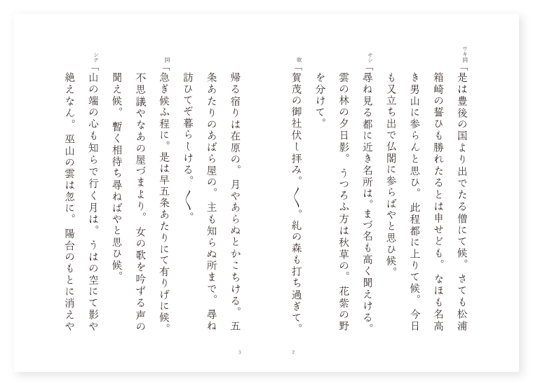 世阿弥作 前 ワキ 豊後の僧 シテ 里女 後 ワキ 前に同じ シテ 夕顔の上 地は 京都 季は 秋 ワキ詞「是は豊後の国より出でたる僧にて候。さても松浦箱崎の誓ひも勝れたるとは申せども。なほも名高き男山に参らんと思ひ。此程都に上りて候。今日も又立ち出で仏閣に参らばやと思ひ候。 サシ「尋ね見る都に近き名所は。まづ名も高く聞えける。雲の林の夕日影。うつろふ方は秋草の。花紫の野を分けて。 歌「賀茂の御社伏し拝み。〳〵。糺の森も打ち過ぎて。帰る宿りは在原の。月やあらぬとかこちける。五条あたりのあばら屋の。主も知らぬ所まで。尋ね訪ひてぞ暮らしける。〳〵。 詞「急ぎ候ふ程に。是は早五条あたりにて有りげに候。不思議やなあの屋づまより。女の歌を吟ずる声の聞え候。暫く相待ち尋ねばやと思ひ候。 シテ「山の端の心も知らで行く月は。うはの空にて影や絶えなん。巫山の雲は忽に。陽台のもとに消えやすく。湘江の雨はしば〳〵も。楚畔の竹を染むるとかや。 サシ「こゝは又もとより所も名を得たる。ふるき軒端の忍草。しのぶかた〴〵多き宿を。紫式部が筆の跡に。たゞ何某の院とばかり。書き置きし世は隔たれど。見しも聞きしも執心の。色をも香をも捨てざりし。 下歌「涙の雨は後の世の。さはりとなれば今も猶。 上歌「つれなくも。通ふ心の浮雲を。〳〵。はらふ嵐の風の間に。真如の月も晴れよとぞ。空しき空に仰ぐなる。〳〵。 ワキ詞「如何に是なる女性に尋ね申すべき事の候。 シテ詞「此方の事にて候ふか何事にて候ふぞ。 ワキ「さてこゝをば何くと申し候ふぞ。 シテ「是こそ何某の院にて候へ。 ワキ「不思議やな何某の山何某の寺は。名の上の唯かりそめの言の葉やらん。又それを其名に定めしやらん承りたくこそ候へ。 シテ「さればこそ初めより。むつかしげなる旅人と見えたれ。紫式部が筆の跡に。唯何某の院とかきて。其名をさだかにあらはさず。然れどもこゝは旧りにし融の大臣。住み給ひにし所なるを。其世をへだてゝ光君。また夕顔の露の世に。上なき思ひを見給ひし。名も恐ろしき鬼の形。それもさながら苔むせる。河原の院と御覧ぜよ。 ワキ「うれしやさては昔より。名におふ所を見る事よ。我等も豊後の国の者。其玉葛のゆかりとも。なして今又夕顔の。露きえ給ひし世語を。かたり給へや御跡を。及びなき身も弔はん。 シテクリ「そも〳〵光る源氏の物語。言葉幽艶をもとゝして。理浅きに似たりといへども。 地「心菩提心をすゝめて義ことに深し。誰かは仮にも語り伝へん。 シテサシ「中にも此夕顔の巻は。殊にすぐれてあはれなる。 地「情の道も浅からず。契り給ひし六条の。御息所に通ひ給ふ。よすがによりし中宿に。 シテ「唯やすらひの玉鉾の。 地「便りに立てし御車なり。 クセ「ものゝあやめも見ぬあたりの。小家がちなる軒のつまに。咲きかゝりたる花の名も。えならず見えし夕顔の。をり過さじとあだ人の。心の色は白露の。情おきける言の葉の。末をあはれと尋ね見し。閨の扇の色異に。たがひに秋の契りとは。なさゞりし東雲の。道の迷ひの言の葉も。此世はかくばかり。はかなかりける蜉蝣の。命懸けたる程もなく。秋の日やすく暮れはてゝ。宵の間過ぐる故郷の。松のひゞきも恐ろしく。 シテ「風にまたゝく灯火の。 地「消ゆると思ふ心地して。あたりを見ればうば玉の。闇の現の人もなく。如何にせんとか思河。うたかた人は息消えて。帰らぬ水の泡とのみ。散りはてし夕顔の。花は再び咲かめやと。夢に来りて申すとて。有りつる女も。かき消すやうに失せにけり。〳〵。(中入) ワキ歌「いざさらば夜もすがら。〳〵。月見がてらに明かしつゝ。法華読誦の声たえず。弔ふ法ぞ誠なる。〳〵。 後ジテサシ「さなきだに女は五障の罪ふかきに。聞くも気疎きもののけの。人うしなひし有様を。あらはす今の夢人の。跡よく弔ひ給へとよ。 ロンギ「不思議やさては宵の間の。山の端出でし月影の。ほの見えそめし夕顔の。末葉の露の消えやすき。本のしづくの世語を。かけて顕はし給へるか。 シテ「見給へこゝもおのづから。気疎き秋の野らとなりて。 ワキ「池は水草に埋もれて。古りたる松の陰暗く。 シテ「又鳴き騒ぐ鳥の枯声。身にしみわたるをりからを。 ワキ「さも物すごく思ひ給ひし。 シテ「心の水は濁江に。ひかれてかゝる身となれども。優婆塞が行ふ道をしるべにて。 地「来ん世も深き契り絶えすな。契り絶えすな。(序の舞) シテ「御僧の今の弔ひを受けて。 地「御僧の今の弔ひを受けて。かず〳〵うれしやと。 シテ「夕顔のゑみの眉。 地「開くる法華の。 シテ「花房も。 地「変成男子の願ひのまゝに。解脱の衣の袖ながら。今宵は何を包まんと。言ふかと思へば音羽山。嶺の松風かよひ来て。明けわたる横雲の。迷ひもなしや東雲の。道より法に出づるぞと。明けぐれの空かけて。雲のまぎれに失せにけり。 底本:国立国会図書館デジタルコレクション『謡曲評釈 第七輯』大和田建樹 著