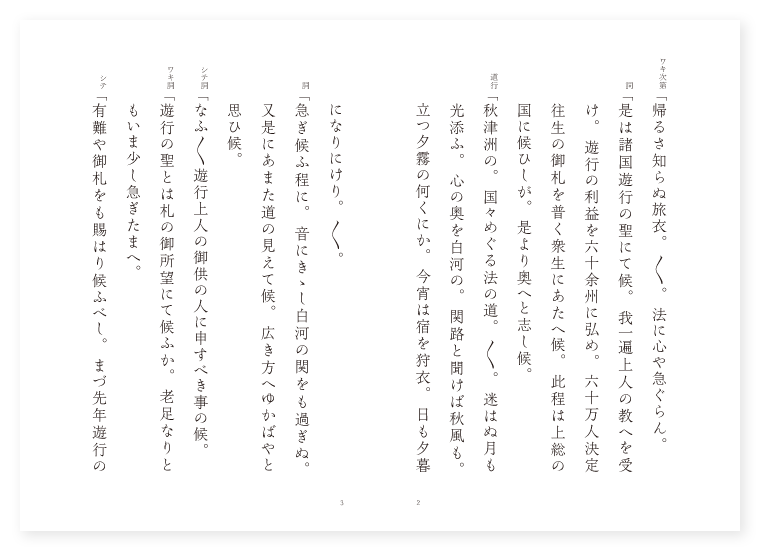 観世小次郎作 前 ワキ 遊行上人 シテ 老人 後 ワキ 前に同じ シテ 柳の精 地は 陸奥 季は 秋 ワキ次第「帰るさ知らぬ旅衣。〳〵。法に心や急ぐらん。 詞「是は諸国遊行の聖にて候。我一遍上人の教へを受け。遊行の利益を六十余州に弘め。六十万人決定往生の御札を普く衆生にあたへ候。此程は上総の国に候ひしが。是より奥へと志し候。 道行「秋津洲の。国々めぐる法の道。〳〵。迷はぬ月も光添ふ。心の奥を白河の。関路と聞けば秋風も。立つ夕霧の何くにか。今宵は宿を狩衣。日も夕暮になりにけり。〳〵。 詞「急ぎ候ふ程に。音にきゝし白河の関をも過ぎぬ。又是にあまた道の見えて候。広き方へゆかばやと思ひ候。 シテ詞「なふ〳〵遊行上人の御供の人に申すべき事の候。 ワキ詞「遊行の聖とは札の御所望にて候ふか。老足なりともいま少し急ぎたまへ。 シテ「有難や御札をも賜はり候ふべし。まづ先年遊行の御下向の時も。古道とて昔の街道を御通り候ひしなり。されば昔の道を教へ申さんとて。はる〴〵是までまゐりたり。 ワキ「不思議やさては先の遊行も。此道ならぬ古道を。通りし事の有りしよなふ。 シテ「昔は此道なくして。あれに見えたる一村の。森のこなたの河岸を。御通りありし街道なり。其上朽木の柳とて名木あり。かゝる尊き上人の。御法の声は草木までも。成仏の縁ある結縁たり。 下歌地「こなたへ入せたまへとて。老いたる馬にはあらねども。道しるべ申すなり。いそがせ給へ旅人。 上歌「げにさぞな処から。〳〵。人跡たえて荒れはつる。葎蓬生刈萱も。乱れあひたる浅茅生や。袖に朽ちにし秋の霜。露分衣来て見れば。昔を残す古塚に。朽木の柳枝さびて。影踏む道は末もなく。風のみ渡るけしきかな。〳〵。 シテ詞「是こそ昔の街道にて候へ。又是なる古塚の上なるこそ朽木の柳にて候ふよく〳〵御覧候へ。 ワキ詞「さては此塚の上なるが名木の柳にて候ひけるぞや。げに川岸も水絶えて。河そひ柳朽ち残る。老木はそれとも見えわかず。蔦葛のみ這ひかゝり。青苔梢を埋む有様。誠に星霜年旧りたり。さていつの世よりの名木やらん。くはしく語り給ふべし。 シテ「昔の人の申しおきしは。鳥羽の院の北面。佐藤兵衛憲清出家し。西行と聞えし歌人。此国に下り給ひしが。頃は水無月半なるに。此河岸の木のもとに。暫し立ちより給ひつゝ。一首を詠じ給ひしなり。 ワキ「謂を聞けば面白や。さて〳〵西行上人の。詠歌はいづれの言の葉やらん。 シテ「六時不断の御勤めの。隙なき内にも此集をば。御覧じけるか新古今に。 地「道のべに。清水ながるゝ柳陰。〳〵。しばしとてこそ立ちどまり。涼みとる言の葉の。末の世々までも。残る老木はなつかしや。かくて老人上人の。御十念を賜はり。御前を立つと見えつるが。朽木の柳の古塚に。寄るかと見えて失せにけり。〳〵。(中入) ワキ詞「不思議やさては朽木の柳の。我に詞をかはしけるよと。 歌「思ひの珠の数々に。〳〵。御法をなして称名の。声打ち添ふる初夜の鐘。月も曇らぬ夜もすがら。露をかたしく袂かな。〳〵。 シテ「沅水羅紋海燕かへる。柳条恨みを牽いて荊台に至る。徒に。朽木の柳時を得て。 地「今ぞ御法に合竹の。 シテ「直にみちびく弥陀の教へ。 地「衆生称念必得往生の。功力にひかれて草木までも。仏果に至る老木の柳の。髪も乱るゝ白髪の老人。忽然と顕はれ出でたる烏帽子も。柳さびたる有様なり。 ワキ「不思議やなさも古塚の草深き。朽木の柳の木の本より。其様化したる老人の。烏帽子狩衣を着しつゝ。顕はれ給ふは不審なり。 シテ詞「何をか不審し給ふらん。はや我姿は顕はし衣の。日も夕暮の道しるべせし。其老人にて候ふなり。 ワキ「さては昔の道しるべせし。人は朽木の柳の精。 シテ「御法の教へなかりせば。非情無心の草木の。台に到る事あらじ。 ワキ「中々なりや一念十念。 シテ「唯一声の内に生るゝ。 ワキ「弥陀の教へを。 シテ「身に受けて。 地「此界一人念仏名。西方便有一蓮生。但使一生常不退。此花帰つてこゝに向ひ。上品上生に。至らん事ぞうれしき。 シテ「釈迦すでに滅し。弥勒いまだ生ぜず。弥陀の悲願を頼まずは。いかで仏果に至るべき。 地クリ「南無や灑濁帰命頂礼。本願偽りましまさず。超世の悲願に身を任せて。他力の船に法の道。 シテサシ「すなはち彼岸に至らん事。一葉の船の力ならずや。彼黄帝の貨狄が心。聞くや秋吹く風の音に。散りくる柳の一葉の上に。蜘蛛の乗りてさゝがにの。糸引き渡る姿より。たくみ出だせる船の道。これも柳の徳ならずや。 シテ「其外玄宗華清宮にも。 地「宮前の楊柳寺前の花とて。詠め絶えせぬ名木たり。 クセ「そのかみ洛陽や。清水寺の古へ。五色に見えし滝浪を。尋ねのぼりし水上に。金色の光さす。朽木の柳忽に。楊柳観音とあらはれ。今に絶えせぬあととめて。利生あらたなる。歩みをはこぶ霊地なり。されば都の花盛。大宮人の御遊にも。蹴鞠の庭の面。四本の木陰枝たれて。暮に数ある沓の音