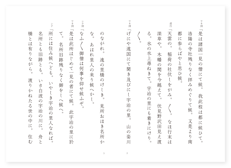 世阿弥作 前 ワキ 旅僧 シテ 老翁 後 ワキ 前に同じ シテ 源三位頼政 地は 山城 季は 五月 ワキ詞「是は諸国一見の僧にて候。我此程は都に候ひて。洛陽の寺社残りなく拝みめぐりて候。又是より南都に参らばやと思ひ候。 道行「天雲の。稲荷の社伏しをがみ。〳〵。なほ行末は深草や。木幡の関を今越えて。伏見野沢田見え渡る。水の水上尋ねきて。宇治の里にも着きにけり。〳〵。 ワキ詞「げにや遠国にて聞き及びにし宇治の里。山の姿川のながれ。遠の里橋のけしき。見所おほき名所かな。あはれ里人の来り候へかし。 シテ詞「なふ〳〵御僧は何事を仰せ候ふぞ。 ワキ詞「是は此所はじめて一見の者にて候。此宇治の里に於て。名所旧跡残りなく御をしへ候へ。 シテ「所には住み候へども。いやしき宇治の里人なれば。名所とも旧跡とも。いさ白波の宇治の川に。舟と橋とは有りながら。渡りかねたる世の中に。住むばかりなる名所旧跡。何とか答へ申すべき。 ワキ「いや左様には承り候へども。勧学院の雀は蒙求を囀るといへり。所の人にてましませば御心にくうこそ候へ。先喜撰法師が住みける庵はいづくの程にて候ふぞ。 シテ「さればこそ大事の事を御尋ねあれ。喜撰法師が庵は。我庵は都の巽しかぞ住む。世を宇治山と人はいふなり。人はいふなりとこそ。主だにも申し候へ。尉は知らず候。 ワキ「又あれに一村の里の見えて候ふは槙の島候ふか。 シテ「さん候槙の島とも申し。又宇治の河島とも申すなり。 ワキ「是に見えたる小島が崎は。 シテ「名に橘の小島が崎。 ワキ「向ひに見えたる寺は。いかさま恵心の僧都の。御法を説きし寺候ふな。 シテ「なふ〳〵旅人あれ御覧ぜよ。 歌「名にも似ず。月こそ出づれ朝日山。 地「月こそ出づれ朝日山。山吹の瀬に影見えて。雪さし下す島小舟。山も川もおぼろ〳〵として。是非をわかぬけしきかな。げにや名にしおふ。都にちかき宇治の里。聞きしにまさる名所かな。〳〵。 シテ詞「いかに申し候。此所に平等院と申す御寺の候ふを御覧ぜられて候ふか。 ワキ詞「不知案内の事にて候ふ程に。いまだ見ず候ふ御をしへ候へ。 シテ「此方へ御出で候へ。是こそ平等院にて候へ。又是なるは釣殿と申して。おもしろき所にて候ふよくよく御覧候へ。 ワキ「げに〳〵おもしろき所にて候。また是なる芝を見れば。扇の如く取り残されて候ふは。何と申したる事にて候ふぞ。 シテ「さん候此芝に付いて物がたりの候ふ語つて聞かせ申し候ふべし。昔此所に宮軍の有りしに。源三位頼政合戦に打ちまけ給ひ。此所に扇を敷き自害し果て給ひぬ。されば名将の古跡なればとて。扇のなりに取り残して。今に扇の芝と申し候。 ワキ「痛はしやさしも文武に名を得し人なれども。跡は草露の道の辺となつて。行人征馬のゆくへの如し。あら痛はしや候。 シテ詞「げによく御弔ひ候ふものかな。しかも其宮軍の月も日も今日に当りて候ふは如何に。 ワキ「何と其宮軍の月も日も今日に当りたると候ふや。 シテ「かやうに申せば我ながら。よそにはあらず旅人の。草の枕の露の世に。姿見えんと来りたり。うつゝとな思ひ給ひそとよ。 地「夢の浮世の中宿の。〳〵。宇治の橋守年を経て。老の浪も打ち渡す。遠方人に物申す。我頼政が幽霊と。名のりもあへず失せにけり。〳〵。(中入) ワキ詞「さては頼政の幽霊かりに顕はれ。我に言葉をかはしけるぞや。いざや御跡弔はんと。 歌「思ひよるべの波枕〳〵。汀も近し此庭の。扇の芝を片敷きて。夢の契を待たうよ。〳〵。 後ジテ「血は涿鹿の河と為つて。紅波楯を流し。白刃骨を砕く。世を宇治川の網代の波。あら閻浮恋しや。伊勢武者は皆緋威の鎧着て。宇治の網代にかゝりけるかな。うたかたの。あはれはかなき世の中に。 地「蝸牛の角の争ひも。 シテ「はかなかりける心かな。あら尊の御事や。猶々御経読み給へ。 ワキ「不思議やな法体の身にて甲胃を帯し。御経読めと承るは。いかさま聞きつる源三位の。其幽霊にてましますか。 シテ詞「げにや紅は園生に植ゑても隠れなし。名のらぬさきに。頼政と御覧ずるこそ恥かしけれ。唯々御経読み給へ。 ワキ「御心やすく思し召せ。五十展転の功力だに。成仏まさに疑ひなし。ましてや是は直道に。 シテ「弔ひなせる法の力。 ワキ「遭ひに遭ひたり所の名も。 シテ「平等院の庭の面。 ワキ「思ひ出でたり。 シテ「仏在世に。 地「仏の説きし法の庭。〳〵。こゝぞ平等大恵の。功力に頼政が。仏果を得んぞありがたき。 シテクリ「今は何をかつゝむべき。是は源三位頼政。執心の波に浮き沈む。因果の有様あらはすなり。 地サシ「抑治承の夏の頃。よしなき御謀叛をすゝめ申し。名も高倉の宮の内。雲井のよそに有明の。月の都を忍びいでゝ。 シテ「憂き時しもに近江路や。 地「三井寺さして落ち給ふ。 クセ「さるほどに。平家は時をめぐらさず。数万騎の兵を。関の東に遣はすと。聞くや音羽の山つゞく。山科の里近き。木幡の関をよそに見て。こゝぞ憂き世の旅心。宇