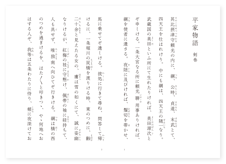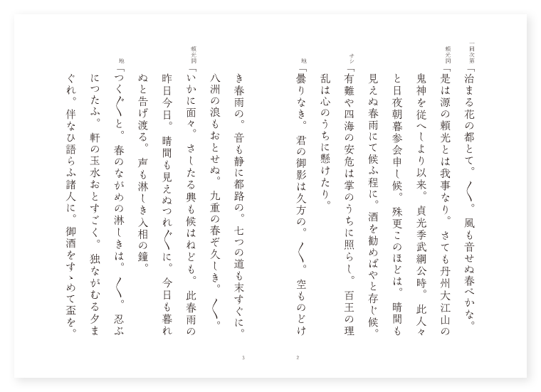 💡 本説を読む 『平家物語』剣巻から、謡曲のよりどころとなった部分はこちら。『太平記』巻第十六「日本朝敵の事」から、「草も木も わが大君の 国なれば いづくか鬼の すみかなるべき」の由緒はこちら。