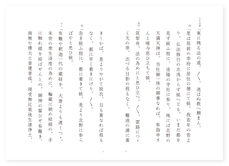 観世弥次郎作 ワキ 太宰府の僧 ツレ 火天 シテ 傅大士 地は 京都 季は 雑 ワキ次第「東に残る法の道。〳〵。迷はぬ教へ頼まん。 詞「是は筑前の宰府に居住の僧にて候。我若年の昔より。仏法修行の志浅からず候へども。いまだ都を見ず候ふ程に。洛陽の寺社に参り。殊には北野の天満天神は。当社御一体の御事なれば。参詣申さんと唯今思ひ立ちて候。 道行「筑紫舟。法の為めにと思ひ立つ。〳〵。雲路につゞく天の原。出づる日影の程もなく。難波の浦に着きしかば。是よりやがて旅衣。日も重なれば程もなく。都に早く着きにけり。〳〵。 詞「急ぎ候ふ程に。都に着きて候。是より北野に参らばやと思ひ候。 サシ「有難や釈迦一代の蔵経を。大唐よりも渡しつゝ。末世の衆生済度の為めに。輪蔵に納め結縁の。手に触れ縁を結ばせんとの。御神の誓ひぞ有難き。南無や傅大士普建普成。現受無比楽後生清浄土。 火天詞「なふ〳〵あれなる御僧。御身は筑前の宰府より来り給ひて候ふか。 ワキ詞「不思議やな都始めて一見の者を。宰府の者とは何とて見知り給ふらん。 火天「あら愚かの仰せやな。其方は知ろしめされずとも。我は朝夕白雲の。迷はぬ法の友人なれば。などかは知らで候ふべき。 ワキ「是は不思議の御事かな。さて〳〵かやうに承る。御身は如何なる人やらん。 火天「今は何をか包むべき。五千余巻の御経を。昼夜に守護し奉る。十二天の其中に。火天是まで来りたり。 ワキ「そも火天とはまのあたり。天部を拝み申す事よと。感涙肝に銘じつゝ。現とも更に弁へず。 火天「此方も御身の貴さに。 ワキ「随喜渇仰。 火天「さま〴〵に。 地「説き置きし。御法の花も色々に。〳〵。教へは多き道ながら。悟りは一つぞ胸の月。曇らじや三界。唯一心の外ならじ。所は北の宮居。北辰は動かず。天満つ星のめぐるなる。輪蔵をひらきて。静かに拝み給へや。 ワキ詞「あら有難の御事や。五千余巻の御経を。一夜に拝ませおはしませ。 火天詞「五千余巻の御経を。一夜に御僧の拝まんとは。おふけなき御事なれどもさりながら。御身父母の胎内を出でしより此方。五戒を乱さず慈悲を起し。仏道修行し給ふ事。 地「其功既に年久し。 火天サシ「然るに此御経に於て。大唐よりも渡されし。 地「傅大士普建普成とて。其身は俗体なりといへども。此三人の如何なれば。彼御経に値遇の縁。深き心の隙もなく。昼夜に経を守護し給ふ。 クセ「其後日本に。渡りし法の舟の内。難波路遥かに漕がれ来し。心筑紫の果よりも。仏法東漸の。都の北の宮寺に。 火天「納め給ひし昔より。 地「今末の世といひながら。類ひ稀なる上人の。結縁の利益仰ぎつゝ。衆生を済渡し給へ。我も姿を改めて。必ずこゝに来りつゝ。行道の利益なさんと。いふかと見えて失せにけり。〳〵。(中入) ワキ「月は隈なき後夜の鐘。声澄み渡る折節に。 地「不思議や異香薫じつゝ。音楽聞え紫雲たなびく絶間より。花降り下るぞあらたなる。いひもあへねば妙経の。〳〵。守護神の御厨子の。扉は忽ち四方へひらけて。傅大士二童子顕はれたり。 シテ「釈迦一代の御法の御箱。 地「釈迦一代の御法の御箱を。彼上人に悉く与へんと。普建普成の二童子に持たせ。上人の御前にさし置き給へば。 シテ「傅大士座を立つて。 地「傅大士座を立つて。竹杖にすがり。膝をかゞめて上人を礼し。彼御経を読誦し給へば。善哉なれや善哉なれと。夜遊を奏して舞ひ給ふ。 地「いづれも妙なる舞の袖。〳〵。月も照り添ふ雲間より。天部の姿は隠れもなく。天降るこそ有難けれ。 火天「そも〳〵是は。釈迦一代の蔵経の守護神。十二天の其内に。火天の姿を顕はすなり。 地「火天忽ち天降り。〳〵。程なく目前に顕れ出でゝ。上人に向ひ。即ち結縁の行道の利益。めぐらし給へと。各立ち寄り上人を誘なひ。輪蔵に御手をかけまくも。かたじけなしと互におしめぐり。めぐりめぐるや日月の光り。曇らぬ御法のあらたさよ。 火天「是はこれ妙経の守護神なれば。 地「是はこれ妙経の守護神なれば。夜の間に転経の儀式を顕はし。上人悉く披見の其後。各御箱をとり〴〵に。遥の神前に運び給ふ。傅大士伴なひ神前に積み置き。いよ〳〵当社当寺の仏法。繁昌の霊地を崇め給へと。上人に教へ。天部は雲井に上らせ給へば。七宝荘厳の瑠璃の座の上に。傅大士二人の童子を伴なひ。〳〵。帰り給ふぞ有難き。 底本:国立国会図書館デジタルコレクション『謡曲評釈 第二輯』大和田建樹 著