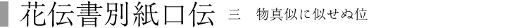 物真似の花は、先づ物真似を完成し得て、然る後に面白き所を嗜む事によつて咲くといふのがその一つである。物真似の完成といふのは、所謂「似せぬ位」である。「似せぬ位」といふのは、似せようとする努力、似せようとする意識等を通過し得た境地である。平易にいへば、扮する者そのものに真に成りきつてしまひ得た境地である。老人の物真似ならば、真の老人らしくなり切り得た境である。これは努力と鍛錬工夫でこの境地に入り得るのである。似せよう似せようと努力して居る間は、まだ真にその物に成り切れてゐない。似せようといふ意識を要しない境地に到つて、はじめて真に似せ得られたのである。その境地に達し得て、今度は面白く珍らしくと努力すれば、物真似の花が立派に咲くわけである。