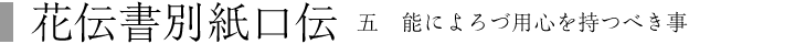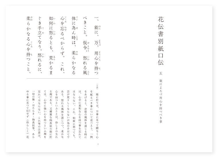 〔評〕 此の段も、花を咲かせる為の一つの方法として、身と心の持ちやうに関する秘事をつたへようとしてゐる。普通であれば、忿怒の物真似を演じる時には、身も心も共に忿怒の様相にならねばならぬものの如くに考へ易い。殊に、「演者は先づ扮する人物の精神状態になり切つて、その精神で演伎しなければならない」などといふ近代的な演出論に於ては、怒れる物真似ならば、演者も心に忿怒を感じてせよといふ教となつてゐる。然るに、世阿弥は、それと全く反対の立場にゐる。忿怒の物真似を演じても、心の中には柔和な心を持つ事を忘れるなといふのである。そして、これは、「如何に怒るとも、荒かるまじき」手段であると説き、更に進んでは、ここに珍らしさの生れる理由が存し、花の咲く理が存するとまで断言してゐる。これなど、世阿弥の精神には、後世の所謂「腹芸」などといふ考方より以上のものが存したことを、有力に物語るものであらうと思ふ。幽玄の物真似に、強き心を持つといふのも、同様の理由である。如何に柔和に演じても、決して「弱き能」にならないが為の用心である。次に身を使ふ際の用心として、身を強く動す時には足踏をゆるくするとか、足踏を強くふむ時には身を静かに持つなどといふのも、其の根本理由は同様で、強く演じても荒くならない為の用心であり、延いては、花を咲かせんが為の心づかひである。