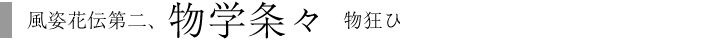 第二には物狂能を二種類に分つて、憑き物によつて狂ふ能と、物思故に狂ふ能の二つとし、第一の方を「憑物の体を学べば、易く便あるべし」といひ、次のを、重大視して、「物思ふ気色を本意にあて、狂ふ所を花にあてる」といふ公案を提示して居る所は注意すべきで、物狂演出の骨髄を説いた所と見るべきだと思ふ。